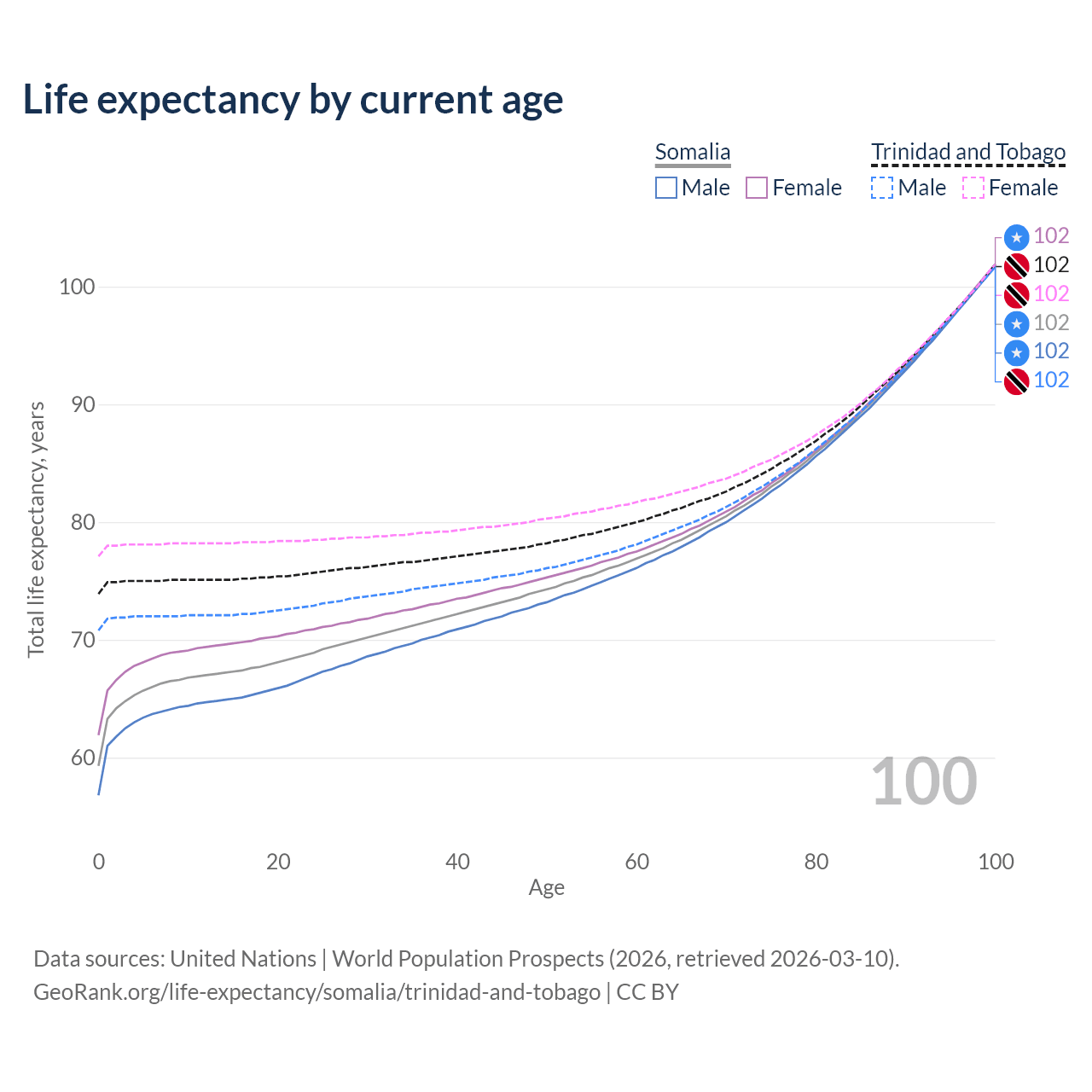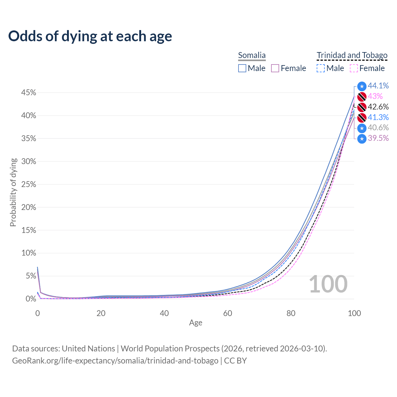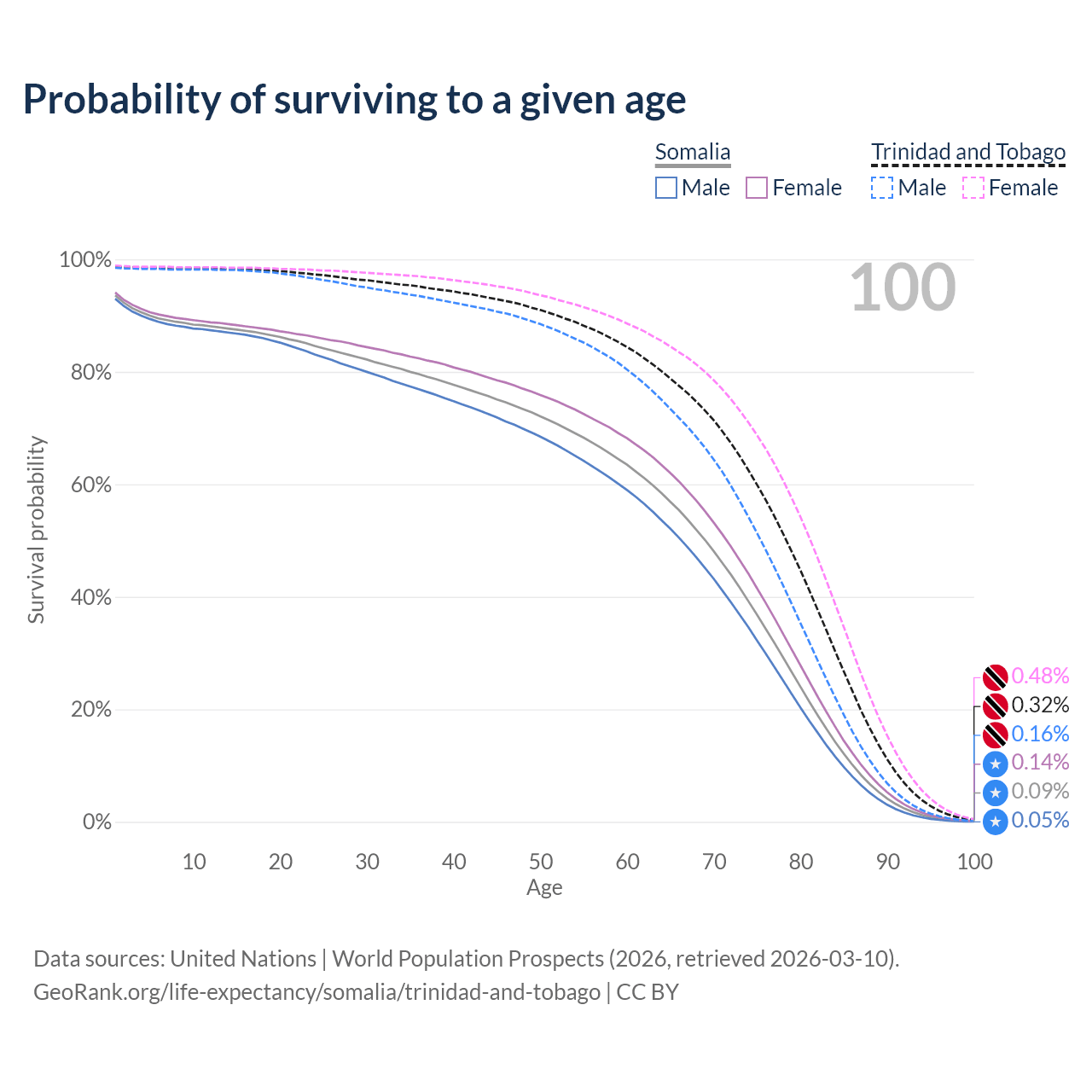 This life expectancy calculator shows the odds of living to 100, 95, 90, and below based on current age for both males and females in Somalia and Trinidad and Tobago, along with mean and median age of death. The calculations are based on the 2026 life tables (actuarial tables) from the UN World Population Prospects.