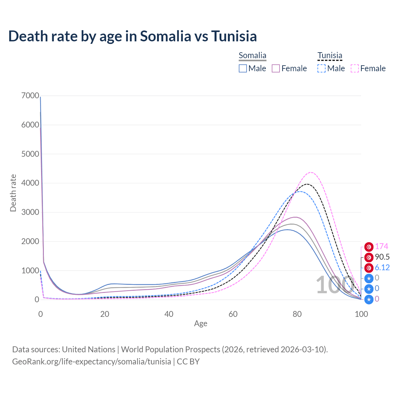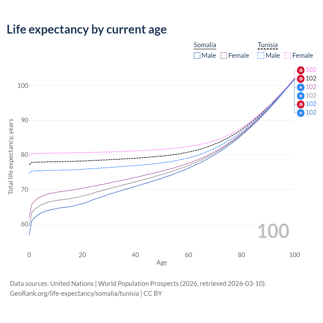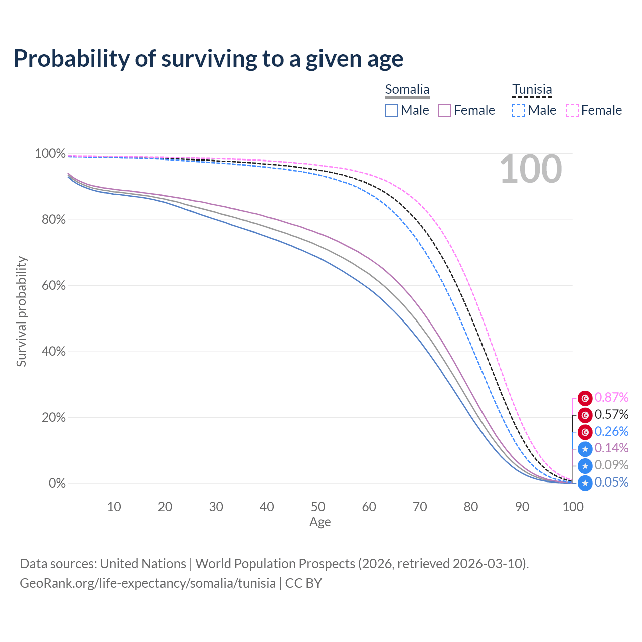 This life expectancy calculator shows the odds of living to 100, 95, 90, and below based on current age for both males and females in Somalia and Tunisia, along with mean and median age of death. The calculations are based on the 2026 life tables (actuarial tables) from the UN World Population Prospects.