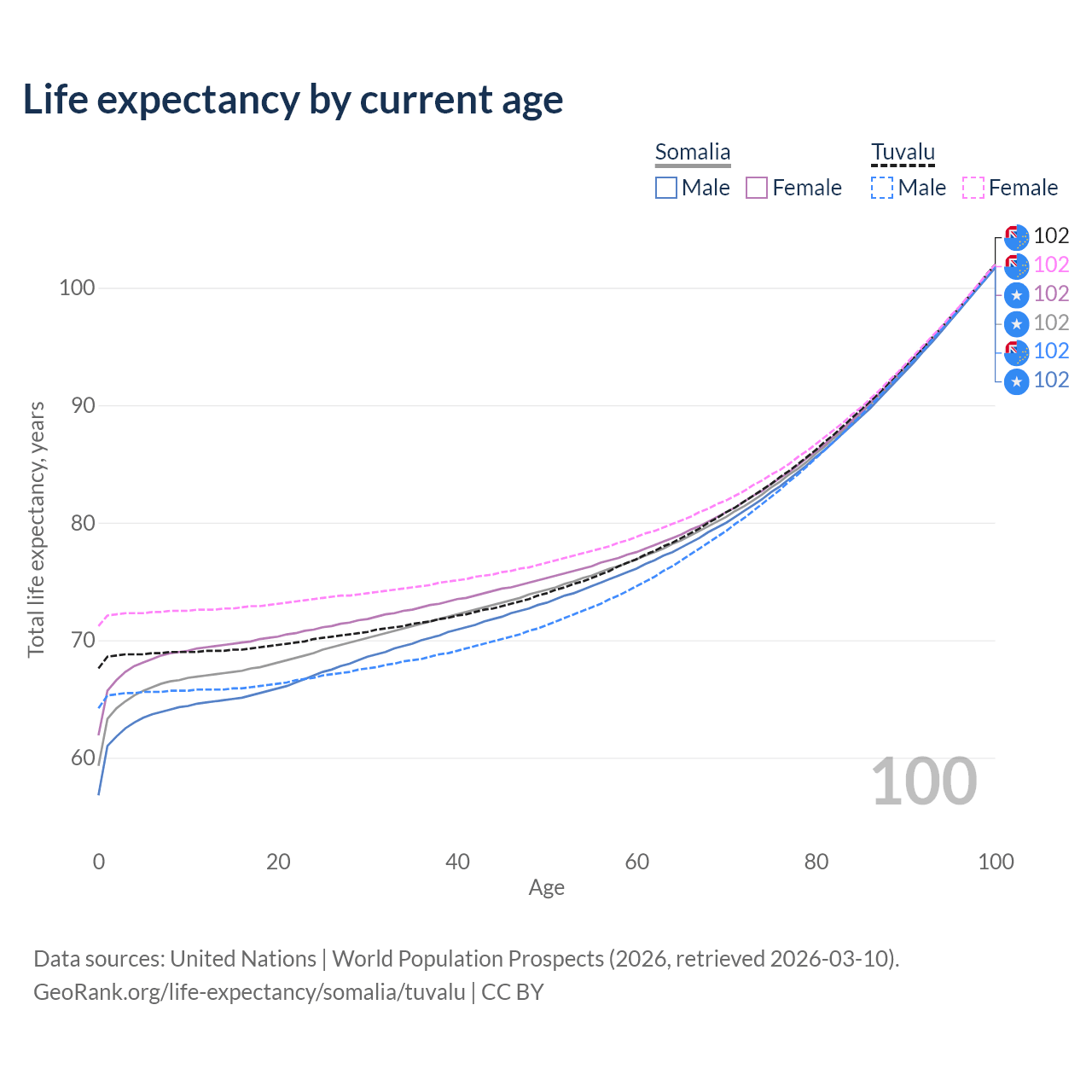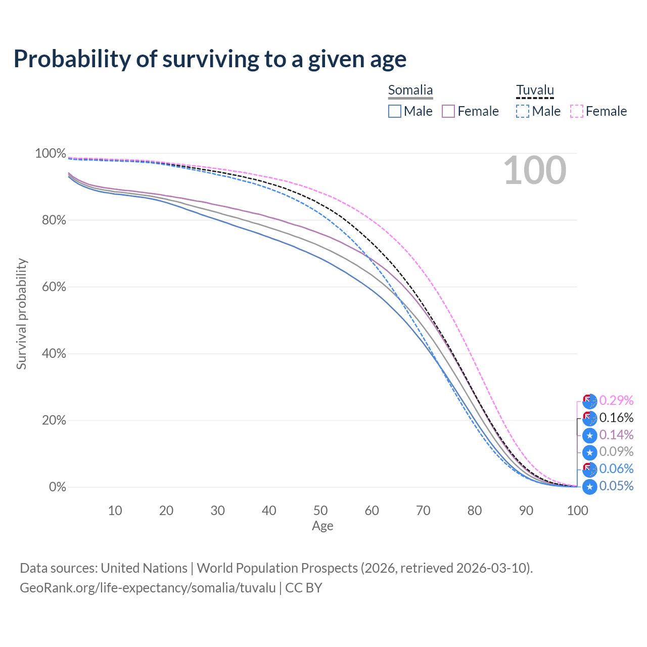 This life expectancy calculator shows the odds of living to 100, 95, 90, and below based on current age for both males and females in Somalia and Tuvalu, along with mean and median age of death. The calculations are based on the 2026 life tables (actuarial tables) from the UN World Population Prospects.
