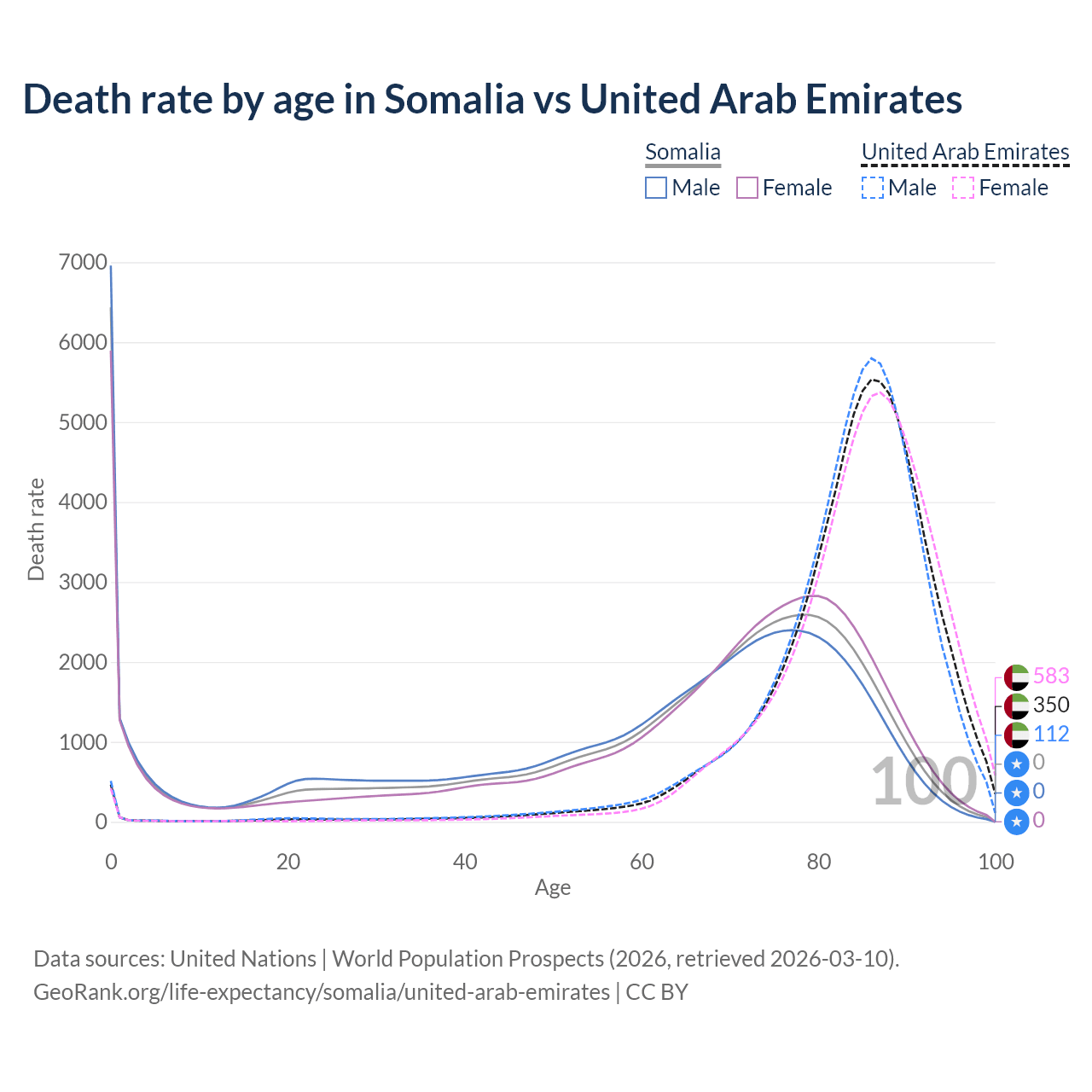 In Somalia, the most common age of death is 0, compared to 86 in the United Arab Emirates. The median age of death is 69 in Somalia and 85.6 in the United Arab Emirates, meaning only half of each cohort is expected to live past that age.