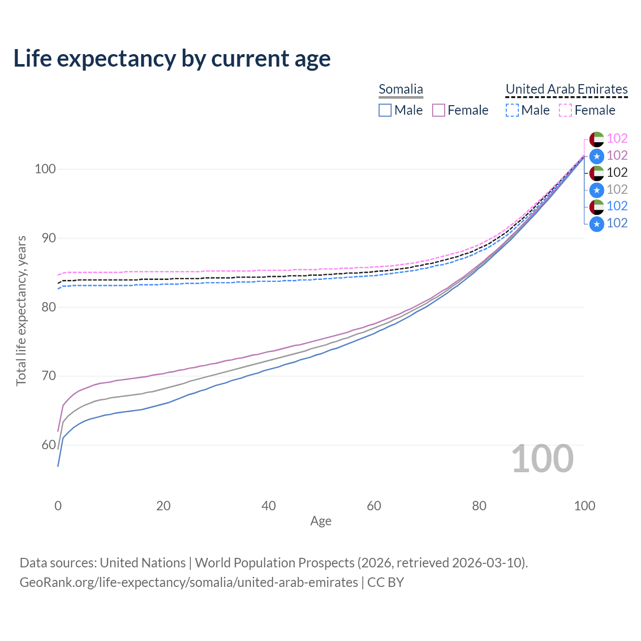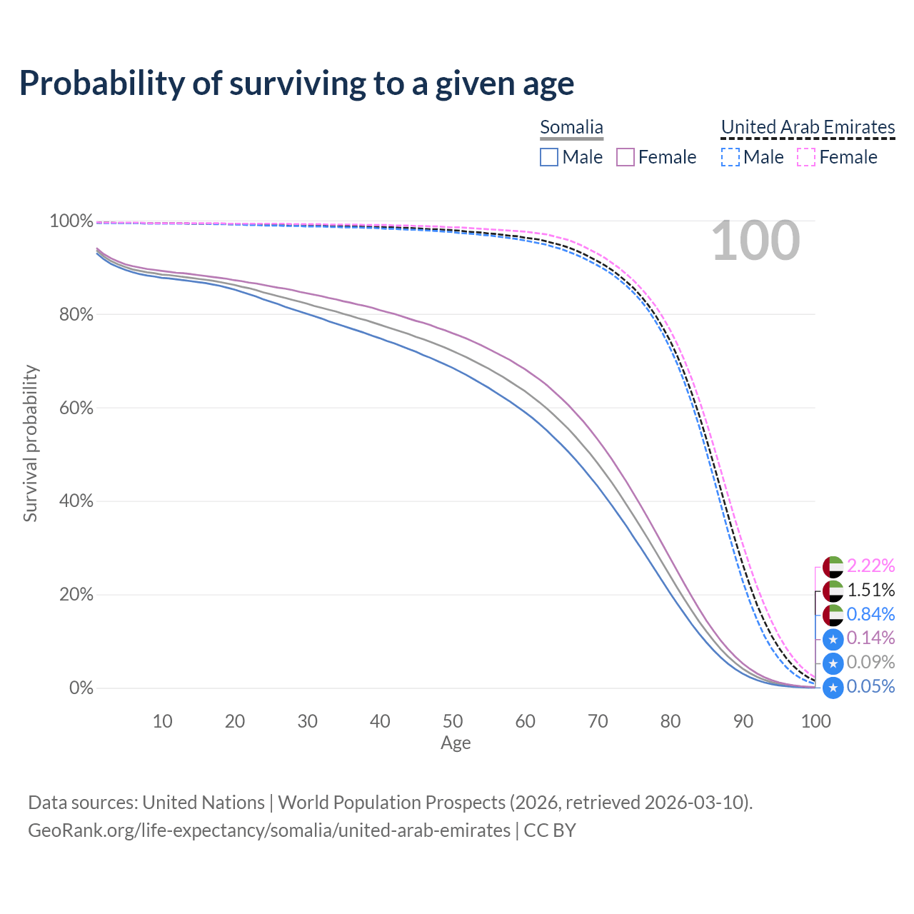 This life expectancy calculator shows the odds of living to 100, 95, 90, and below based on current age for both males and females in Somalia and the United Arab Emirates, along with mean and median age of death. The calculations are based on the 2026 life tables (actuarial tables) from the UN World Population Prospects.