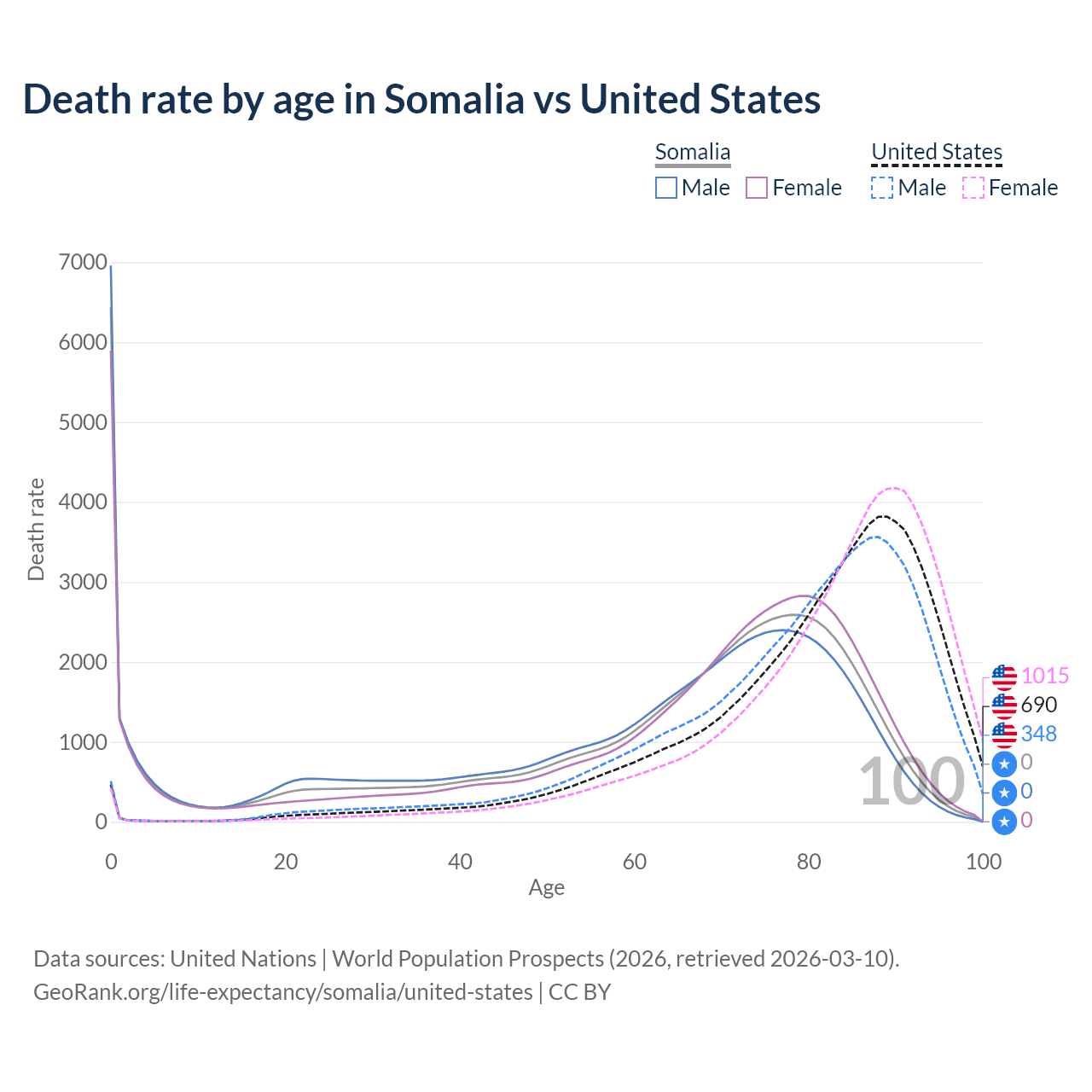 In Somalia, the most common age of death is 0, compared to 89 in the United States. The median age of death is 69 in Somalia and 83.9 in the United States, meaning only half of each cohort is expected to live past that age.