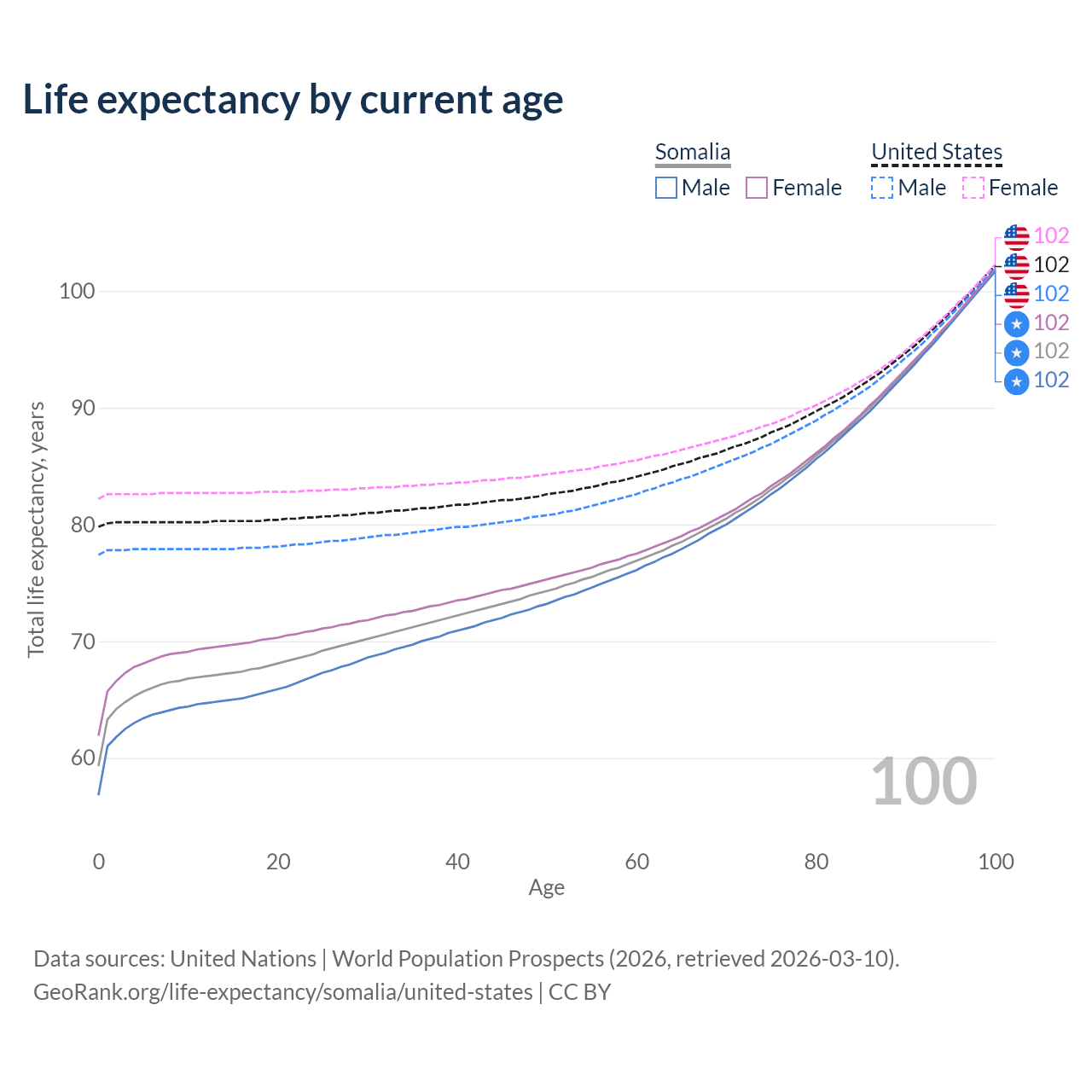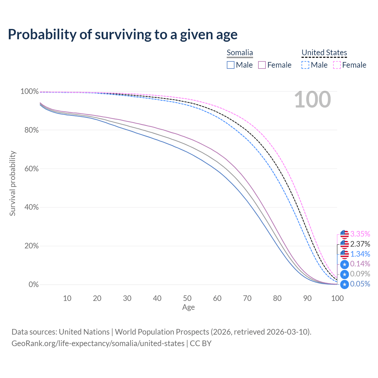 This life expectancy calculator shows the odds of living to 100, 95, 90, and below based on current age for both males and females in Somalia and the United States, along with mean and median age of death. The calculations are based on the 2026 life tables (actuarial tables) from the UN World Population Prospects.