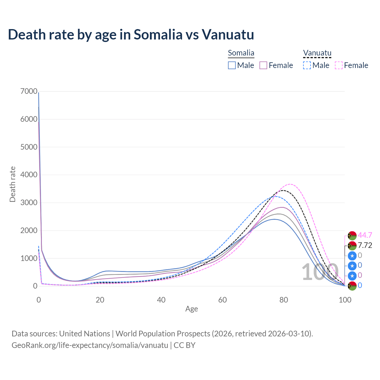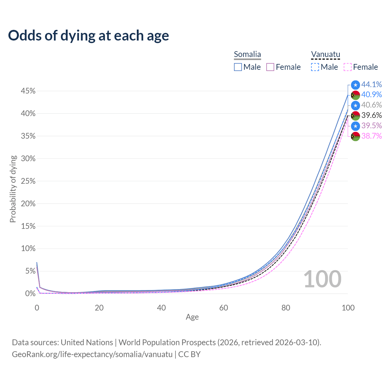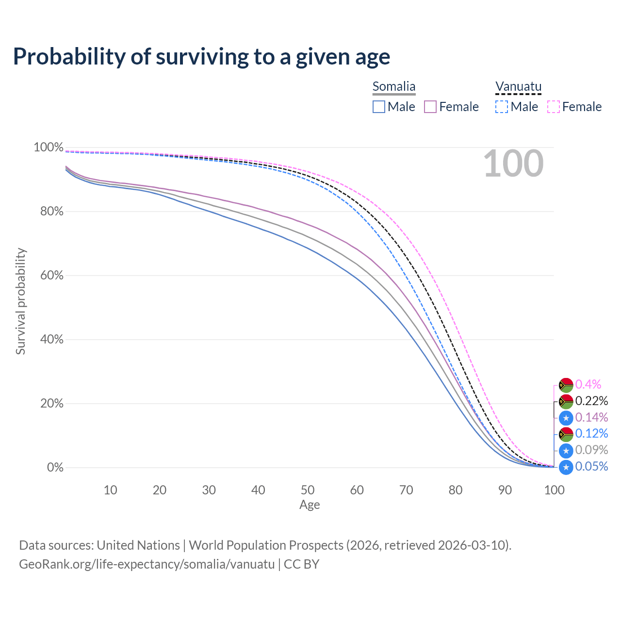 This life expectancy calculator shows the odds of living to 100, 95, 90, and below based on current age for both males and females in Somalia and Vanuatu, along with mean and median age of death. The calculations are based on the 2026 life tables (actuarial tables) from the UN World Population Prospects.