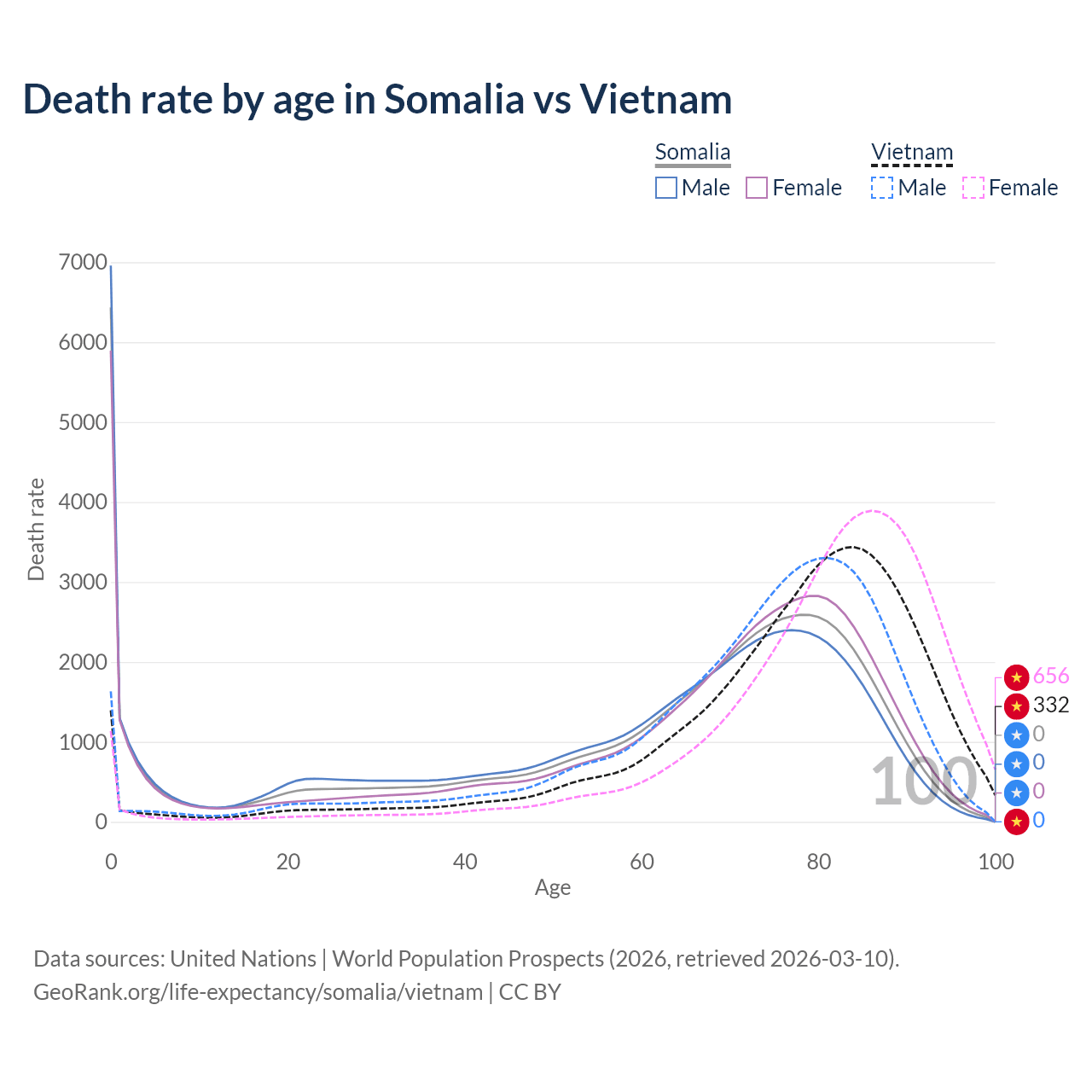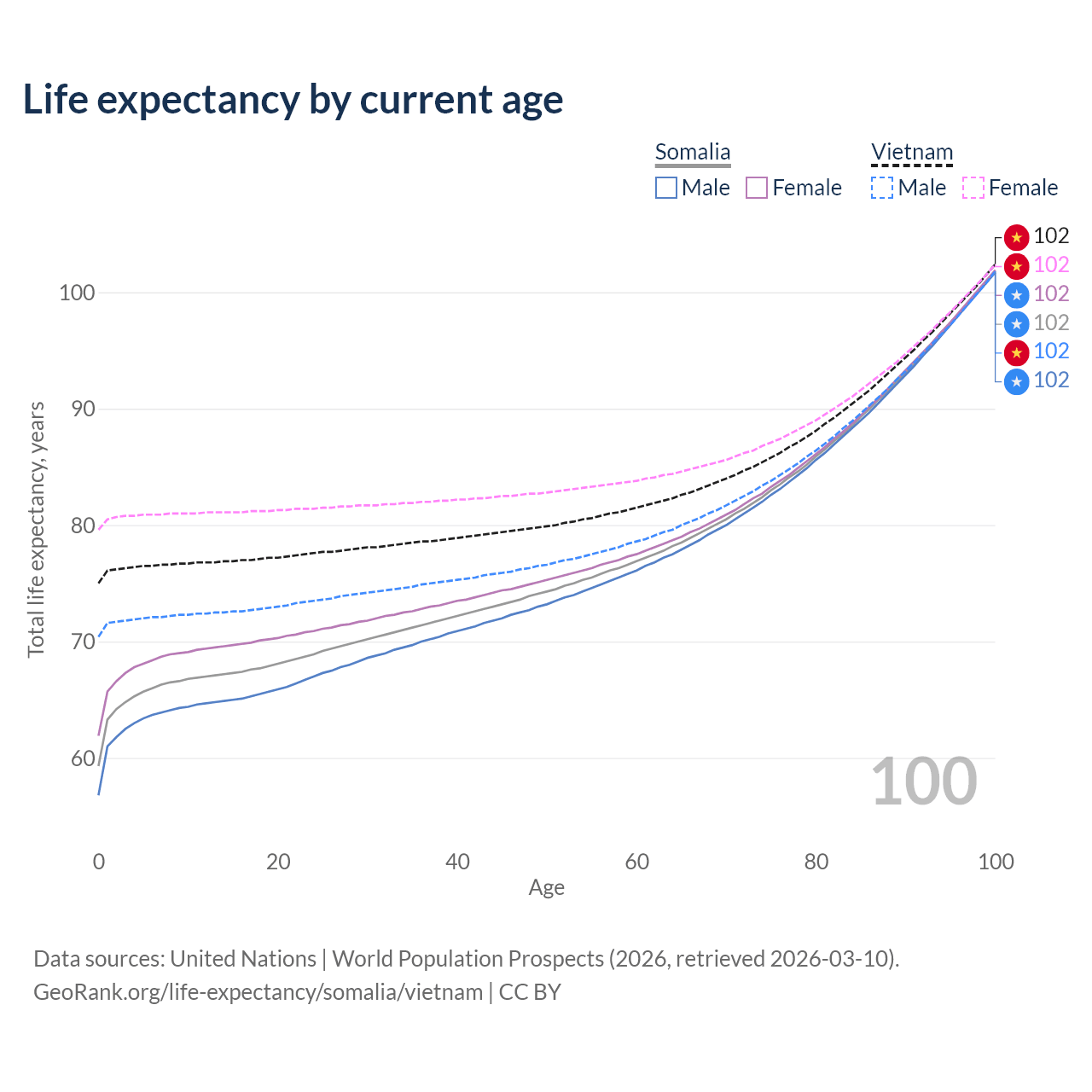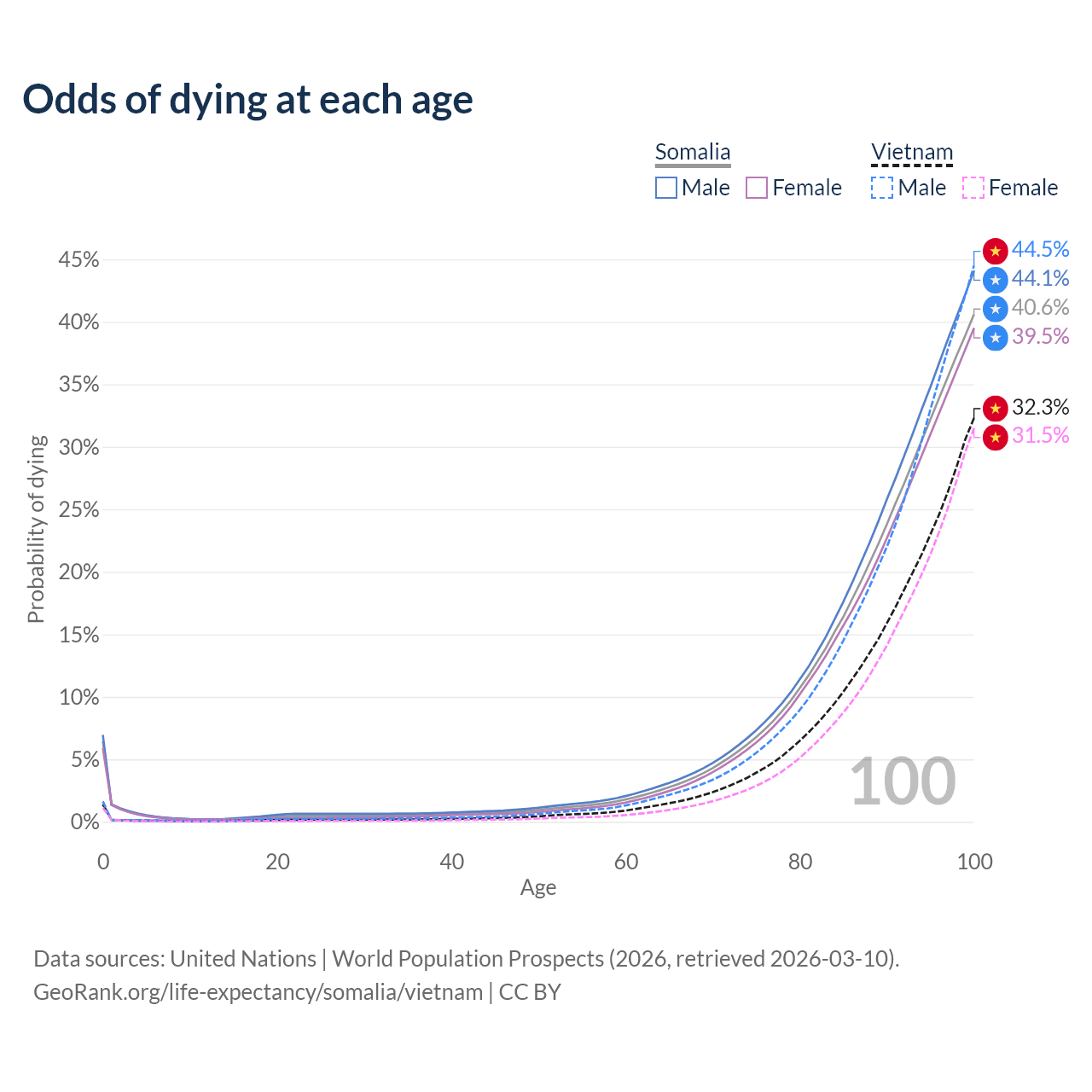 This life expectancy calculator shows the odds of living to 100, 95, 90, and below based on current age for both males and females in Somalia and Vietnam, along with mean and median age of death. The calculations are based on the 2026 life tables (actuarial tables) from the UN World Population Prospects.