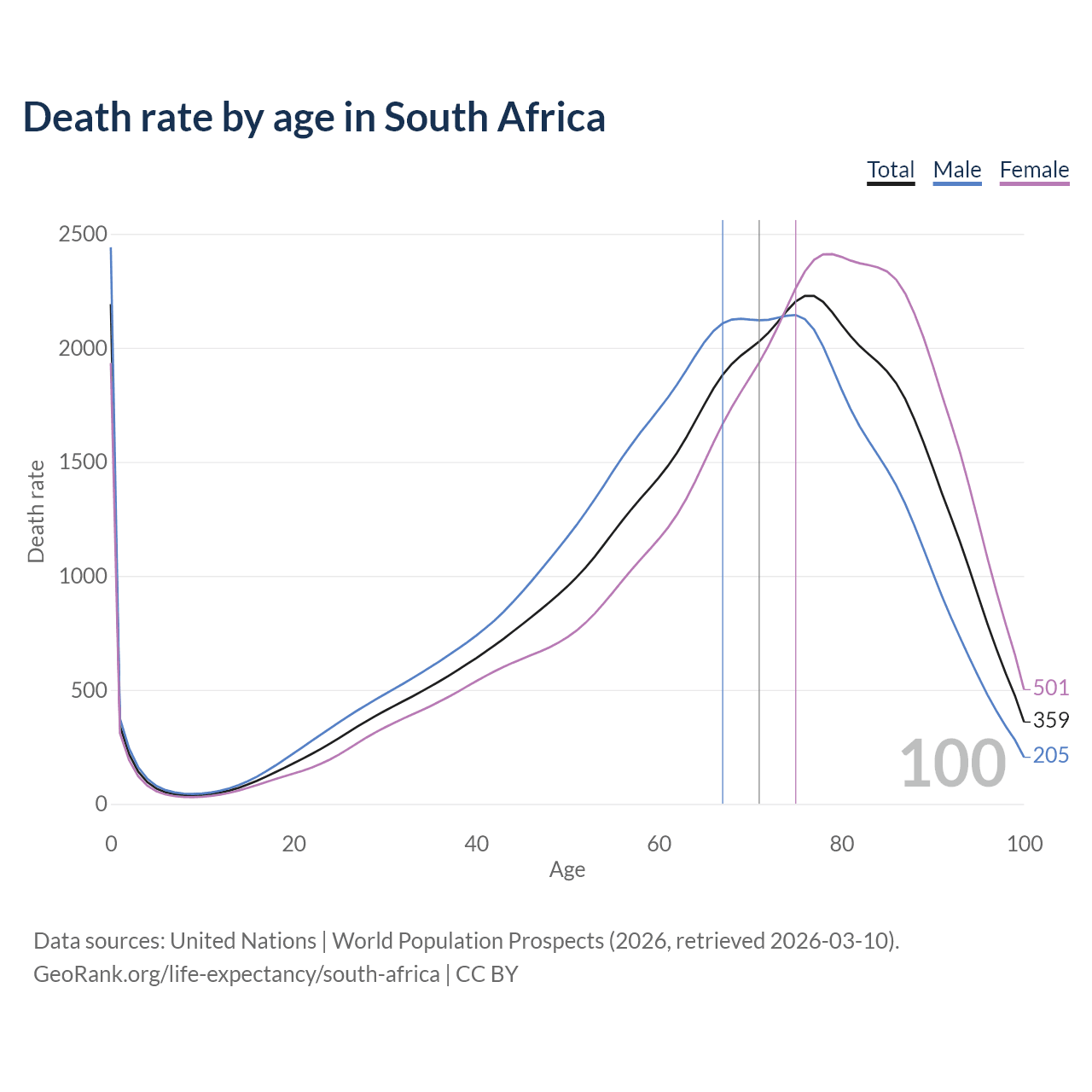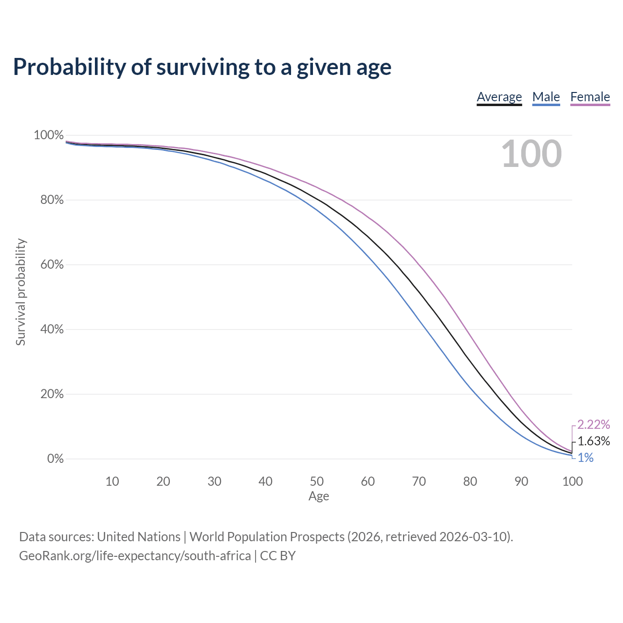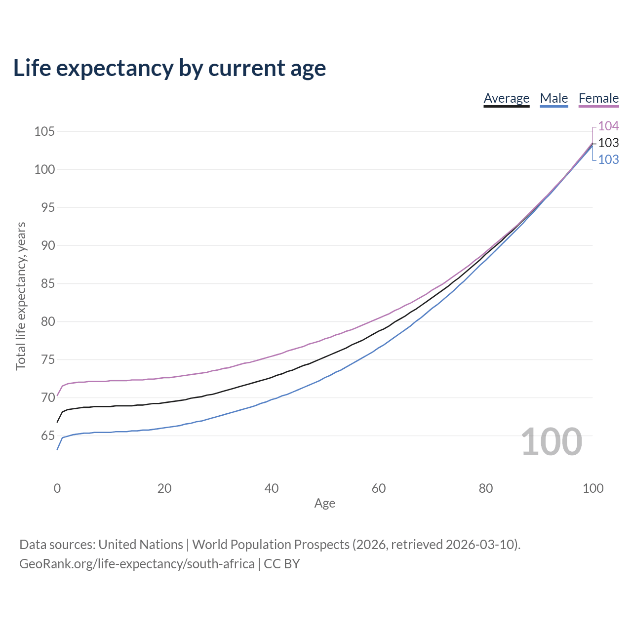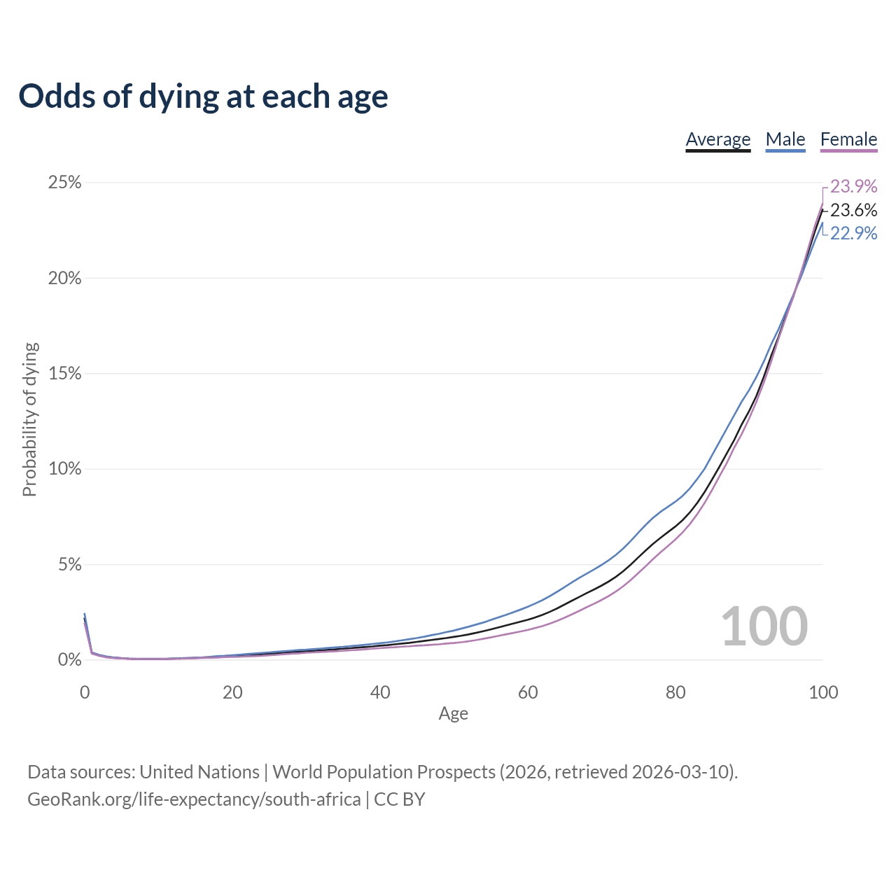 This life expectancy calculator shows the odds of living to 100, 95, 90, and below based on current age for both males and females in South Africa, along with mean and median age of death. The calculations are based on the 2026 life tables (actuarial tables) from the UN World Population Prospects.