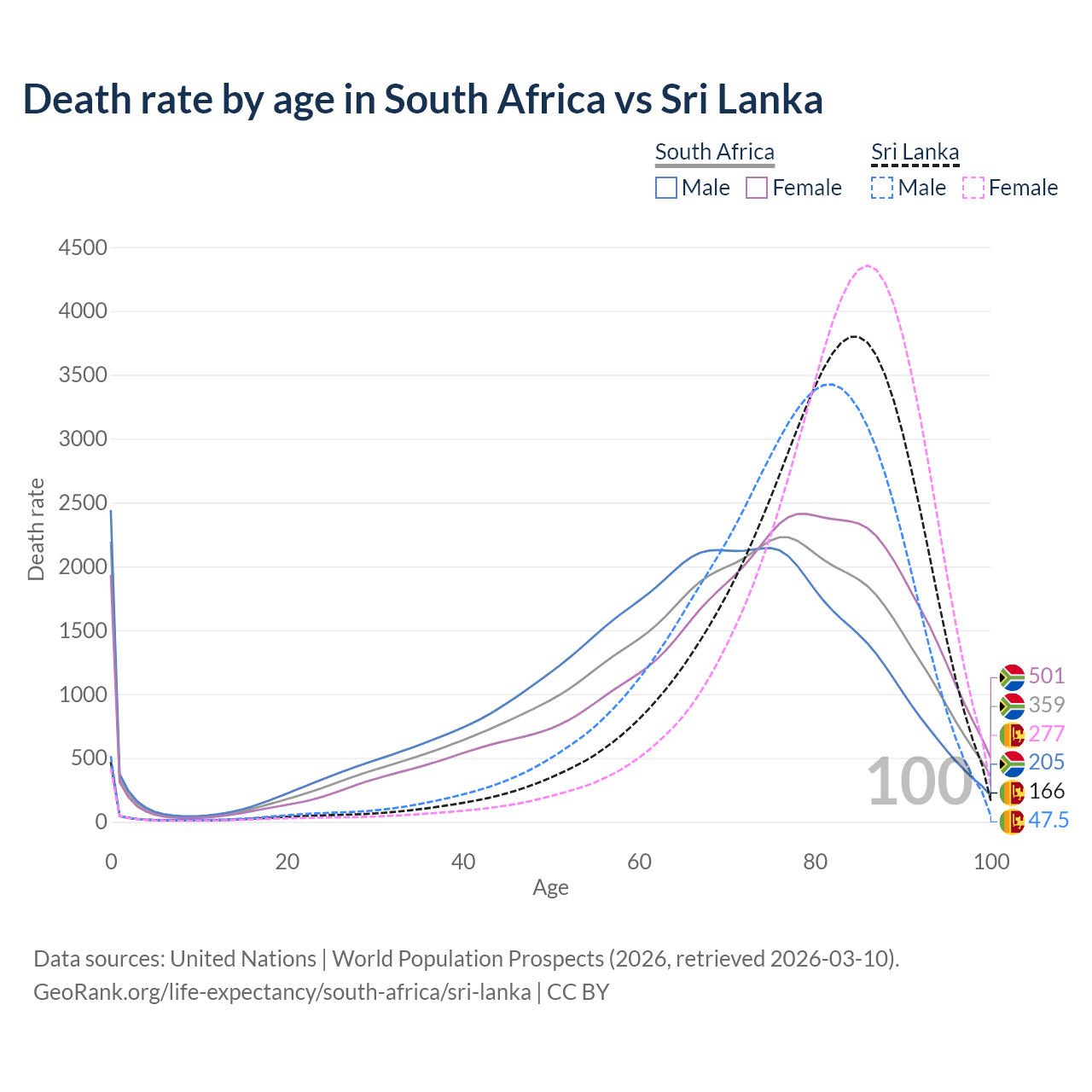 In South Africa, the most common age of death is 77, compared to 85 in Sri Lanka. The median age of death is 70.8 in South Africa and 81 in Sri Lanka, meaning only half of each cohort is expected to live past that age.