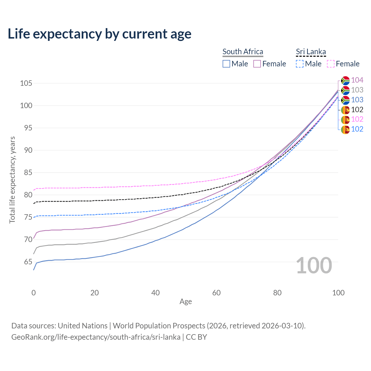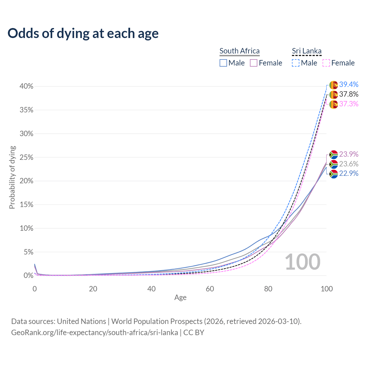 This life expectancy calculator shows the odds of living to 100, 95, 90, and below based on current age for both males and females in South Africa and Sri Lanka, along with mean and median age of death. The calculations are based on the 2026 life tables (actuarial tables) from the UN World Population Prospects.