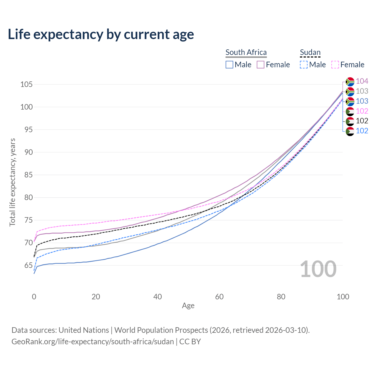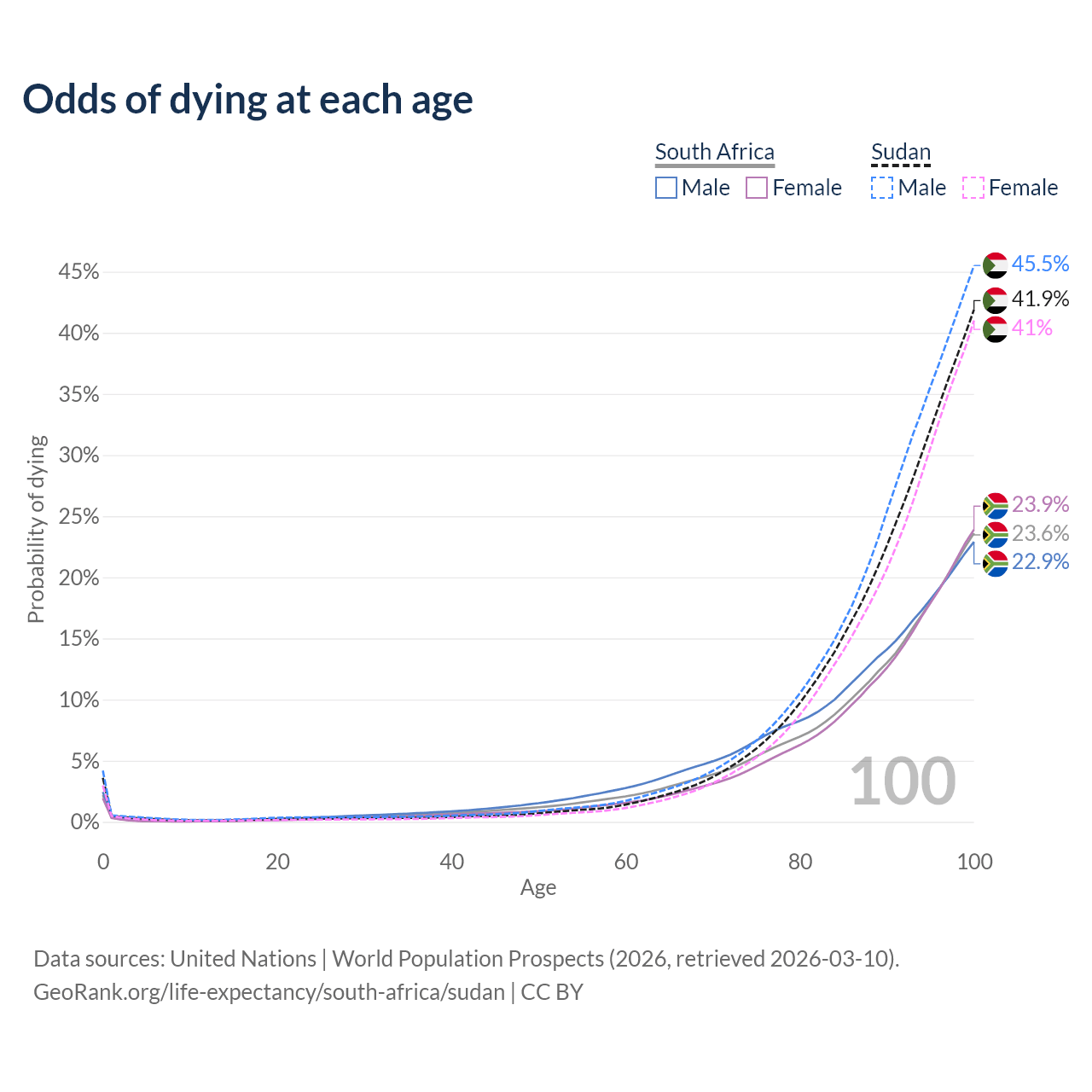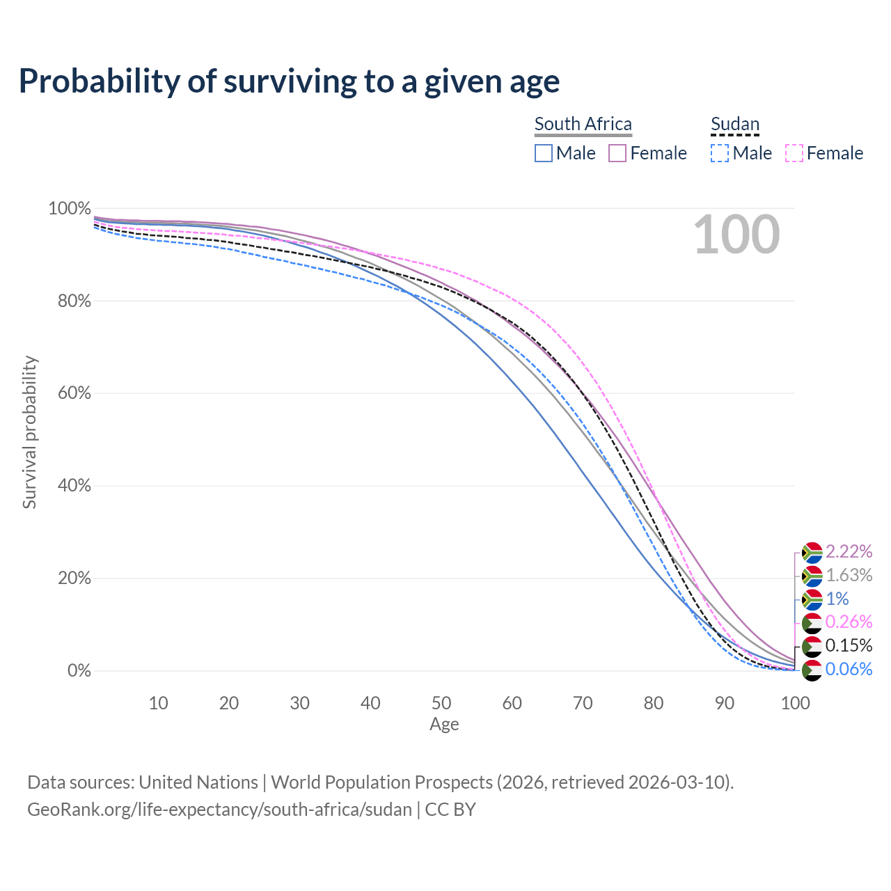 This life expectancy calculator shows the odds of living to 100, 95, 90, and below based on current age for both males and females in South Africa and Sudan, along with mean and median age of death. The calculations are based on the 2026 life tables (actuarial tables) from the UN World Population Prospects.