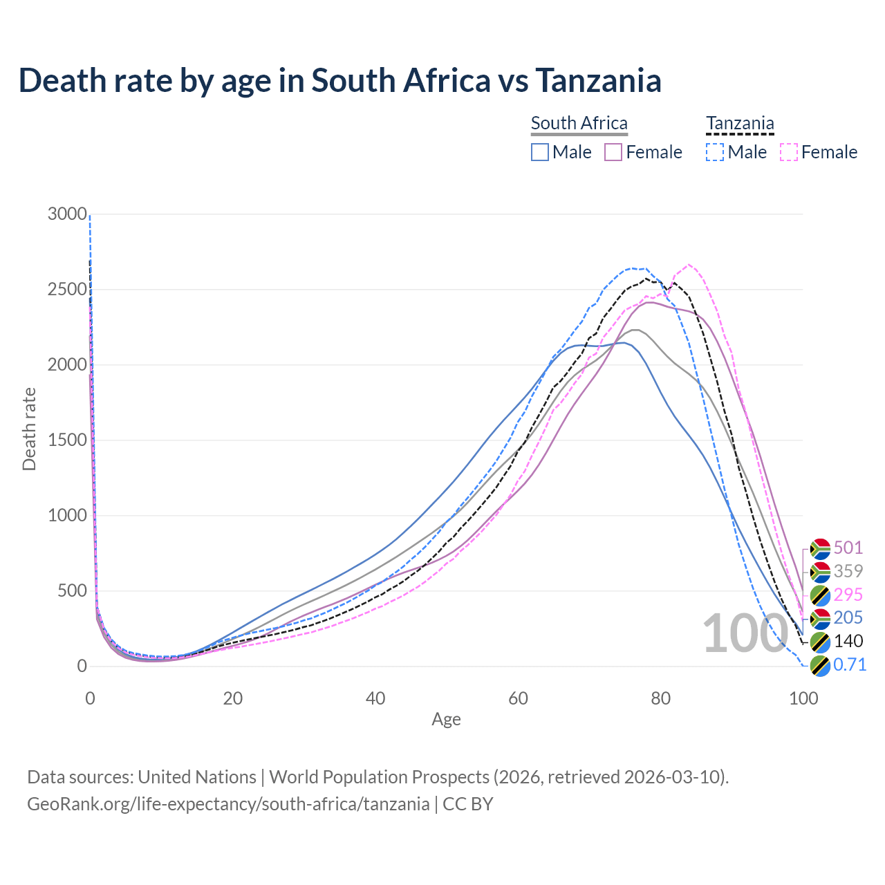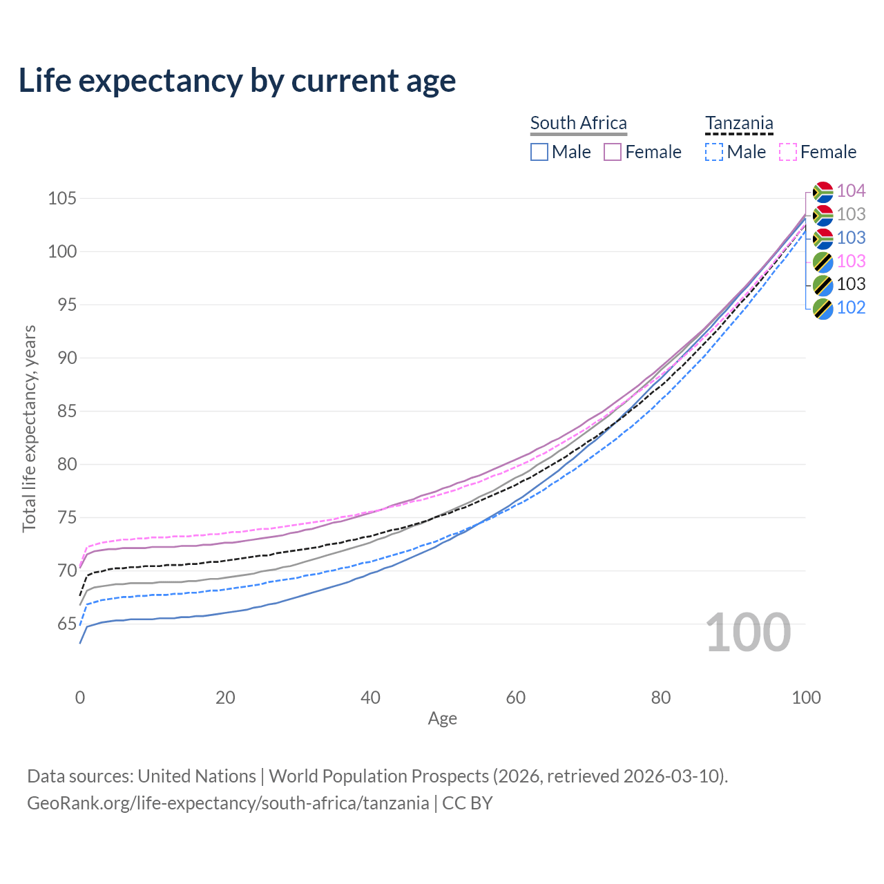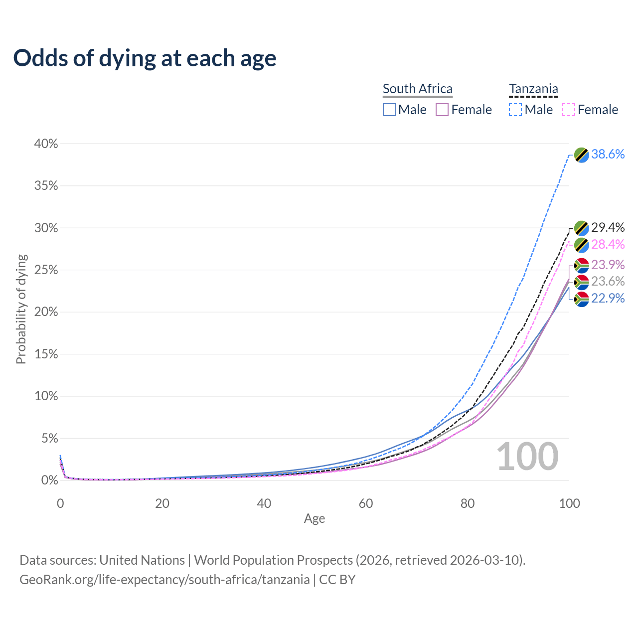 This life expectancy calculator shows the odds of living to 100, 95, 90, and below based on current age for both males and females in South Africa and Tanzania, along with mean and median age of death. The calculations are based on the 2026 life tables (actuarial tables) from the UN World Population Prospects.