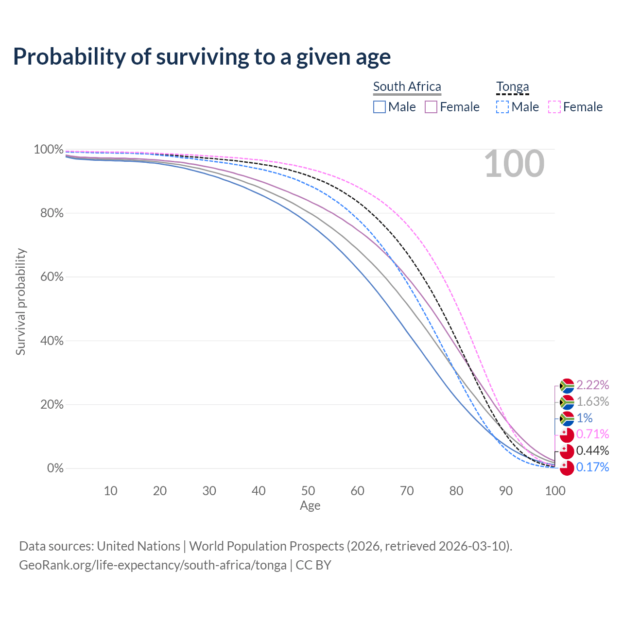 This life expectancy calculator shows the odds of living to 100, 95, 90, and below based on current age for both males and females in South Africa and Tonga, along with mean and median age of death. The calculations are based on the 2026 life tables (actuarial tables) from the UN World Population Prospects.