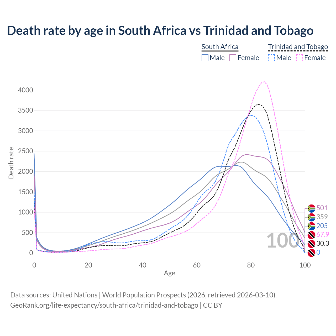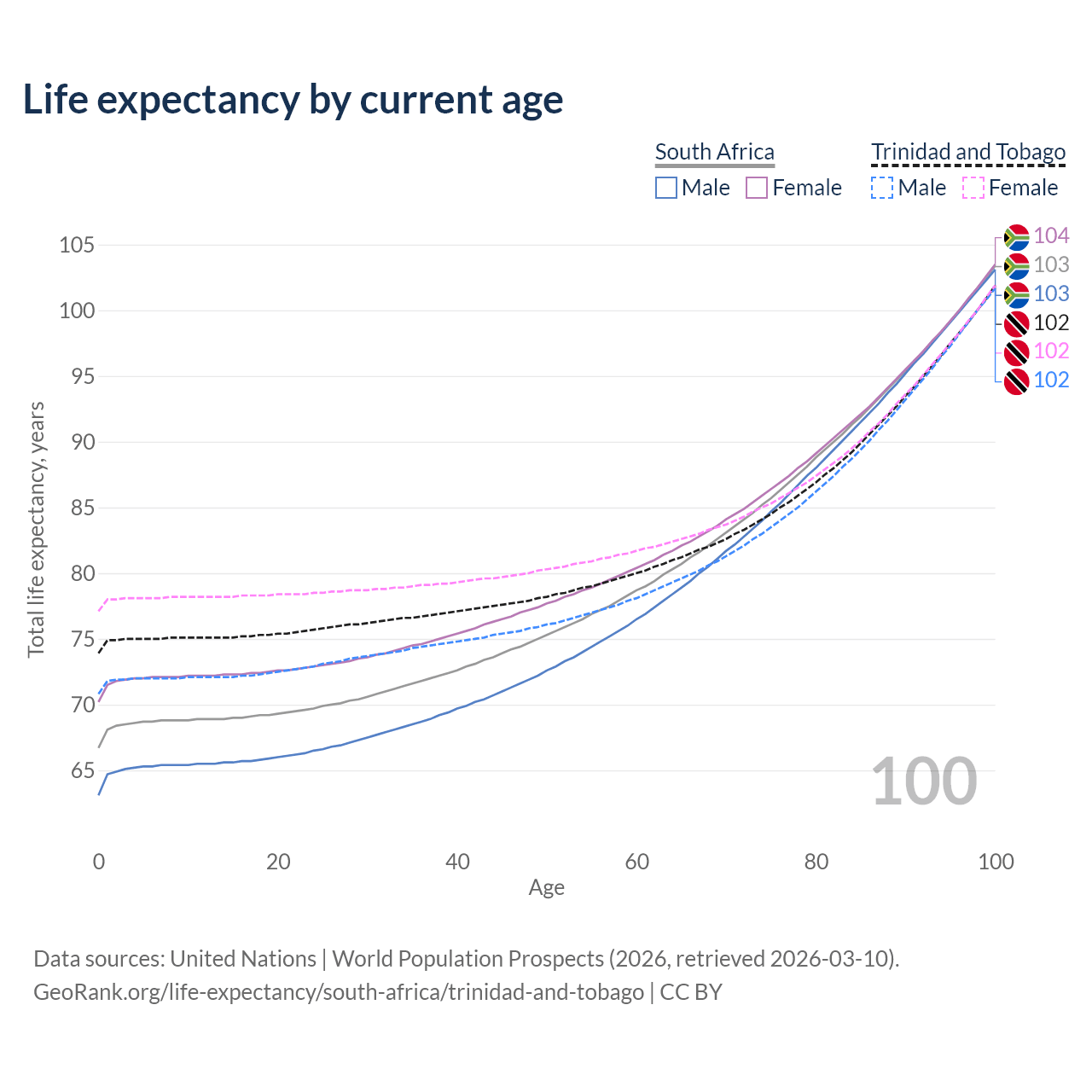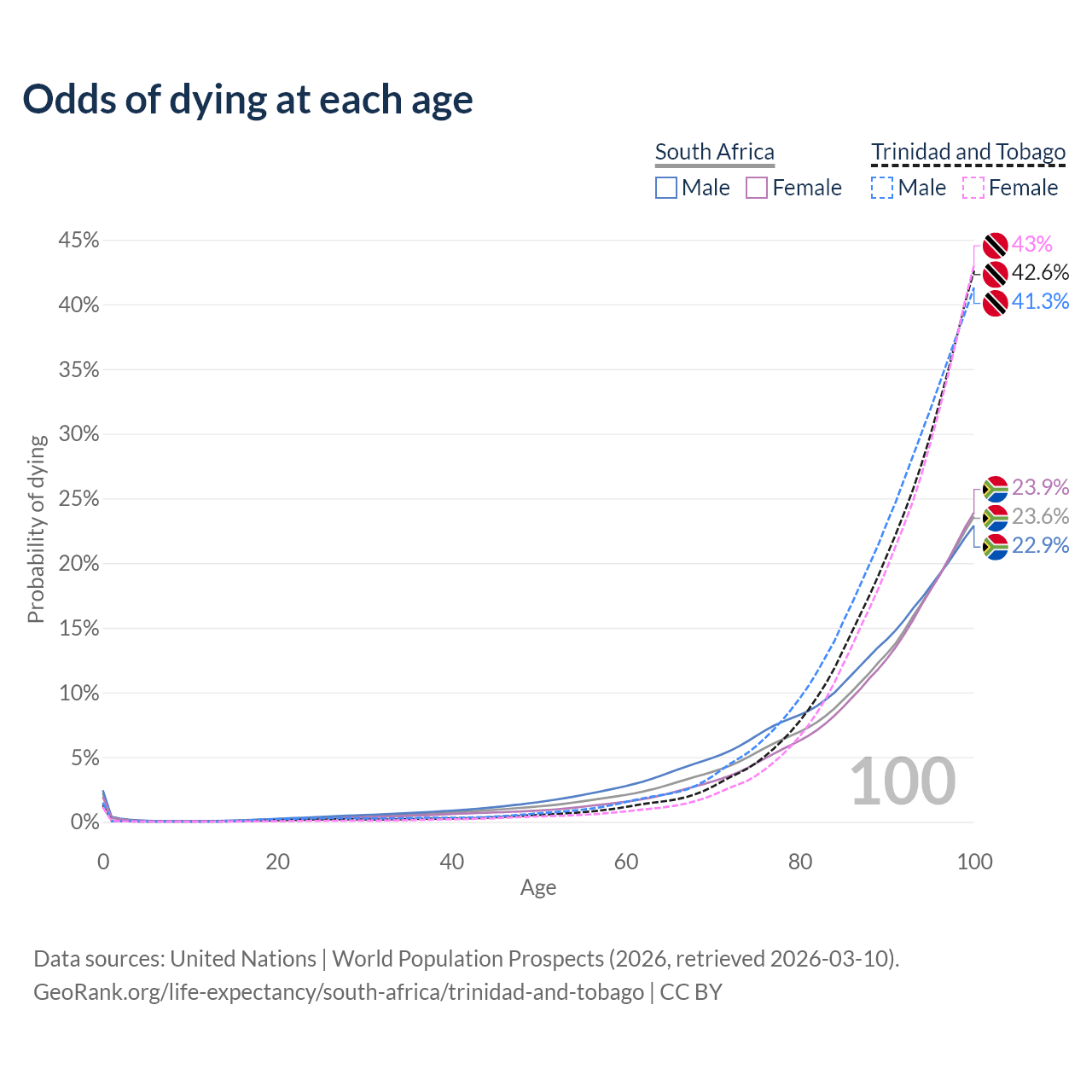 This life expectancy calculator shows the odds of living to 100, 95, 90, and below based on current age for both males and females in South Africa and Trinidad and Tobago, along with mean and median age of death. The calculations are based on the 2026 life tables (actuarial tables) from the UN World Population Prospects.