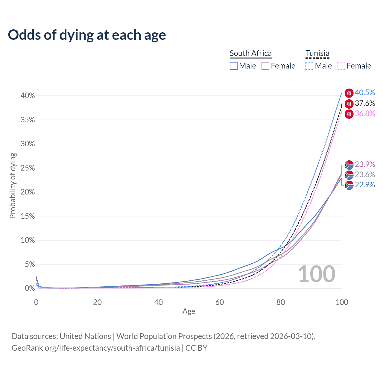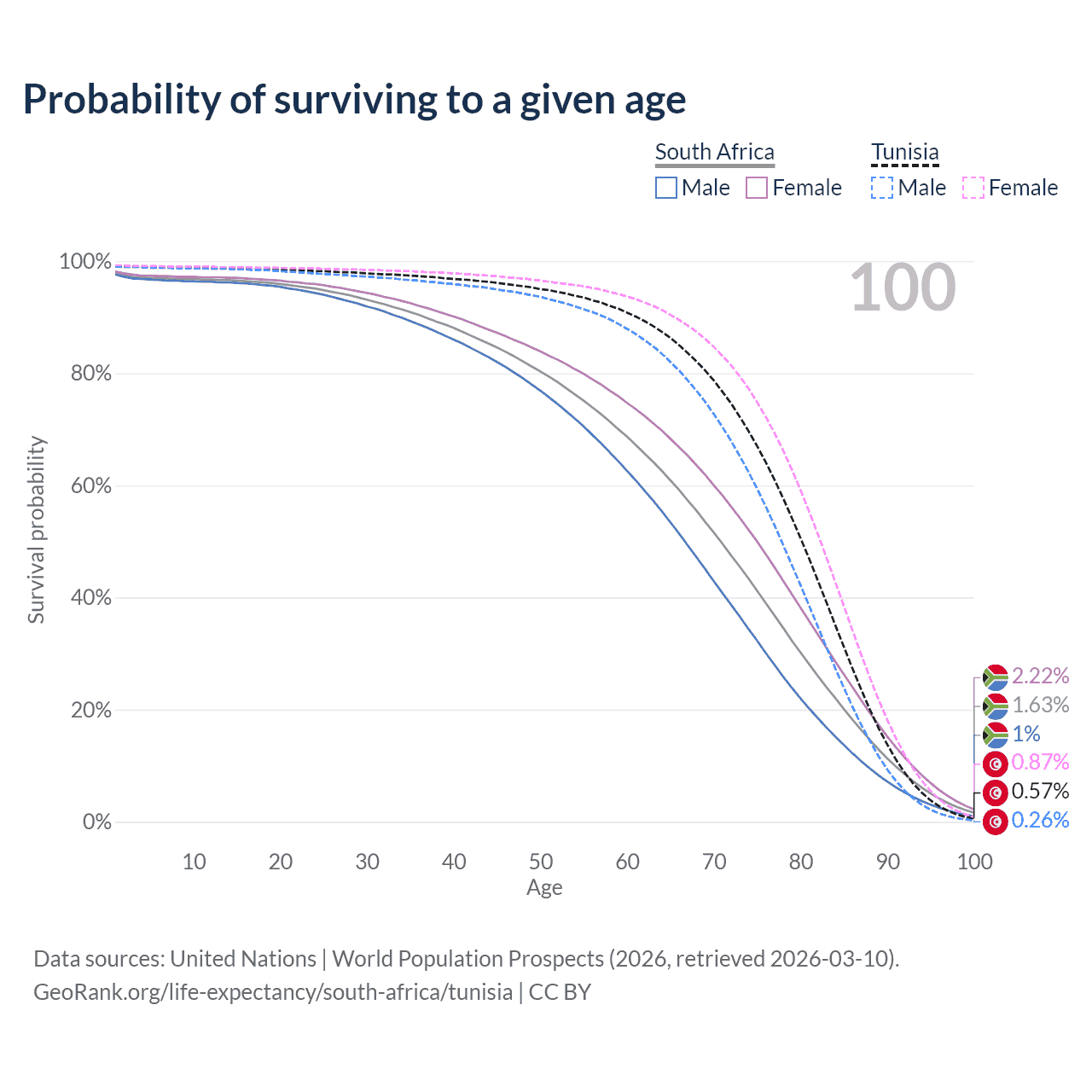 This life expectancy calculator shows the odds of living to 100, 95, 90, and below based on current age for both males and females in South Africa and Tunisia, along with mean and median age of death. The calculations are based on the 2026 life tables (actuarial tables) from the UN World Population Prospects.