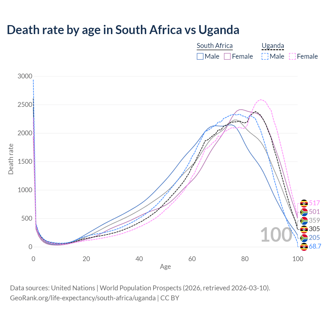 In South Africa, the most common age of death is 77, compared to 0 in Uganda. The median age of death is 70.8 in South Africa and 73.3 in Uganda, meaning only half of each cohort is expected to live past that age.