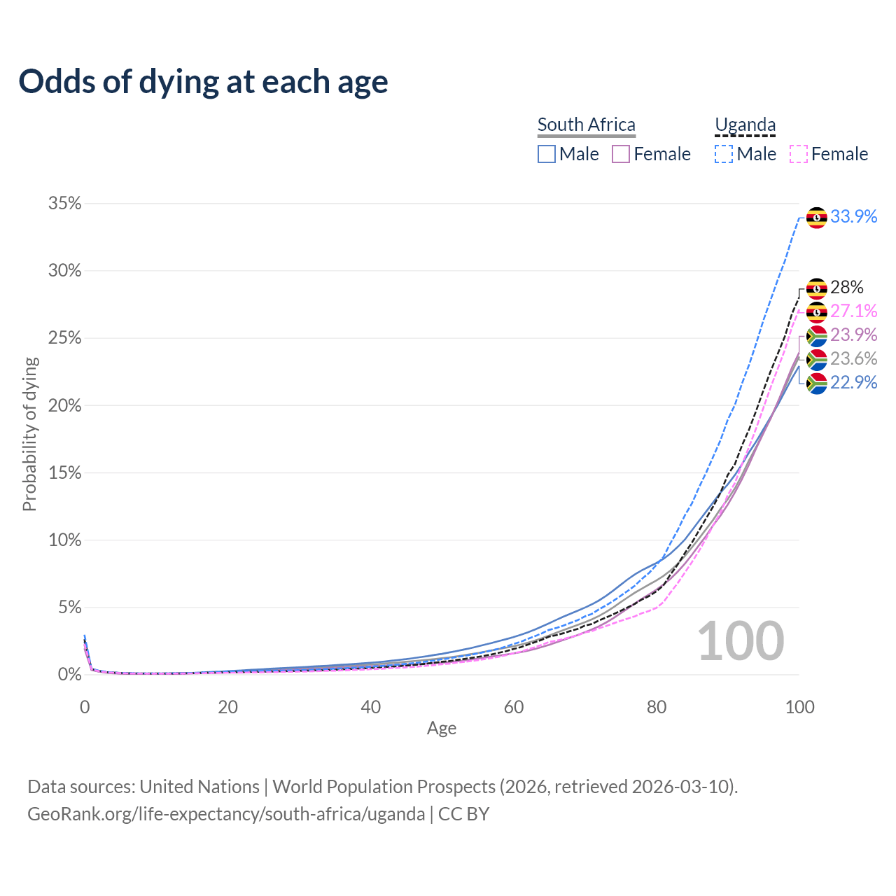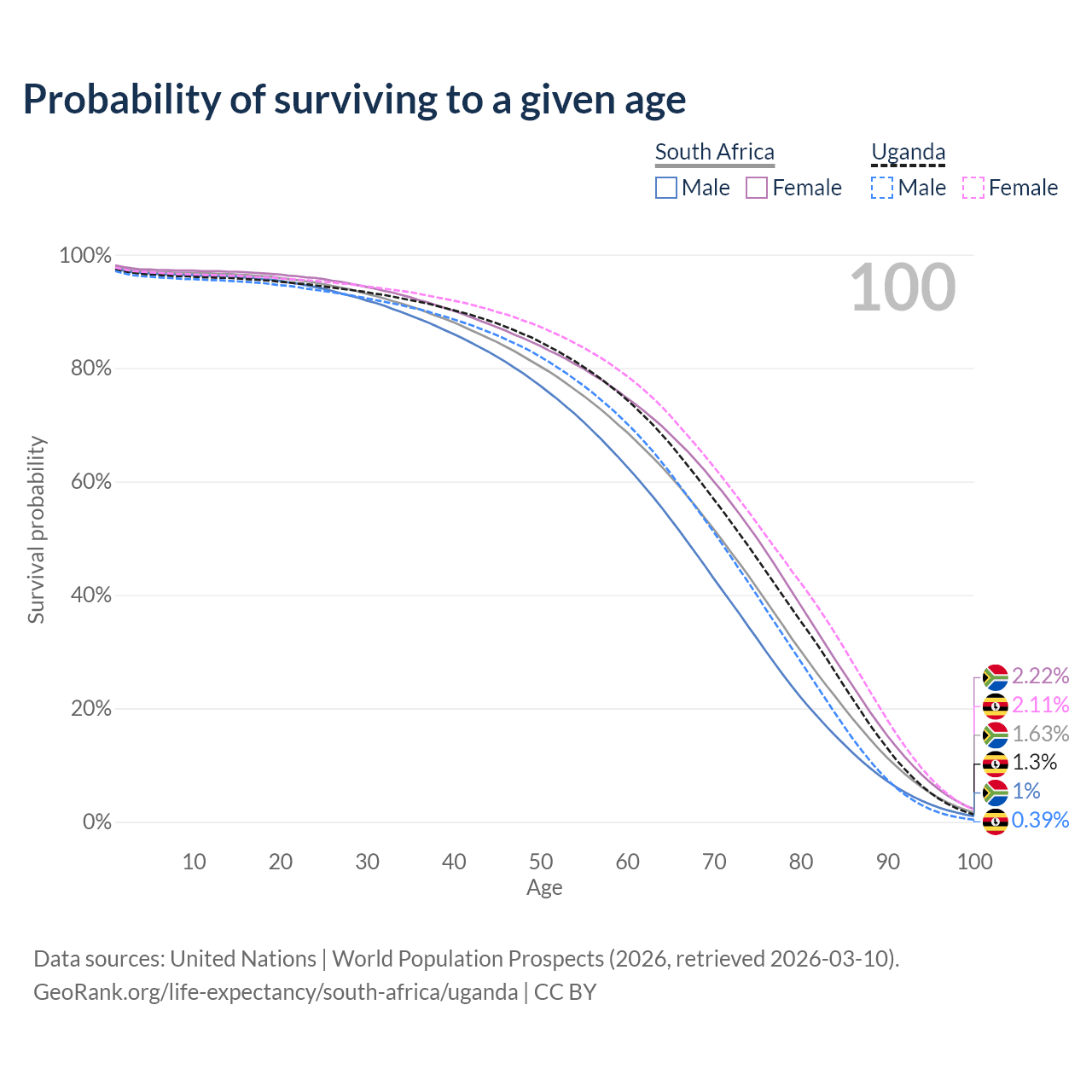 This life expectancy calculator shows the odds of living to 100, 95, 90, and below based on current age for both males and females in South Africa and Uganda, along with mean and median age of death. The calculations are based on the 2026 life tables (actuarial tables) from the UN World Population Prospects.