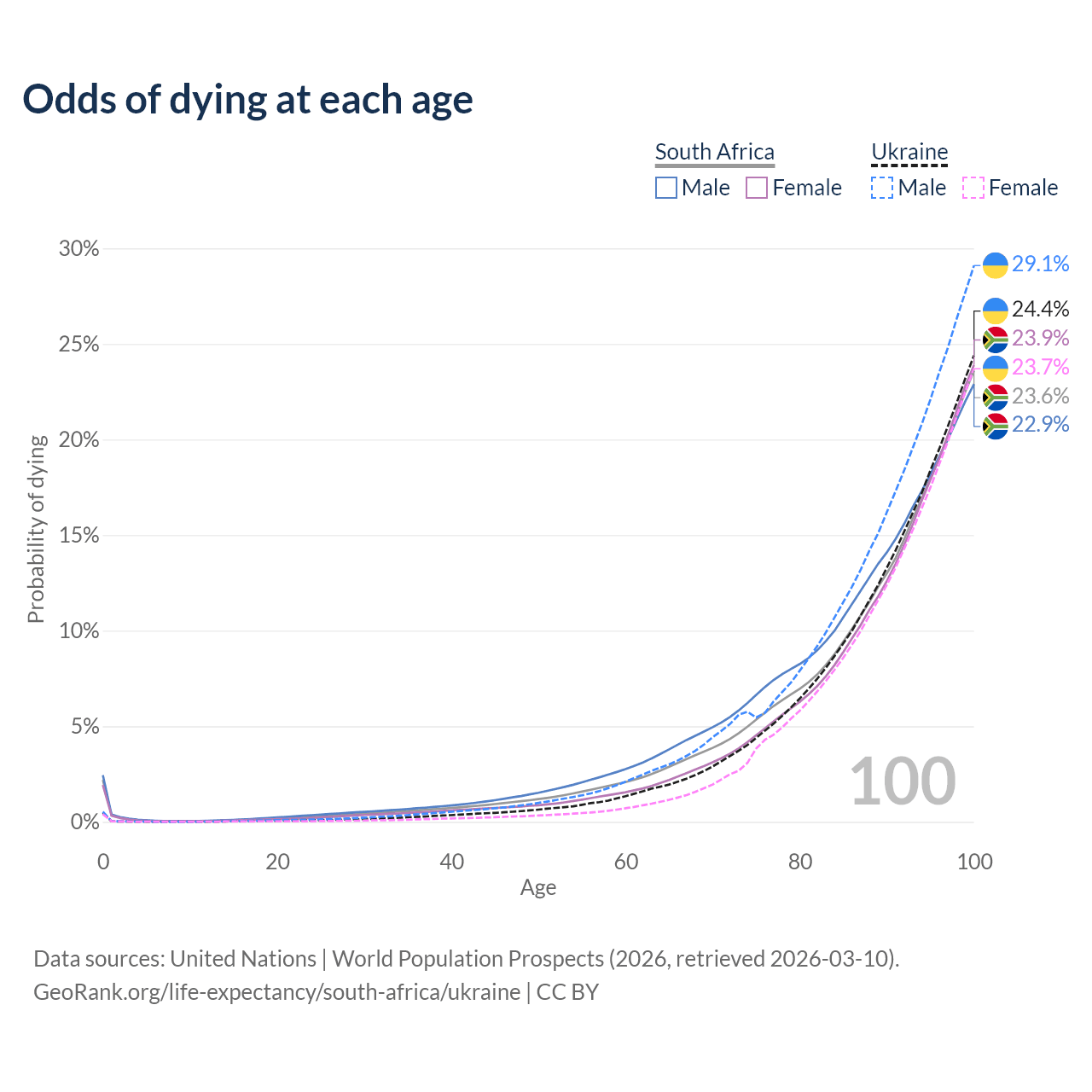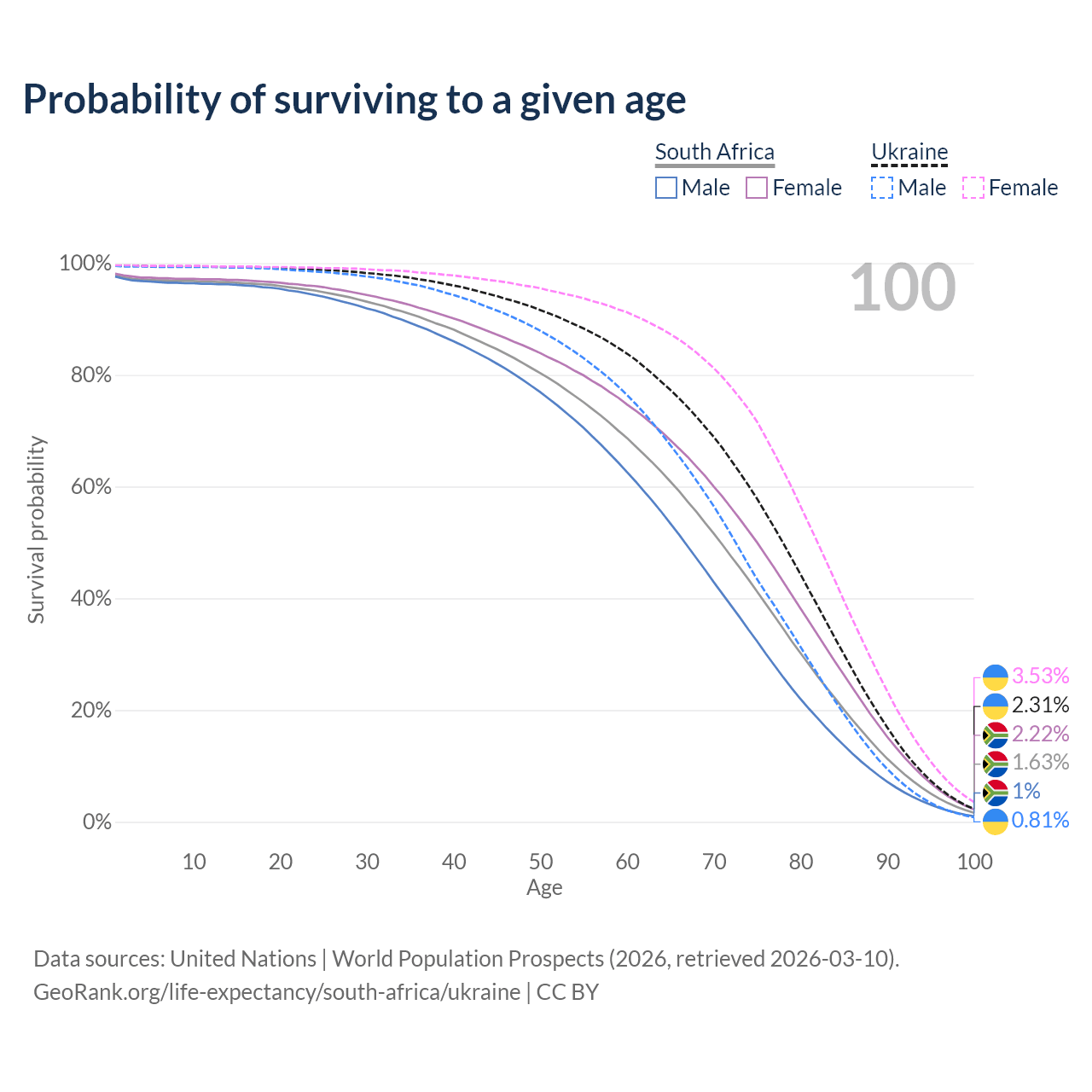 This life expectancy calculator shows the odds of living to 100, 95, 90, and below based on current age for both males and females in South Africa and Ukraine, along with mean and median age of death. The calculations are based on the 2026 life tables (actuarial tables) from the UN World Population Prospects.