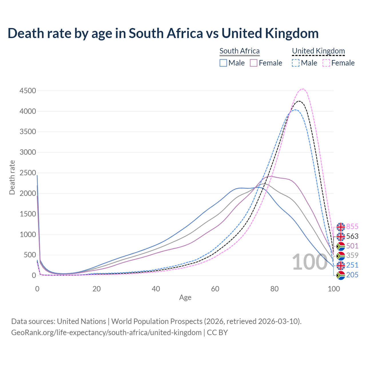 In South Africa, the most common age of death is 77, compared to 88 in the United Kingdom. The median age of death is 70.8 in South Africa and 84.9 in the United Kingdom, meaning only half of each cohort is expected to live past that age.