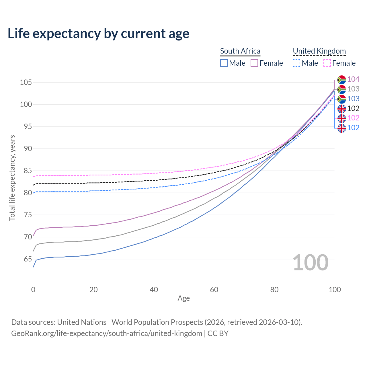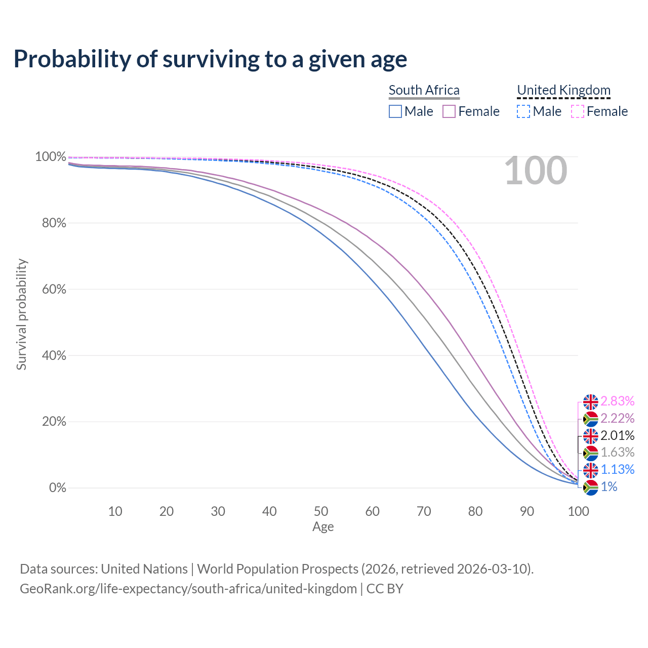 This life expectancy calculator shows the odds of living to 100, 95, 90, and below based on current age for both males and females in South Africa and the United Kingdom, along with mean and median age of death. The calculations are based on the 2026 life tables (actuarial tables) from the UN World Population Prospects.