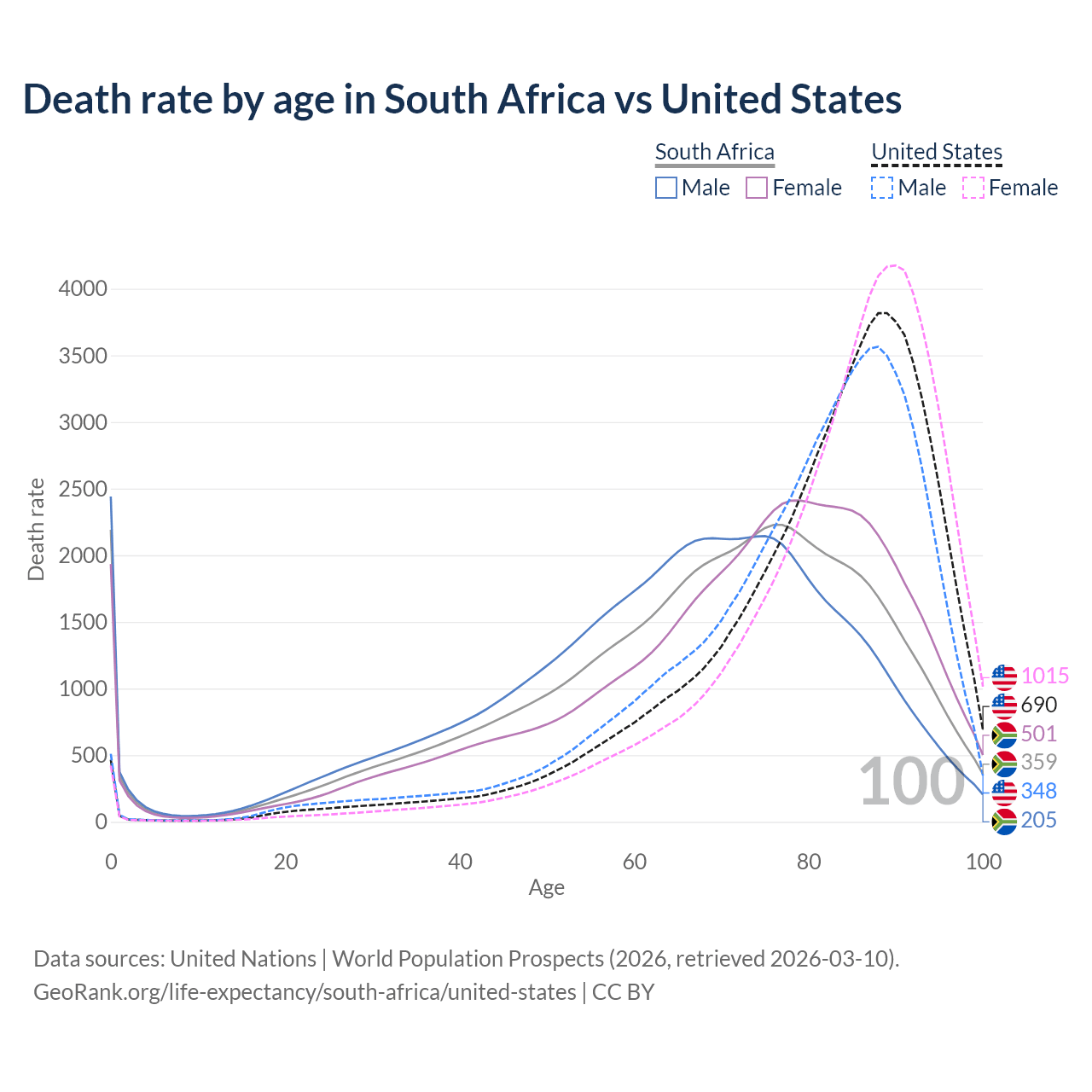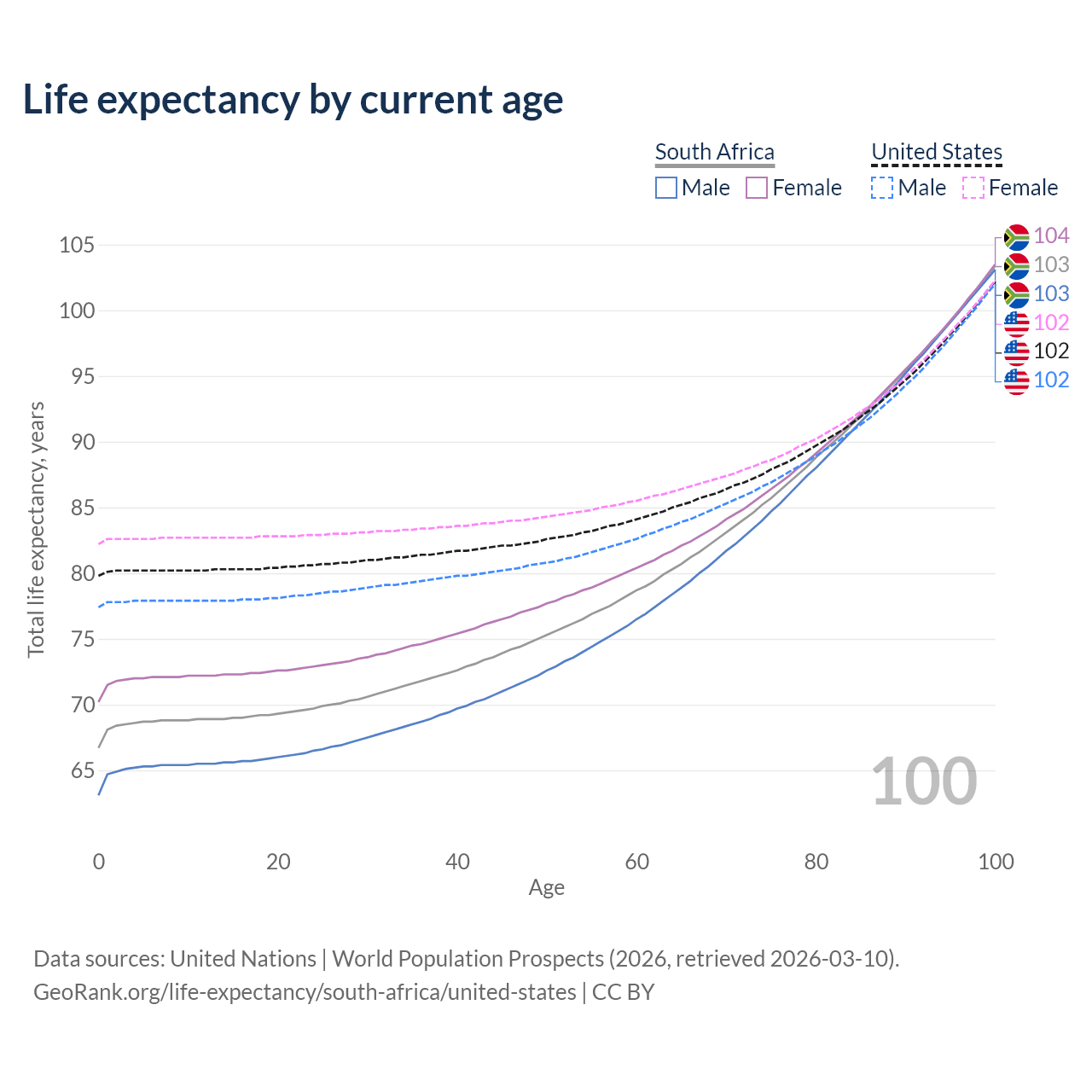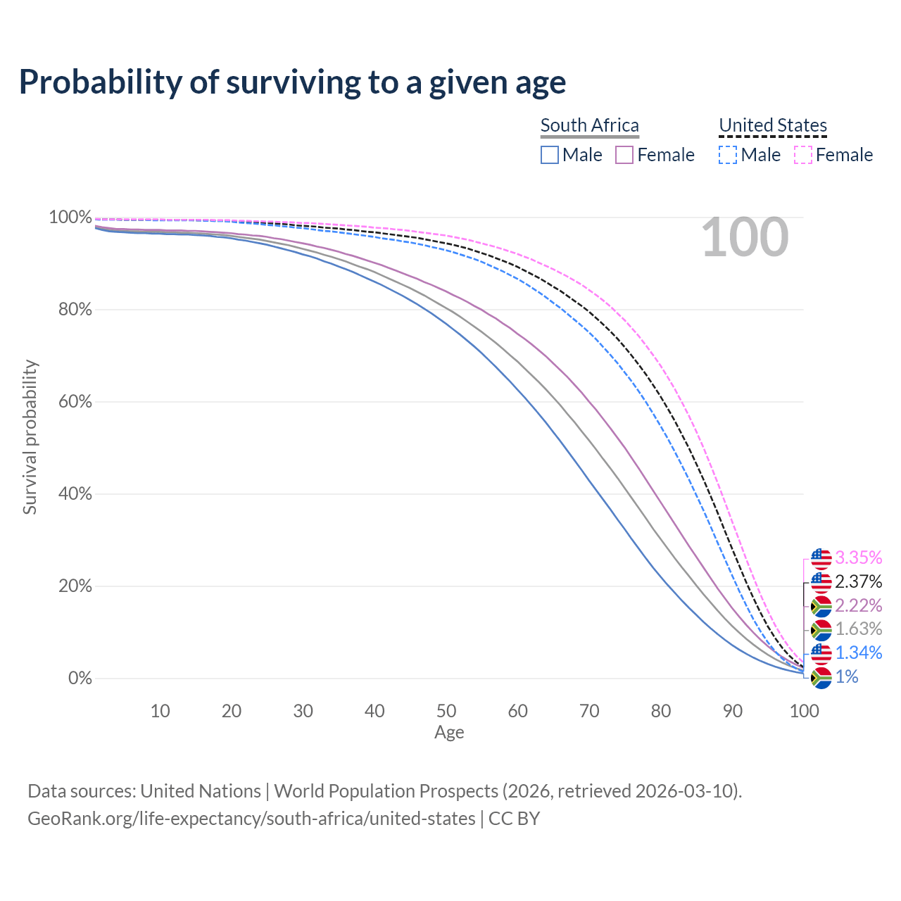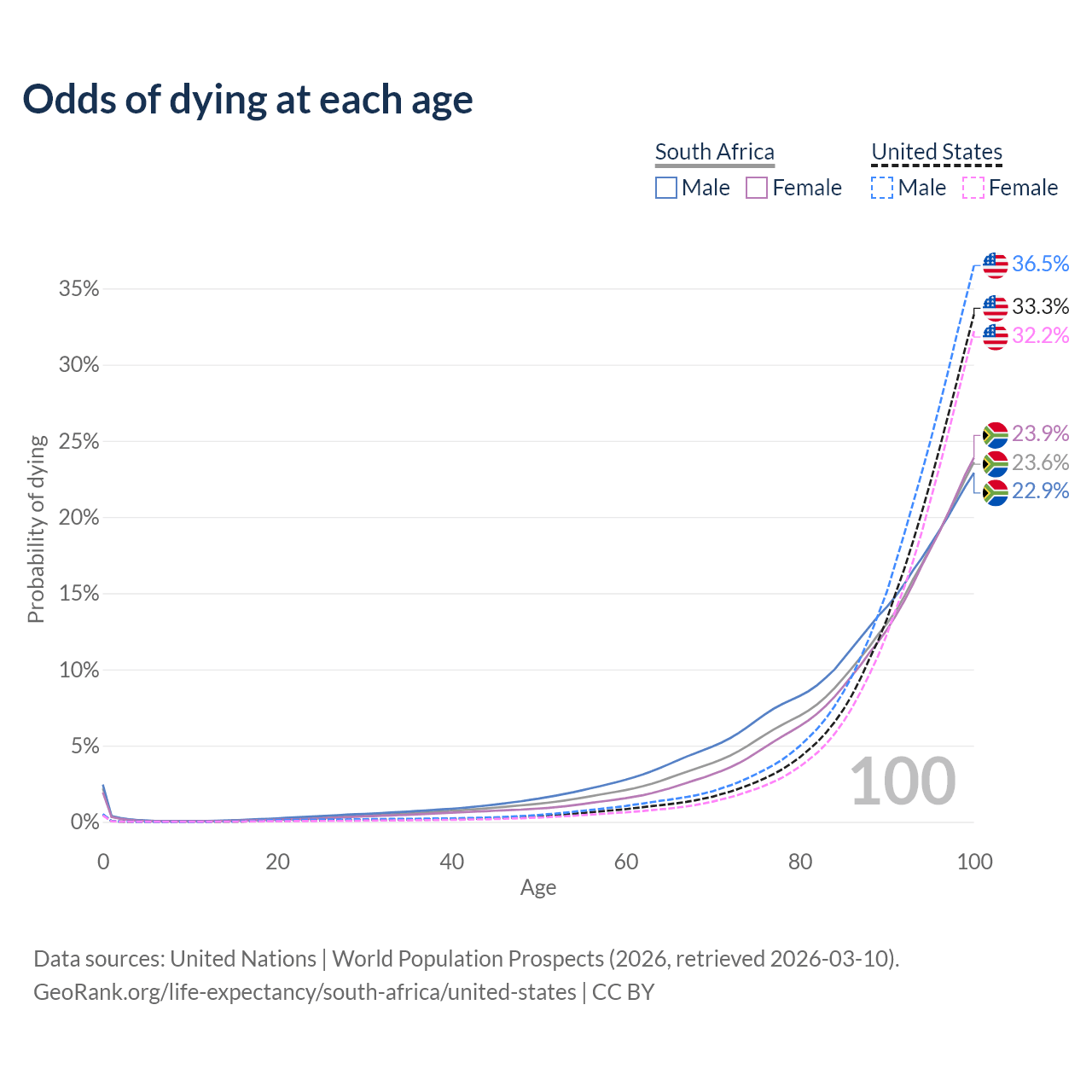 This life expectancy calculator shows the odds of living to 100, 95, 90, and below based on current age for both males and females in South Africa and the United States, along with mean and median age of death. The calculations are based on the 2026 life tables (actuarial tables) from the UN World Population Prospects.