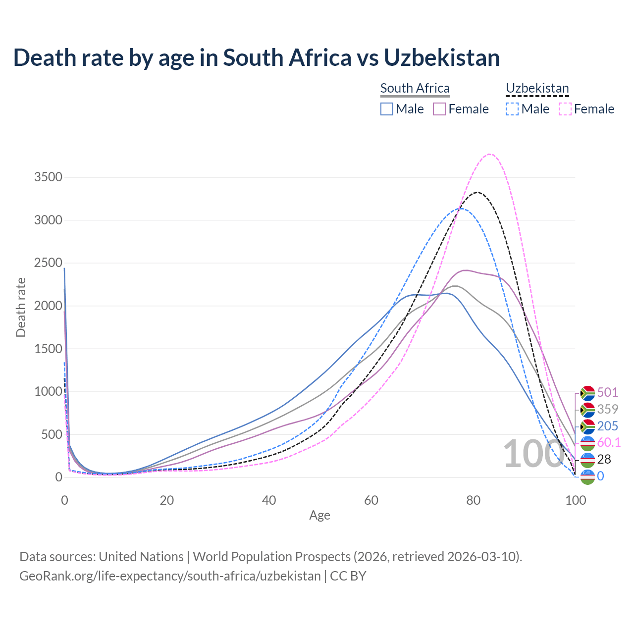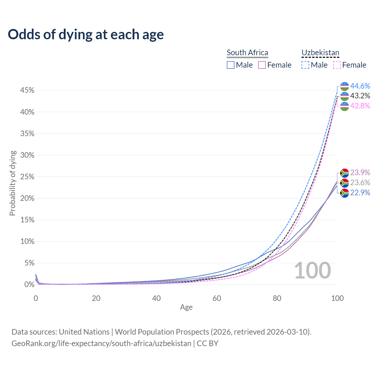 This life expectancy calculator shows the odds of living to 100, 95, 90, and below based on current age for both males and females in South Africa and Uzbekistan, along with mean and median age of death. The calculations are based on the 2026 life tables (actuarial tables) from the UN World Population Prospects.