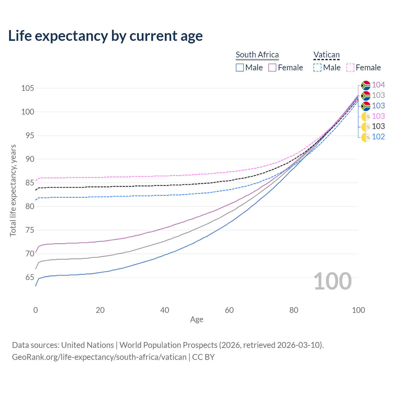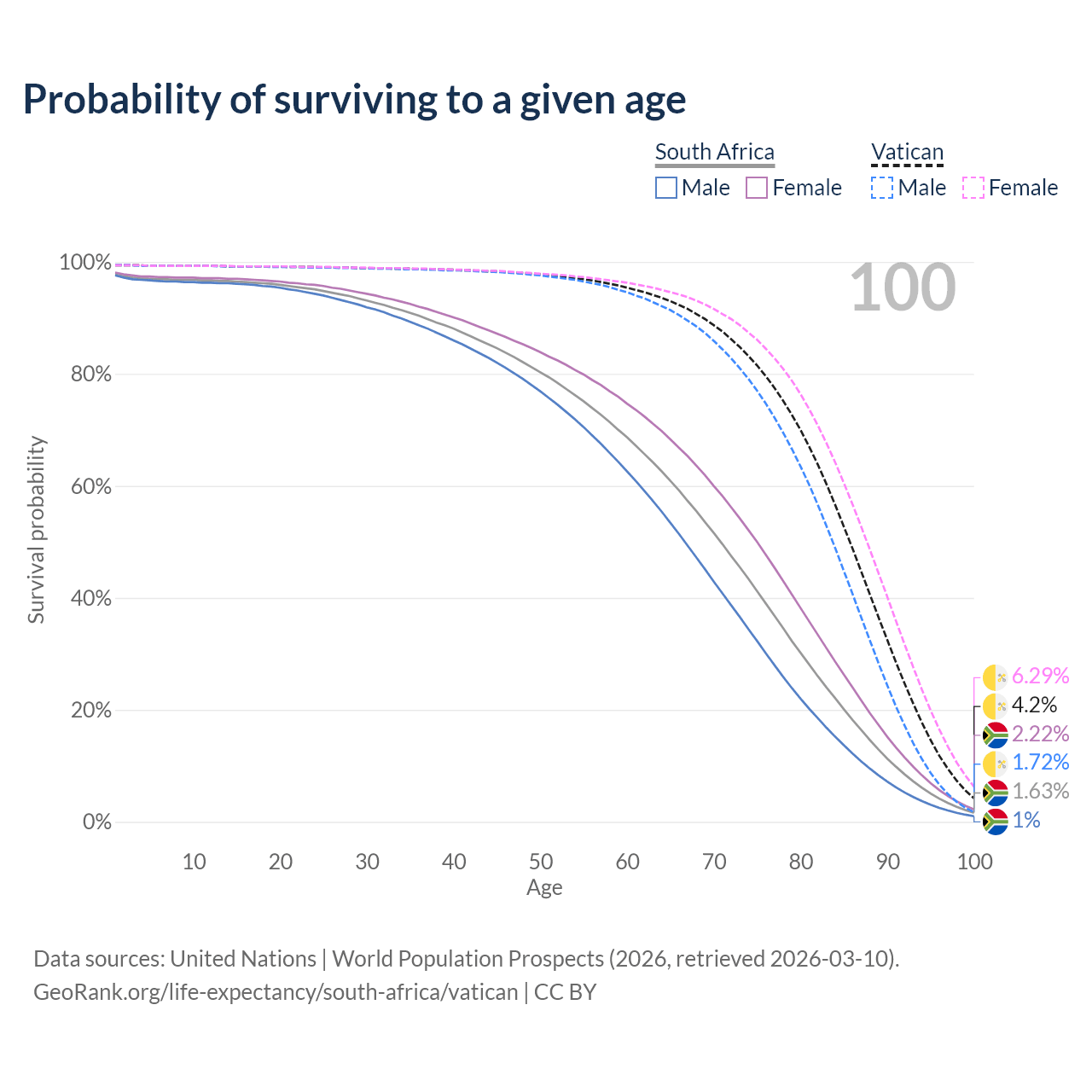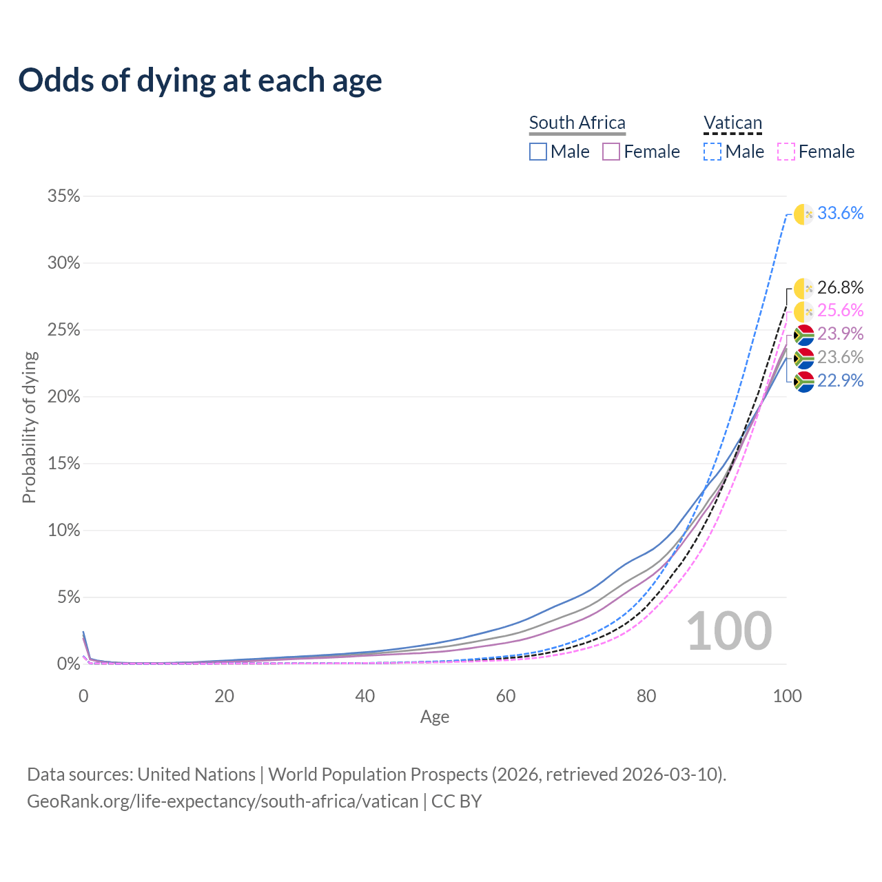 This life expectancy calculator shows the odds of living to 100, 95, 90, and below based on current age for both males and females in South Africa and the Vatican, along with mean and median age of death. The calculations are based on the 2026 life tables (actuarial tables) from the UN World Population Prospects.