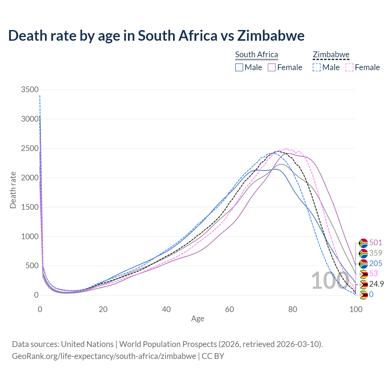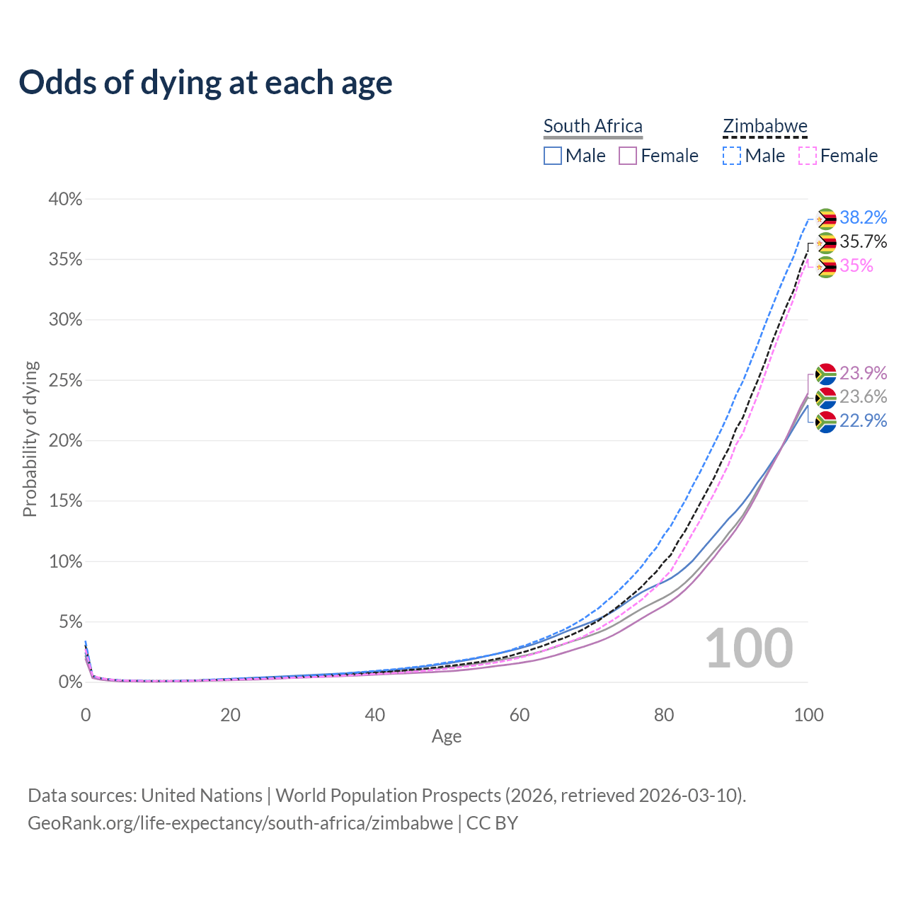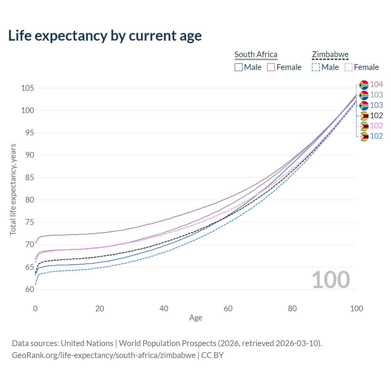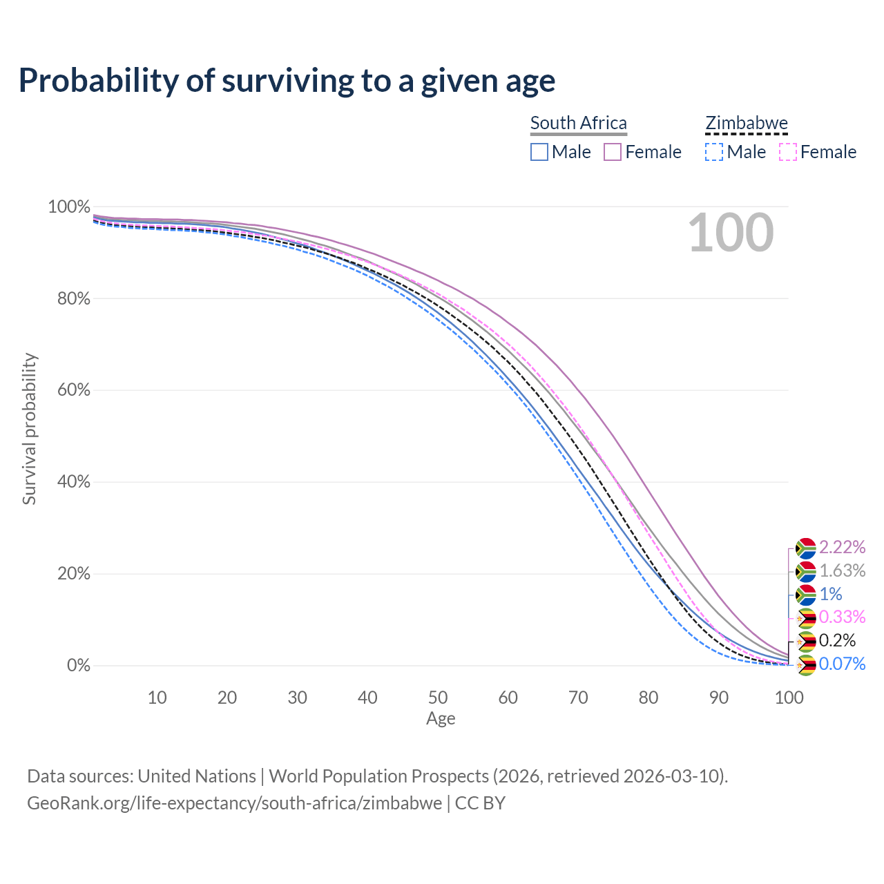 This life expectancy calculator shows the odds of living to 100, 95, 90, and below based on current age for both males and females in South Africa and Zimbabwe, along with mean and median age of death. The calculations are based on the 2026 life tables (actuarial tables) from the UN World Population Prospects.
