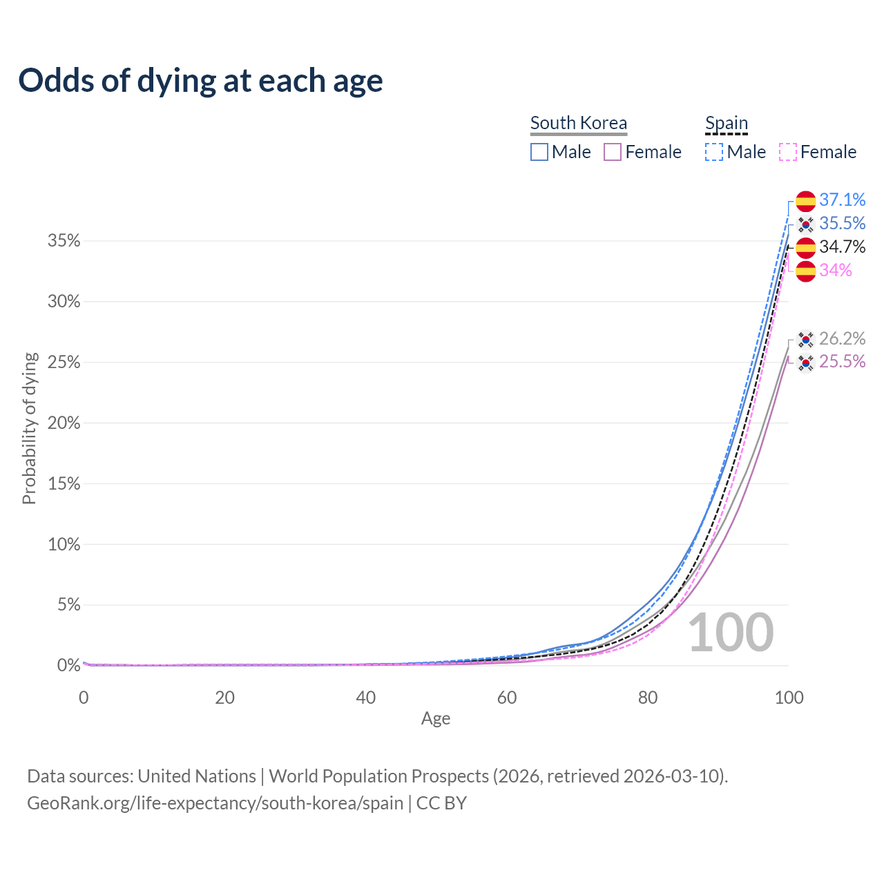 This life expectancy calculator shows the odds of living to 100, 95, 90, and below based on current age for both males and females in South Korea and Spain, along with mean and median age of death. The calculations are based on the 2026 life tables (actuarial tables) from the UN World Population Prospects.