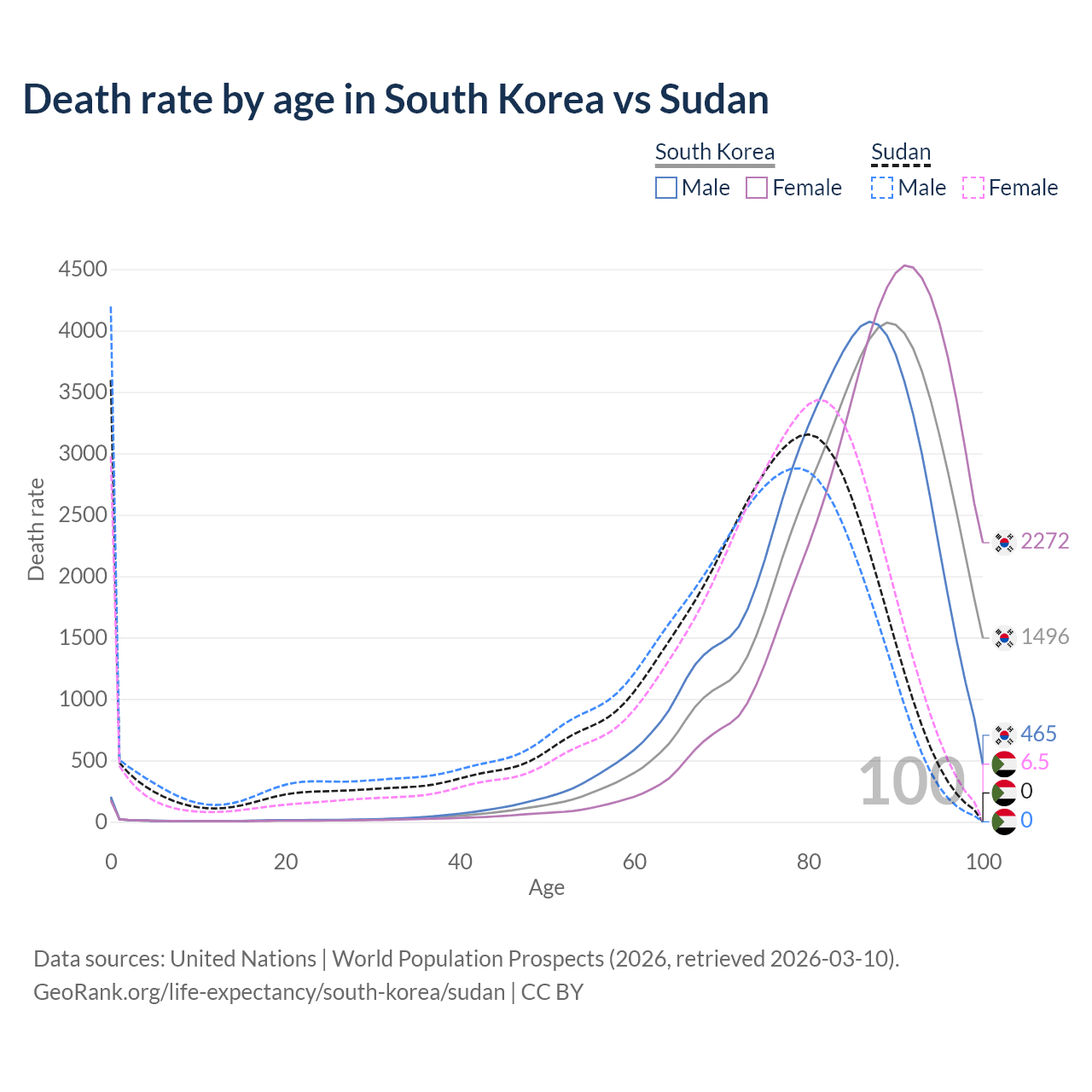 In South Korea, the most common age of death is 89, compared to 0 in Sudan. The median age of death is 86.8 in South Korea and 74.1 in Sudan, meaning only half of each cohort is expected to live past that age.