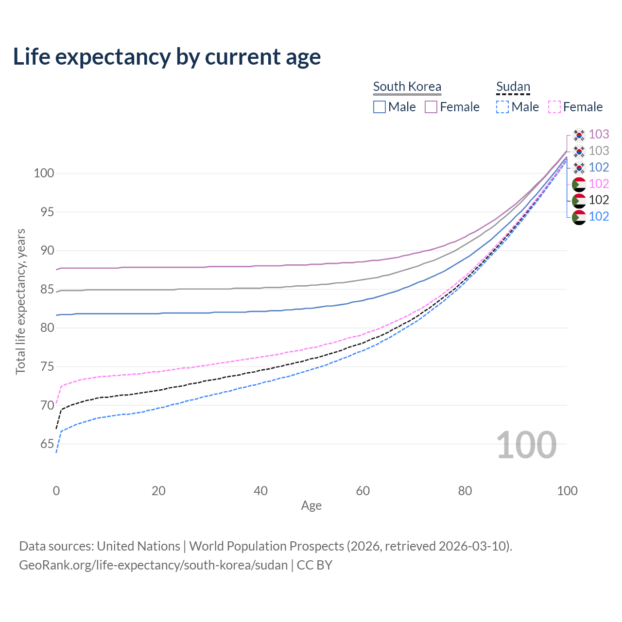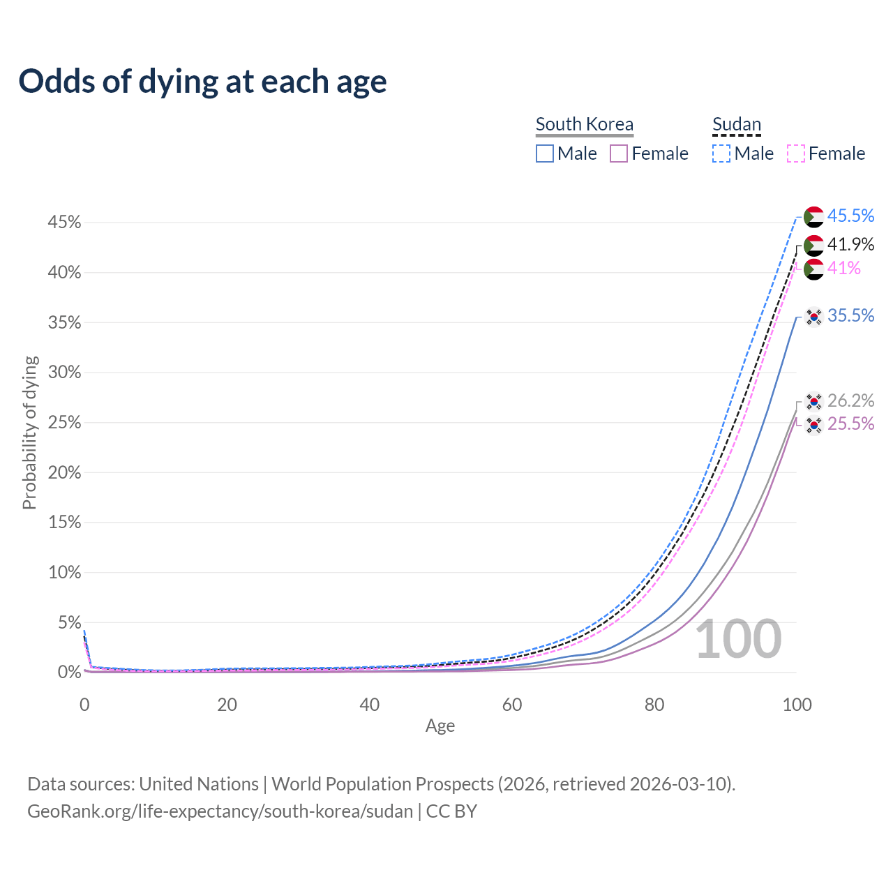 This life expectancy calculator shows the odds of living to 100, 95, 90, and below based on current age for both males and females in South Korea and Sudan, along with mean and median age of death. The calculations are based on the 2026 life tables (actuarial tables) from the UN World Population Prospects.