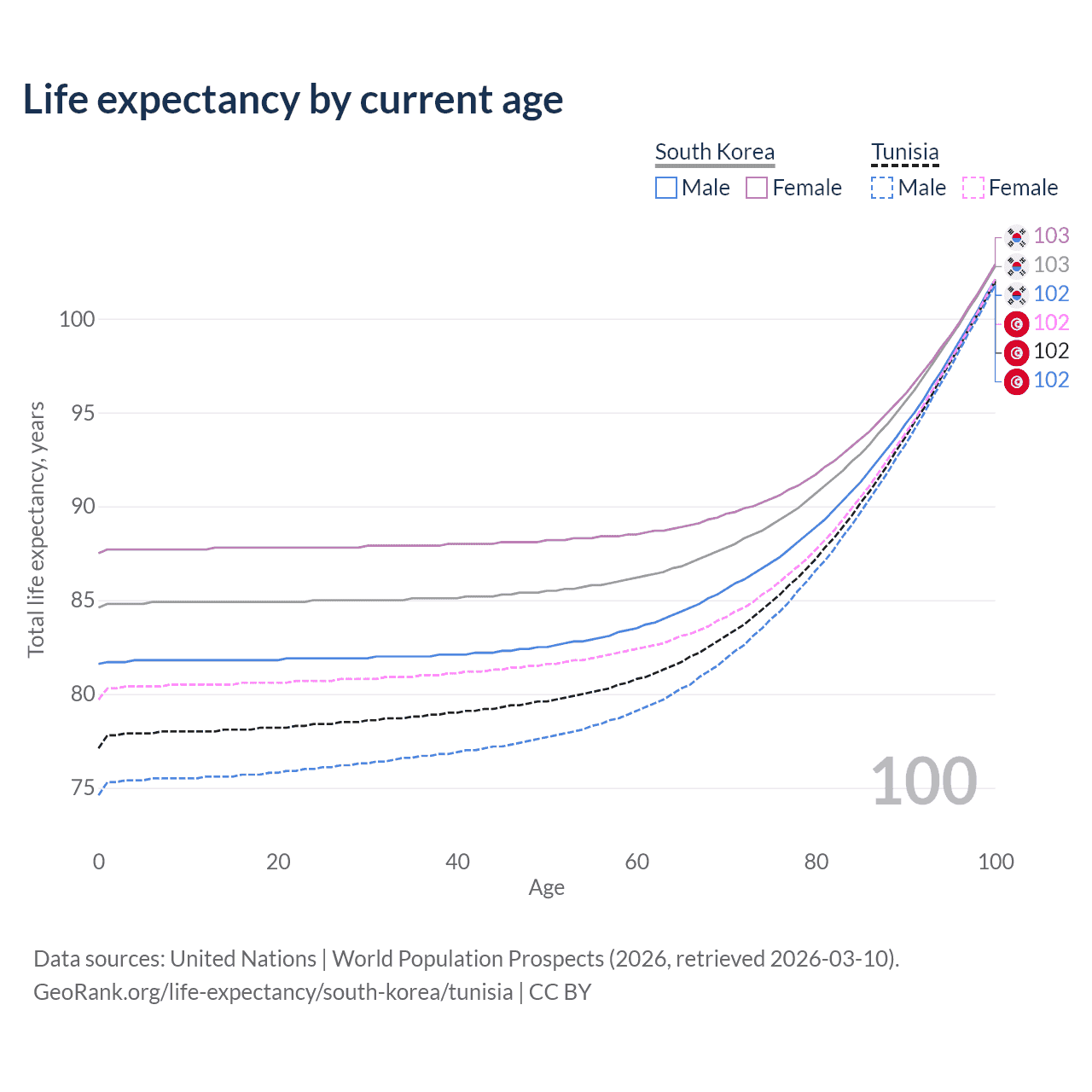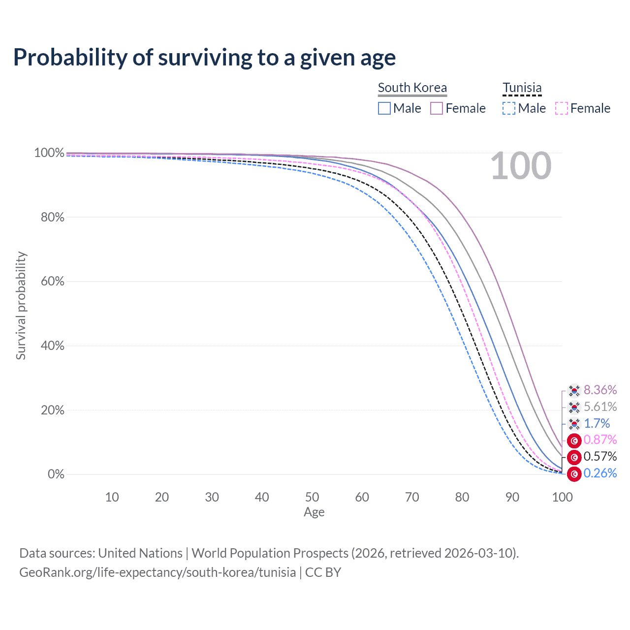 This life expectancy calculator shows the odds of living to 100, 95, 90, and below based on current age for both males and females in South Korea and Tunisia, along with mean and median age of death. The calculations are based on the 2026 life tables (actuarial tables) from the UN World Population Prospects.