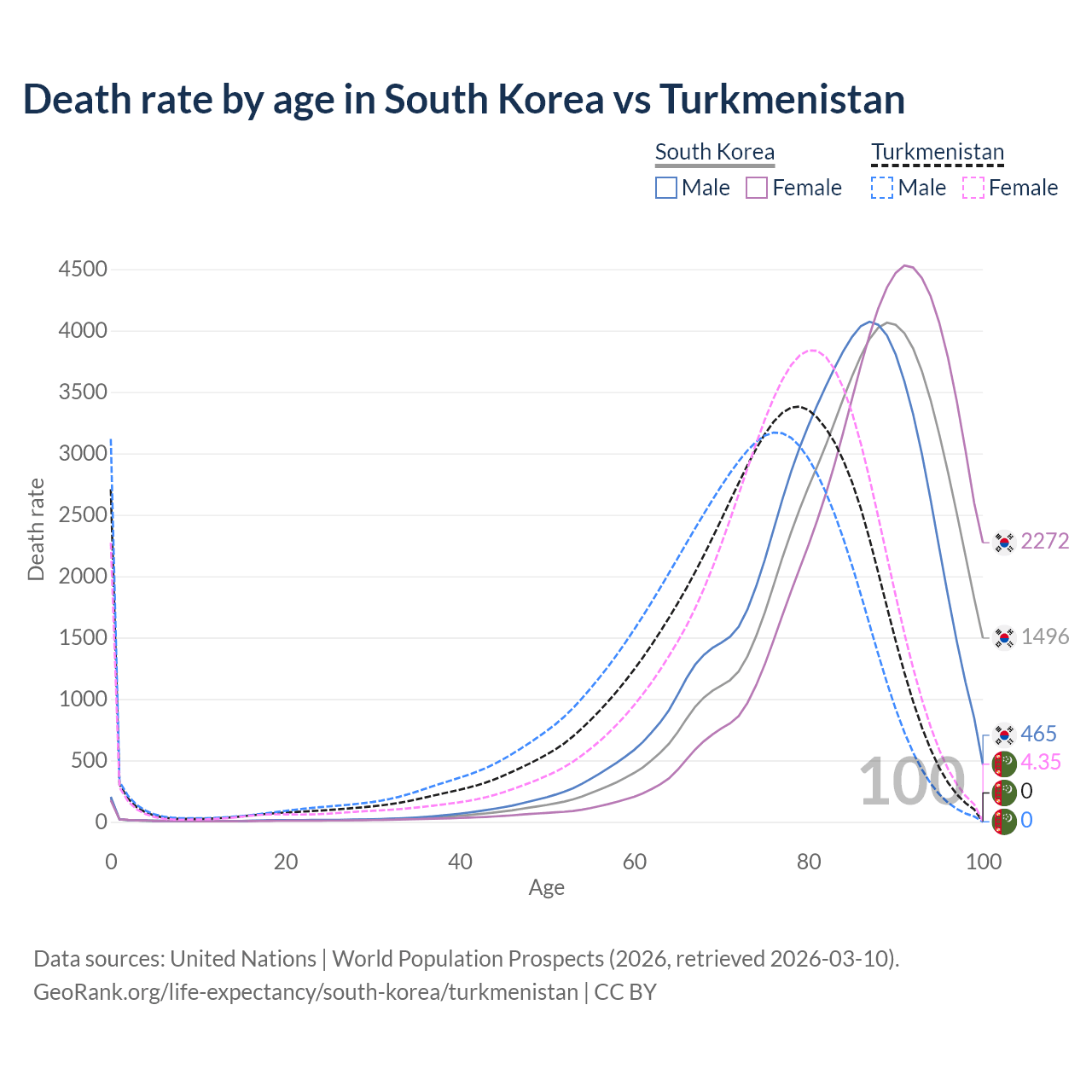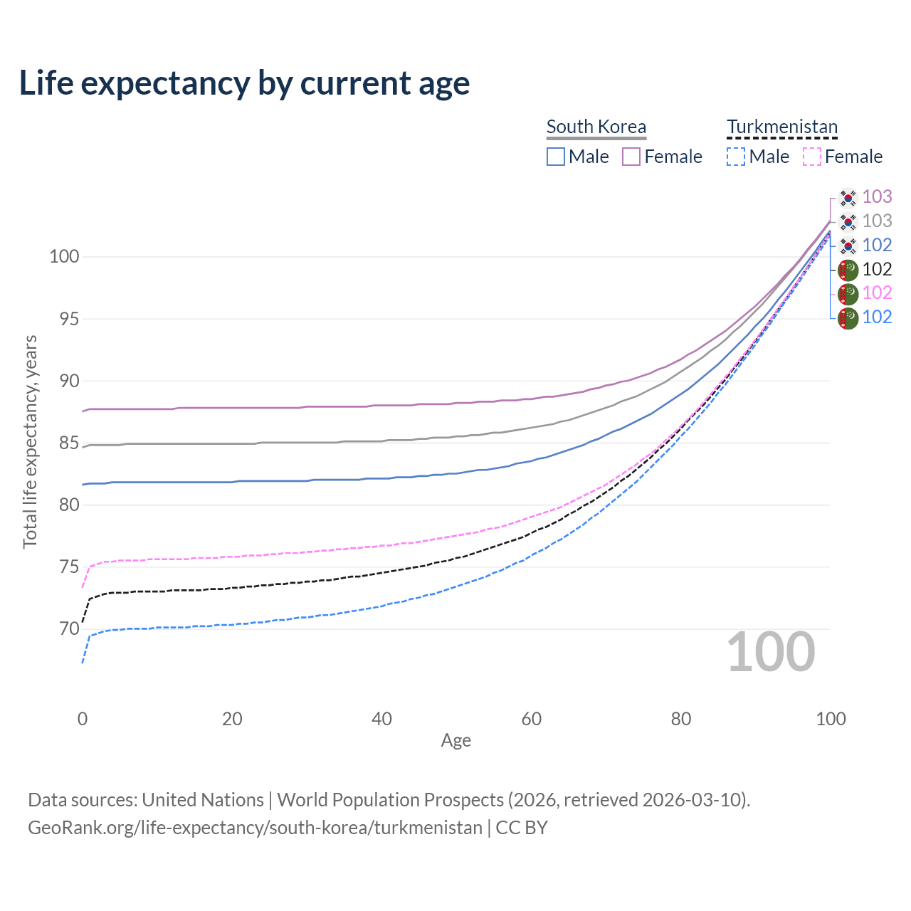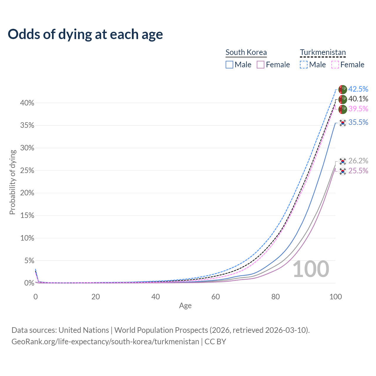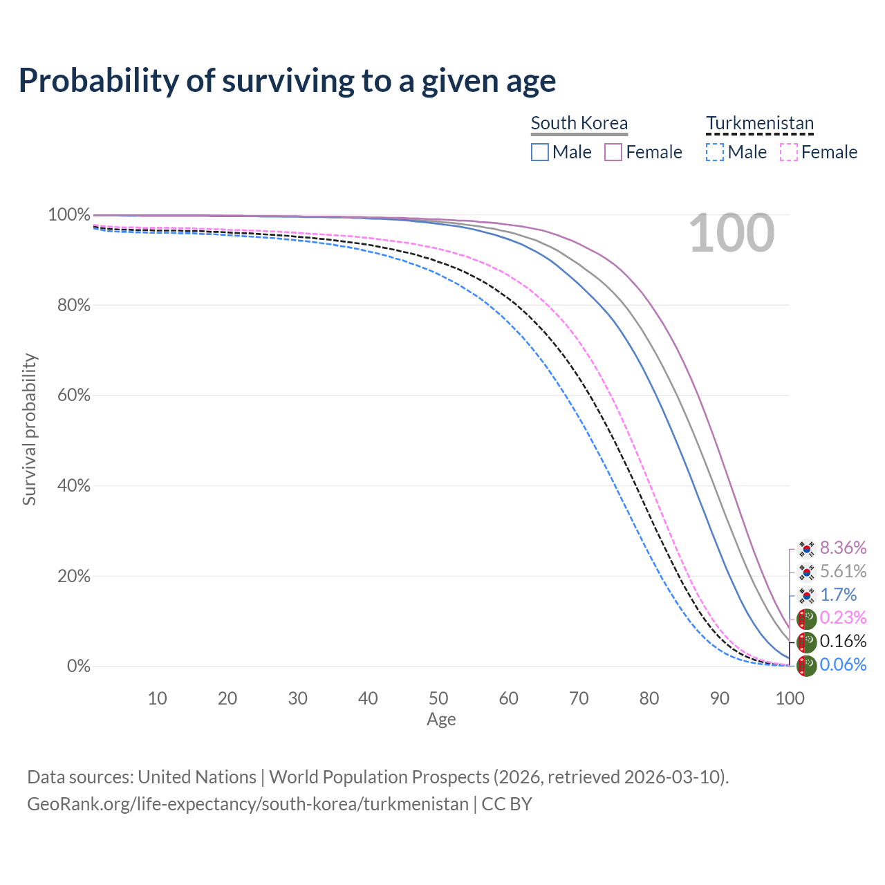 This life expectancy calculator shows the odds of living to 100, 95, 90, and below based on current age for both males and females in South Korea and Turkmenistan, along with mean and median age of death. The calculations are based on the 2026 life tables (actuarial tables) from the UN World Population Prospects.