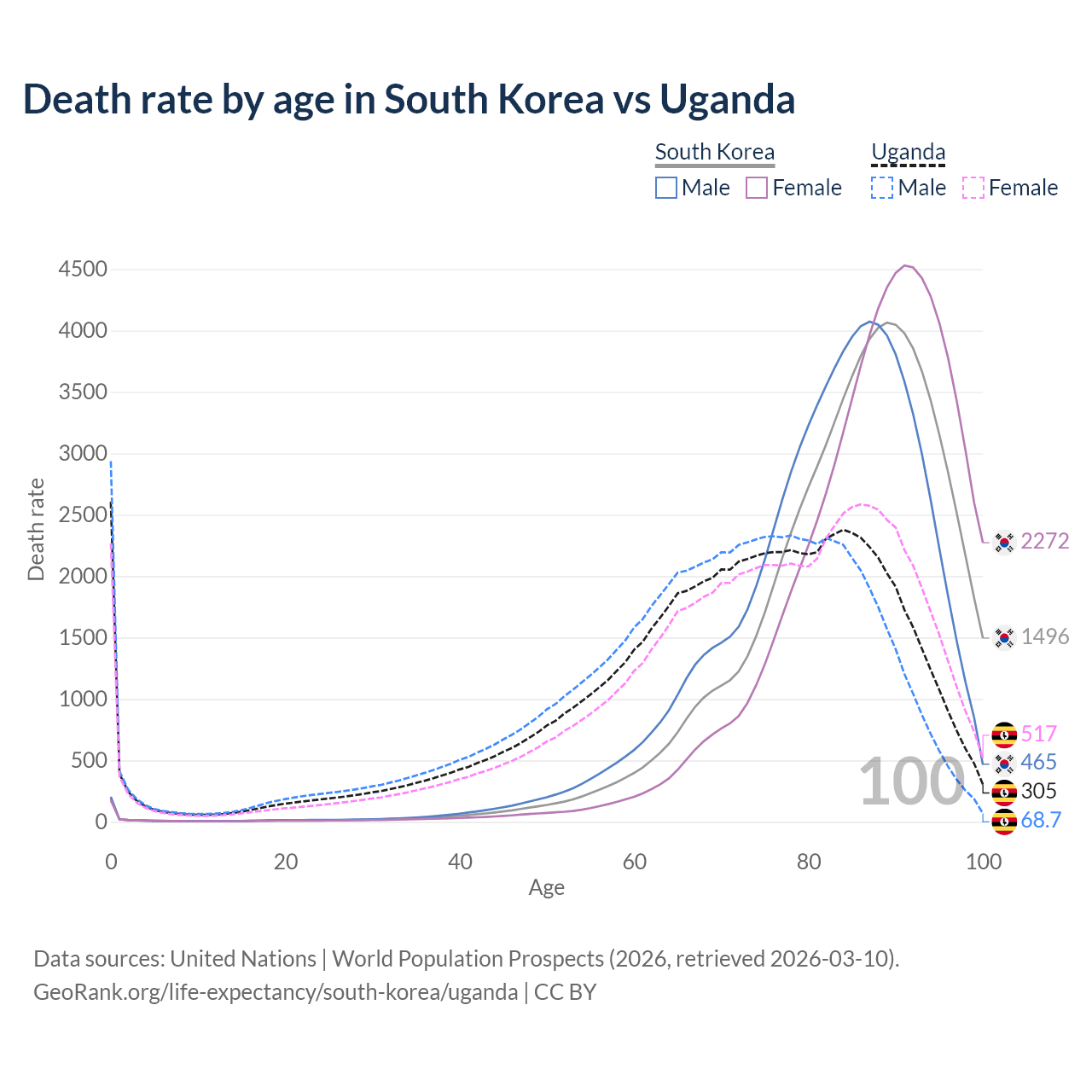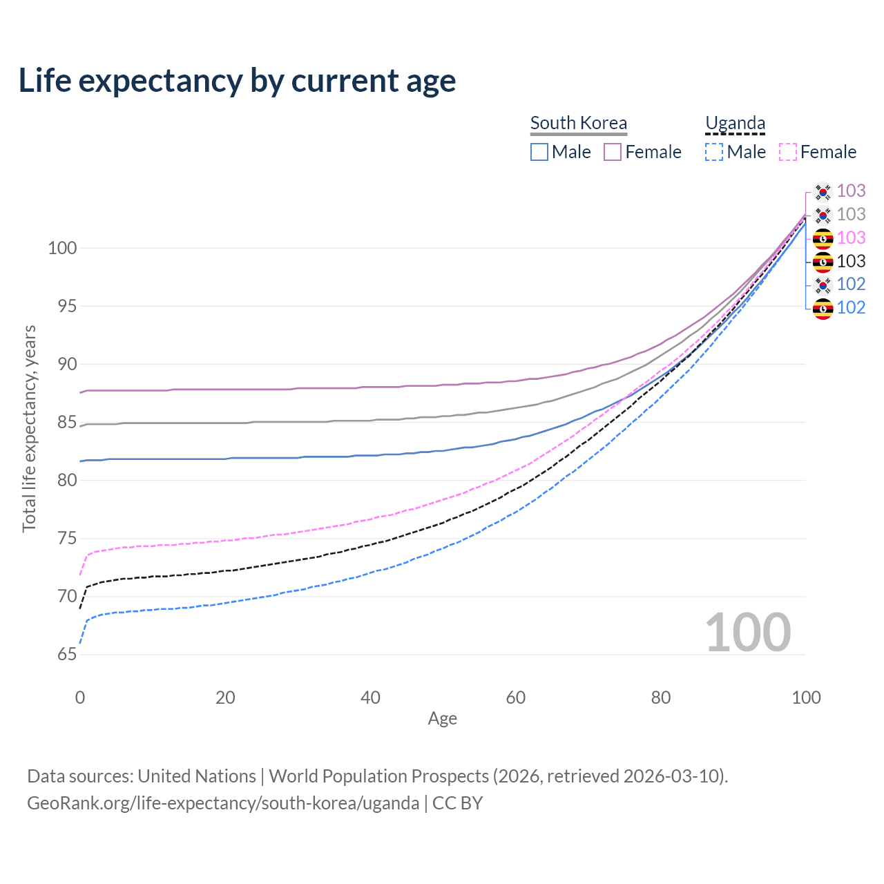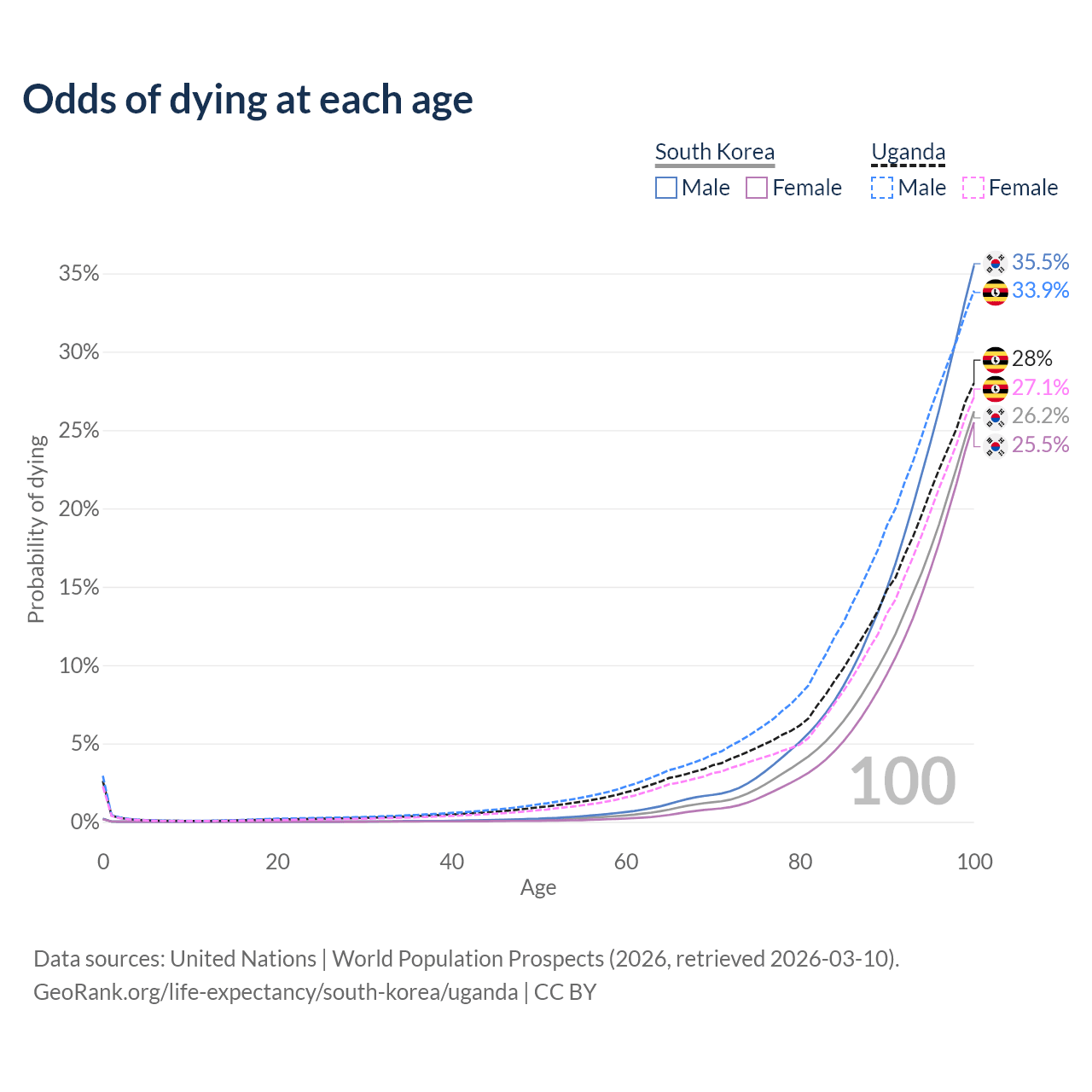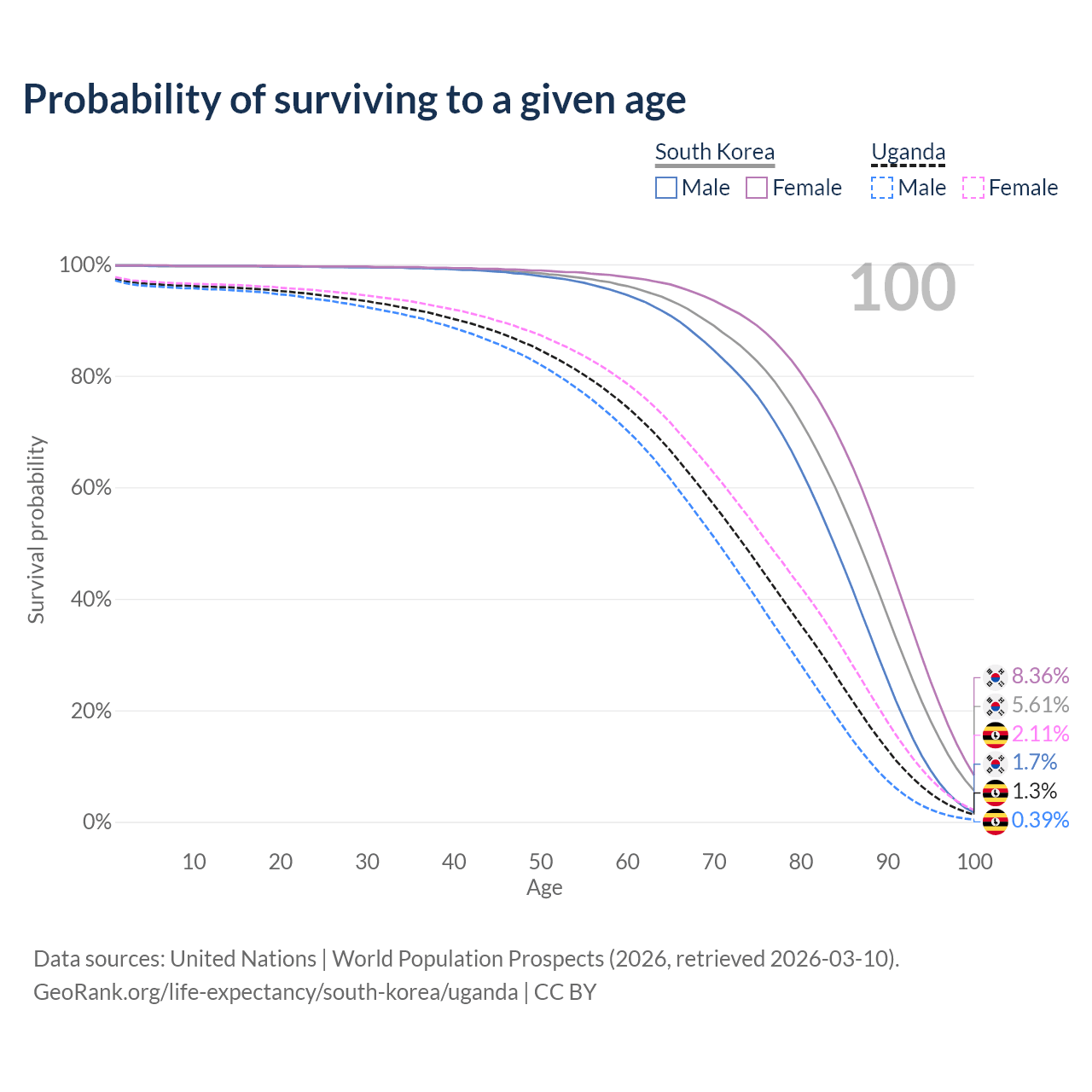 This life expectancy calculator shows the odds of living to 100, 95, 90, and below based on current age for both males and females in South Korea and Uganda, along with mean and median age of death. The calculations are based on the 2026 life tables (actuarial tables) from the UN World Population Prospects.
