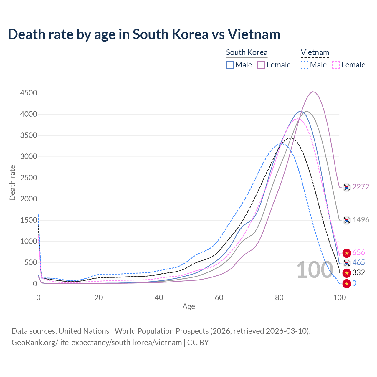 In South Korea, the most common age of death is 89, compared to 84 in Vietnam. The median age of death is 86.8 in South Korea and 79.9 in Vietnam, meaning only half of each cohort is expected to live past that age.