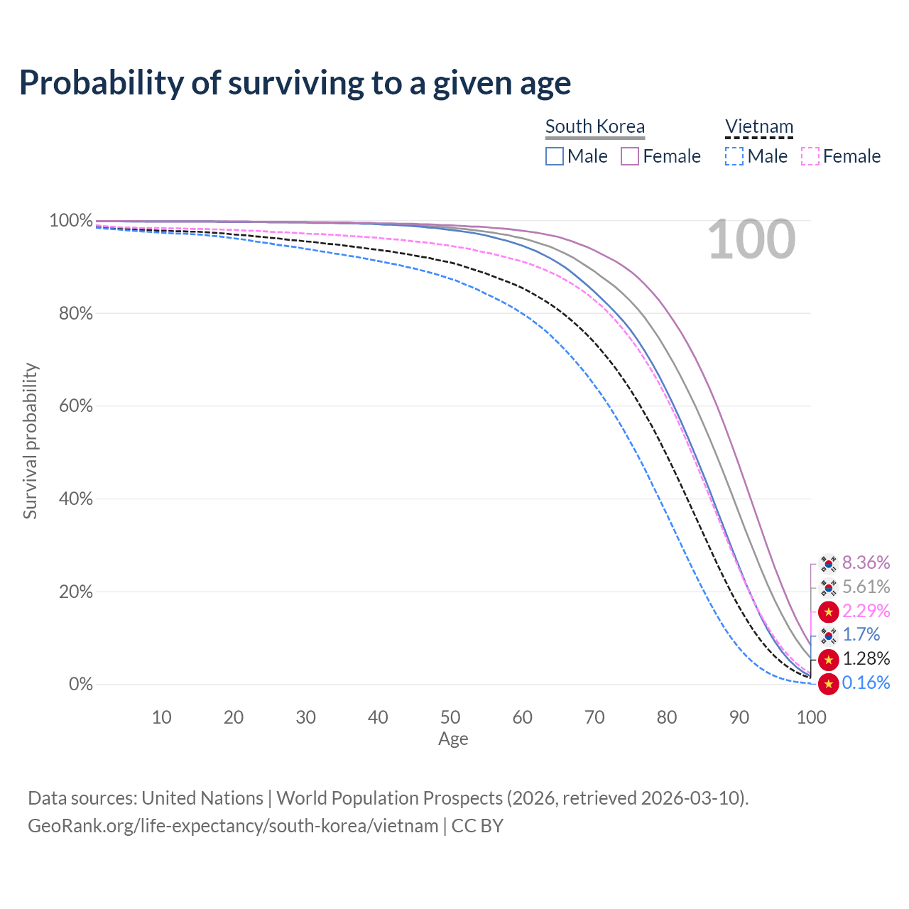 This life expectancy calculator shows the odds of living to 100, 95, 90, and below based on current age for both males and females in South Korea and Vietnam, along with mean and median age of death. The calculations are based on the 2026 life tables (actuarial tables) from the UN World Population Prospects.