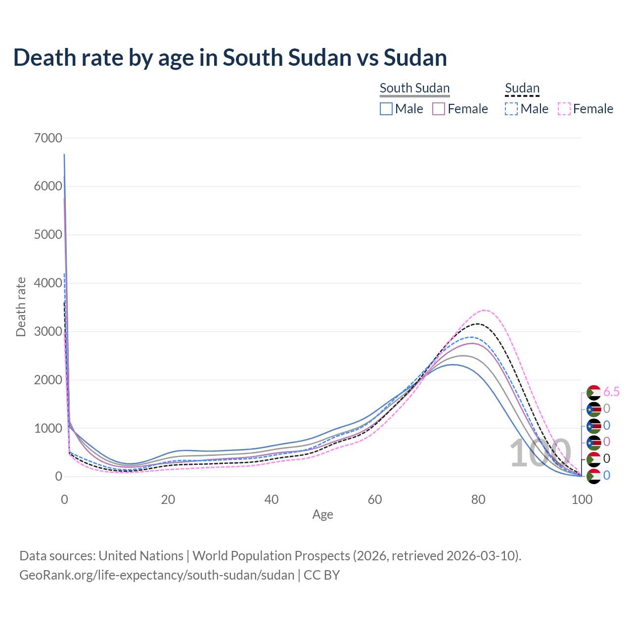 This life expectancy calculator shows the odds of living to 100, 95, 90, and below based on current age for both males and females in South Sudan and Sudan, along with mean and median age of death. The calculations are based on the 2026 life tables (actuarial tables) from the UN World Population Prospects.
