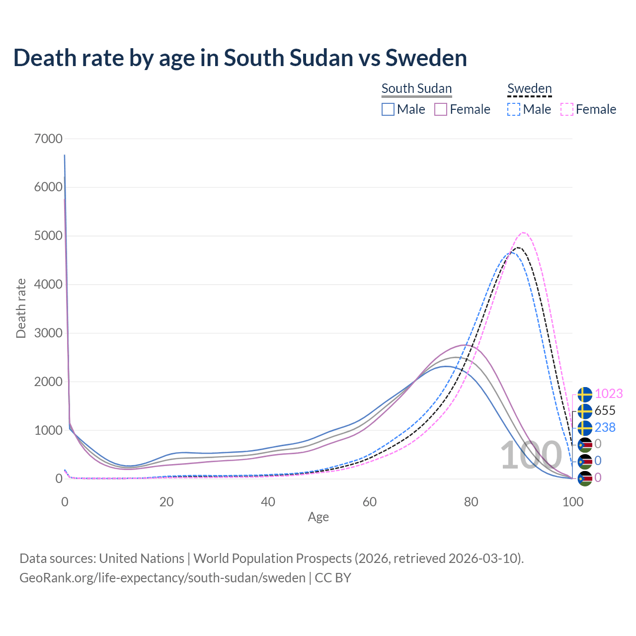 The average life expectancy at birth is 58 years in South Sudan vs 83.7 in Sweden. South Sudan is ranked 195/197 by life expectancy, and Sweden is 14/197. In South Sudan, the life expectancy is 55 years for males and 61 years for females. In Sweden, it's 82 years for males and 85.5 years for females.