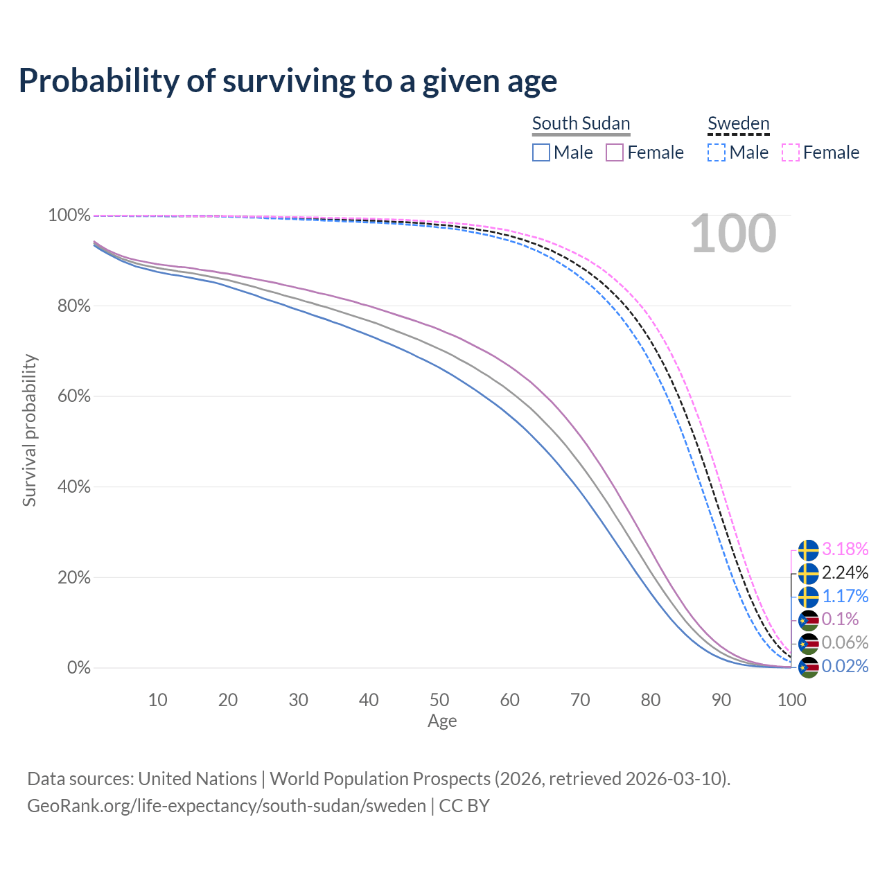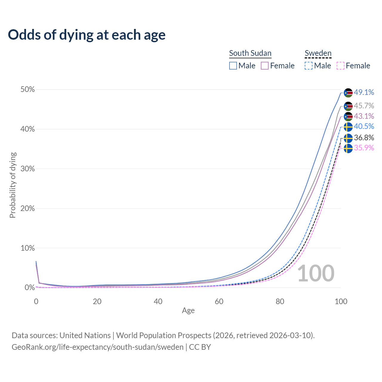 This life expectancy calculator shows the odds of living to 100, 95, 90, and below based on current age for both males and females in South Sudan and Sweden, along with mean and median age of death. The calculations are based on the 2026 life tables (actuarial tables) from the UN World Population Prospects.