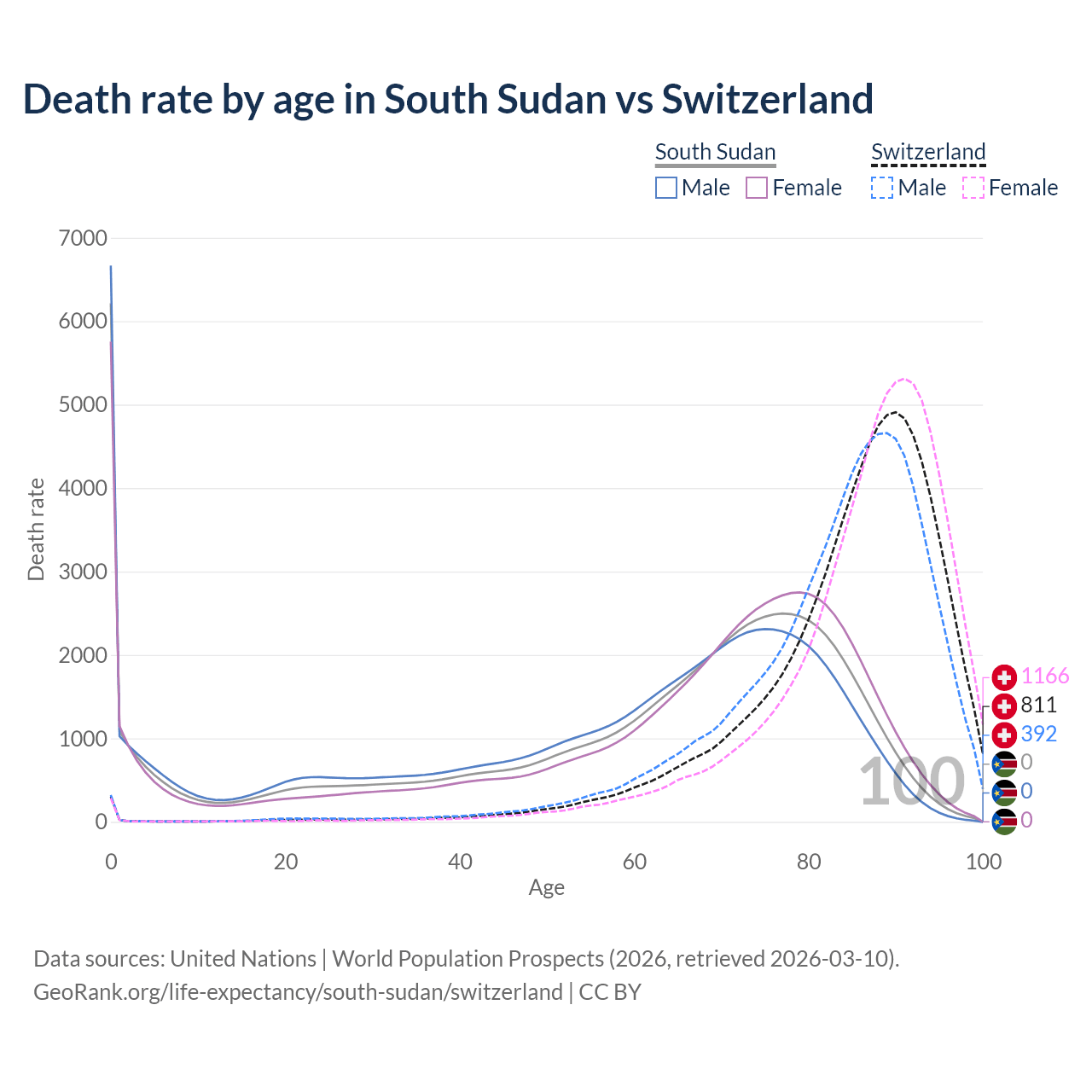 The average life expectancy at birth is 58 years in South Sudan vs 84.4 in Switzerland. South Sudan is ranked 195/197 by life expectancy, and Switzerland is 6/197. In South Sudan, the life expectancy is 55 years for males and 61 years for females. In Switzerland, it's 82.5 years for males and 86.2 years for females.