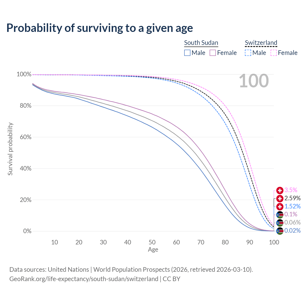 This life expectancy calculator shows the odds of living to 100, 95, 90, and below based on current age for both males and females in South Sudan and Switzerland, along with mean and median age of death. The calculations are based on the 2026 life tables (actuarial tables) from the UN World Population Prospects.
