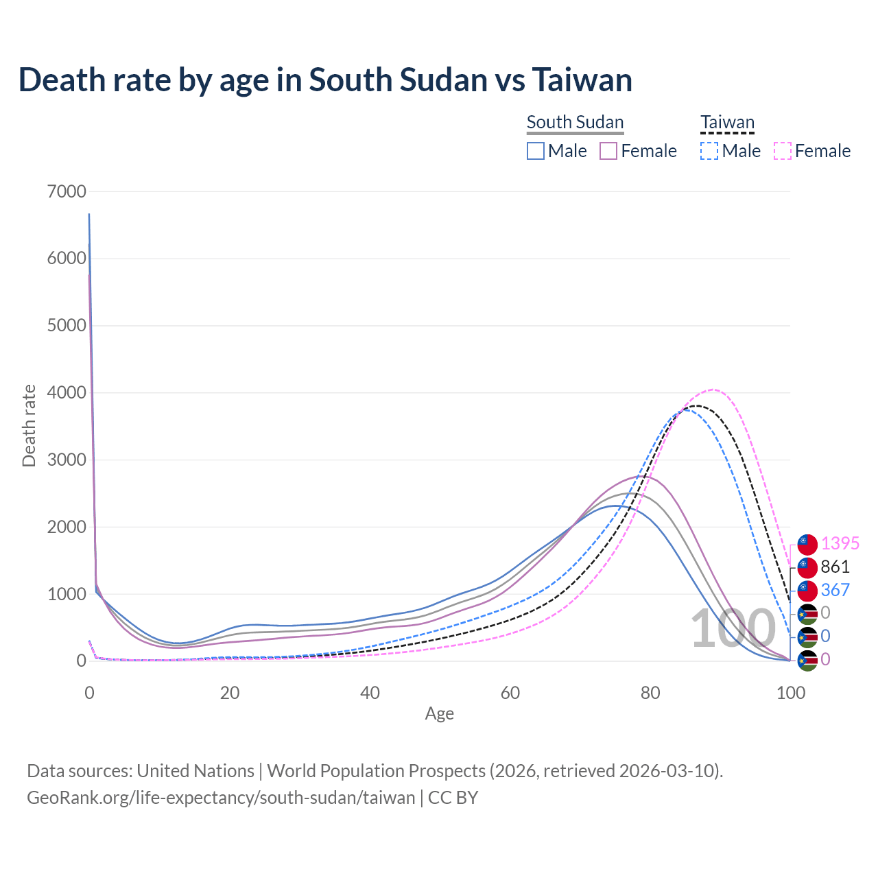 The average life expectancy at birth is 58 years in South Sudan vs 81.1 in Taiwan. South Sudan is ranked 195/197 by life expectancy, and Taiwan is 40/197. In South Sudan, the life expectancy is 55 years for males and 61 years for females. In Taiwan, it's 78.3 years for males and 84 years for females.