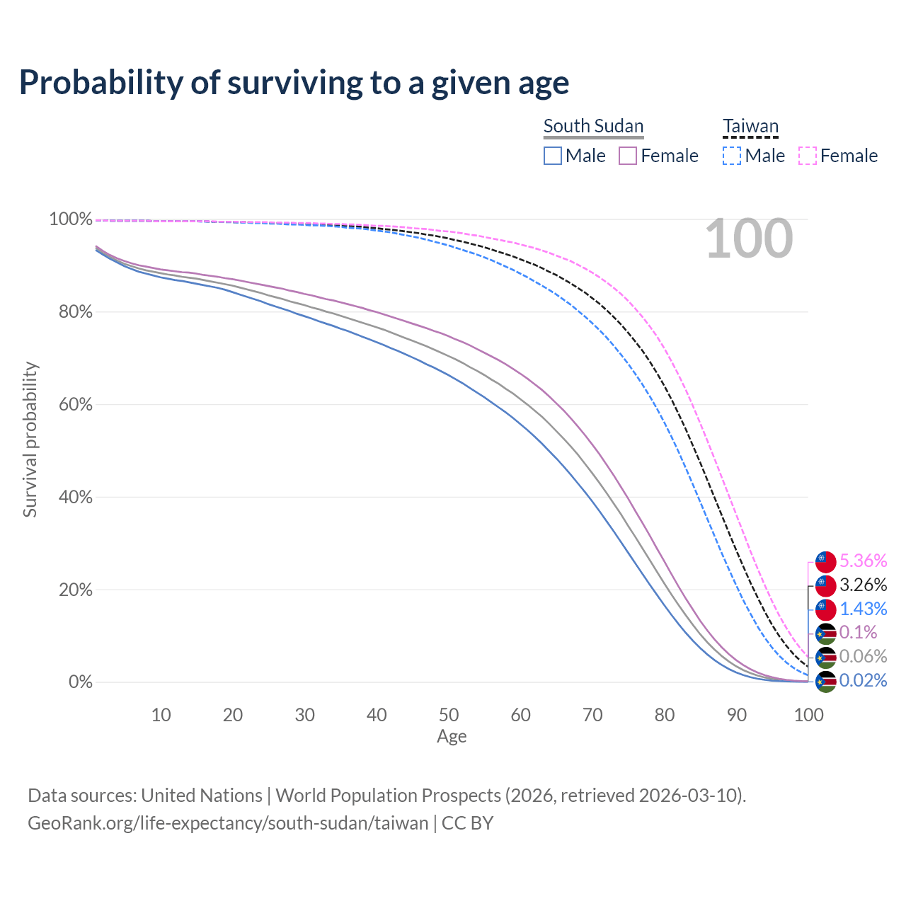 This life expectancy calculator shows the odds of living to 100, 95, 90, and below based on current age for both males and females in South Sudan and Taiwan, along with mean and median age of death. The calculations are based on the 2026 life tables (actuarial tables) from the UN World Population Prospects.