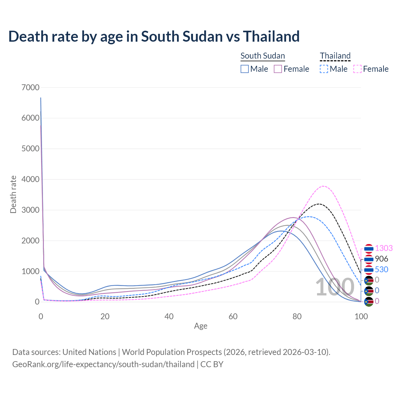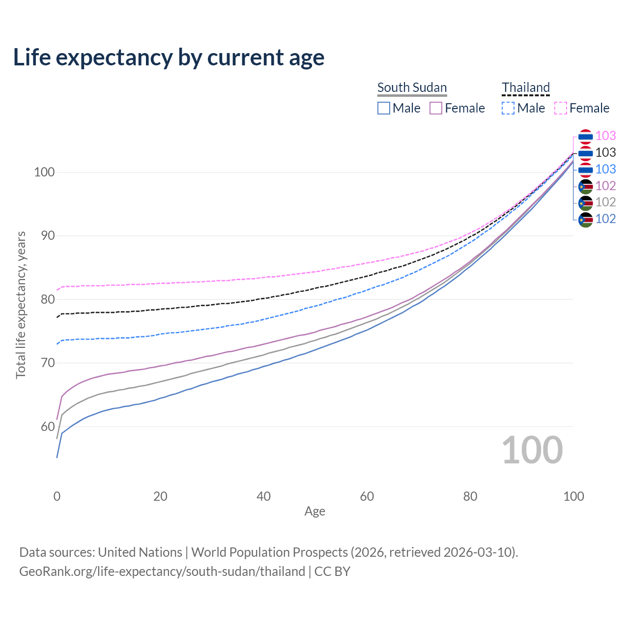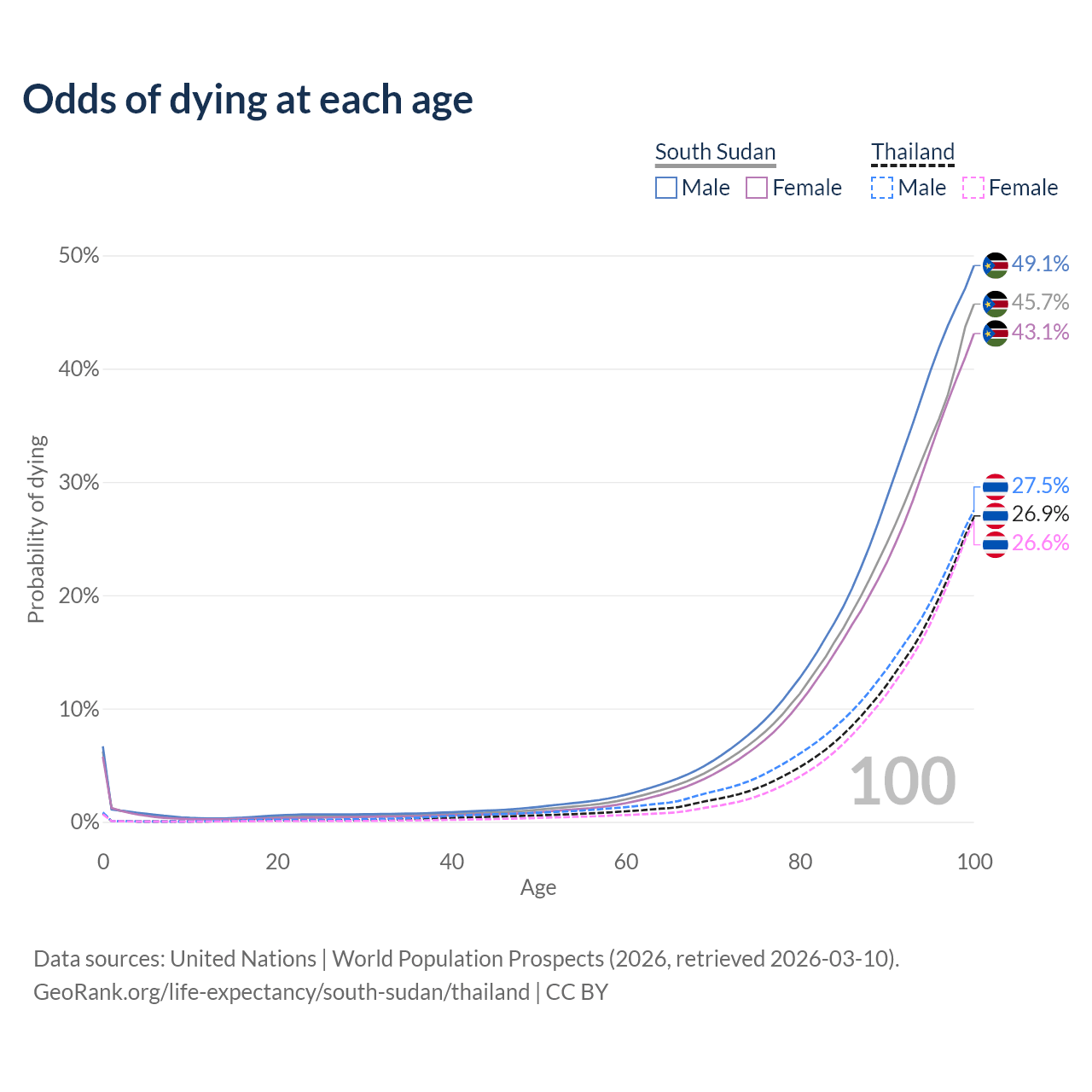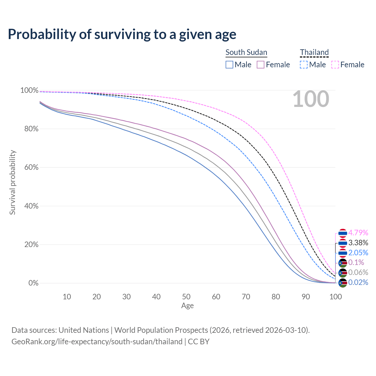 This life expectancy calculator shows the odds of living to 100, 95, 90, and below based on current age for both males and females in South Sudan and Thailand, along with mean and median age of death. The calculations are based on the 2026 life tables (actuarial tables) from the UN World Population Prospects.