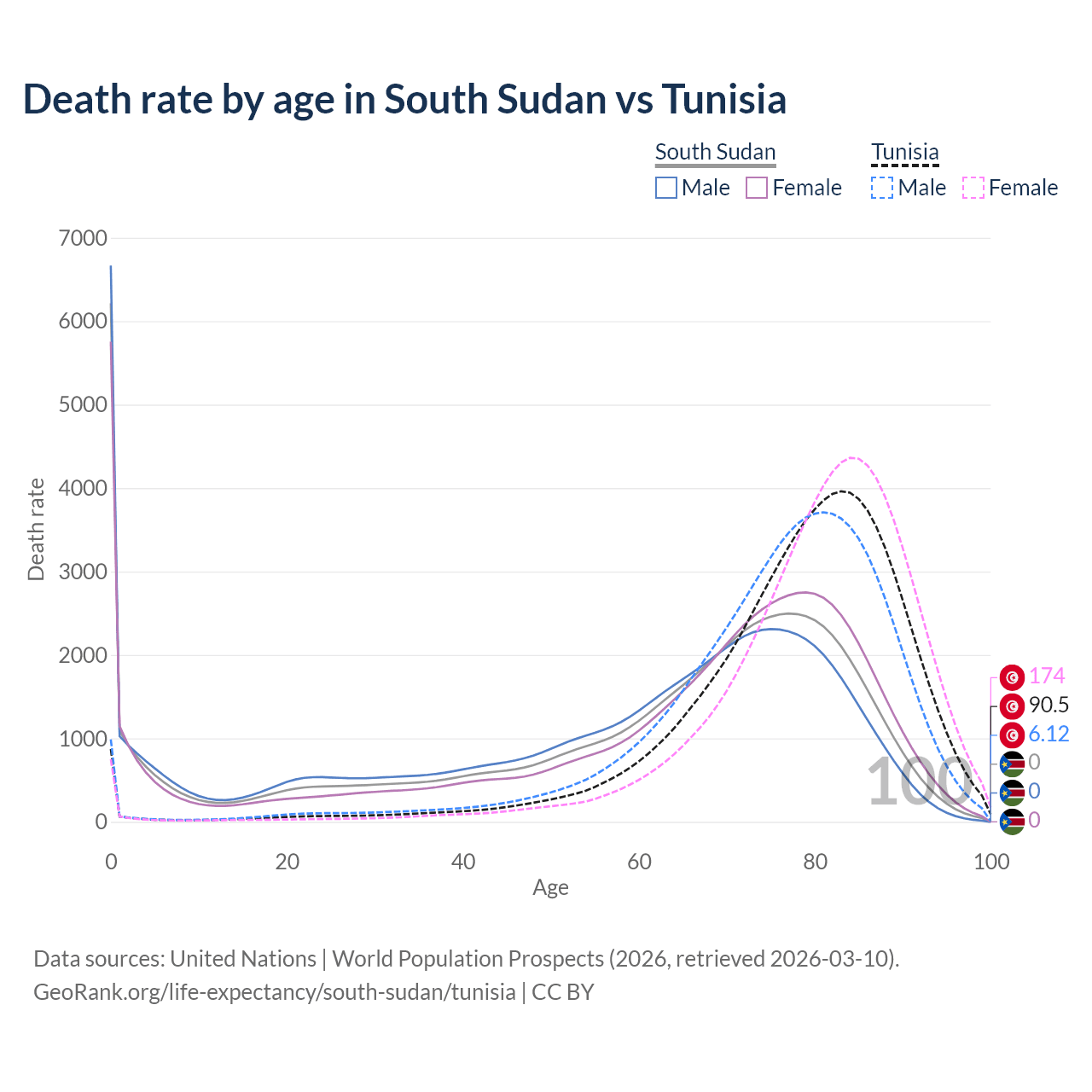 The average life expectancy at birth is 58 years in South Sudan vs 77.1 in Tunisia. South Sudan is ranked 195/197 by life expectancy, and Tunisia is 74/197. In South Sudan, the life expectancy is 55 years for males and 61 years for females. In Tunisia, it's 74.6 years for males and 79.7 years for females.