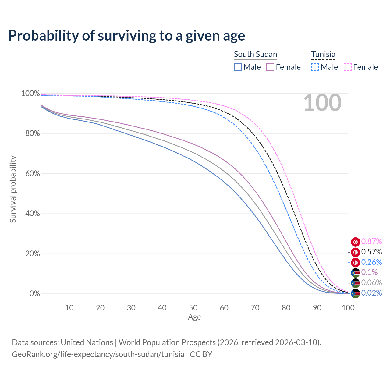 This life expectancy calculator shows the odds of living to 100, 95, 90, and below based on current age for both males and females in South Sudan and Tunisia, along with mean and median age of death. The calculations are based on the 2026 life tables (actuarial tables) from the UN World Population Prospects.