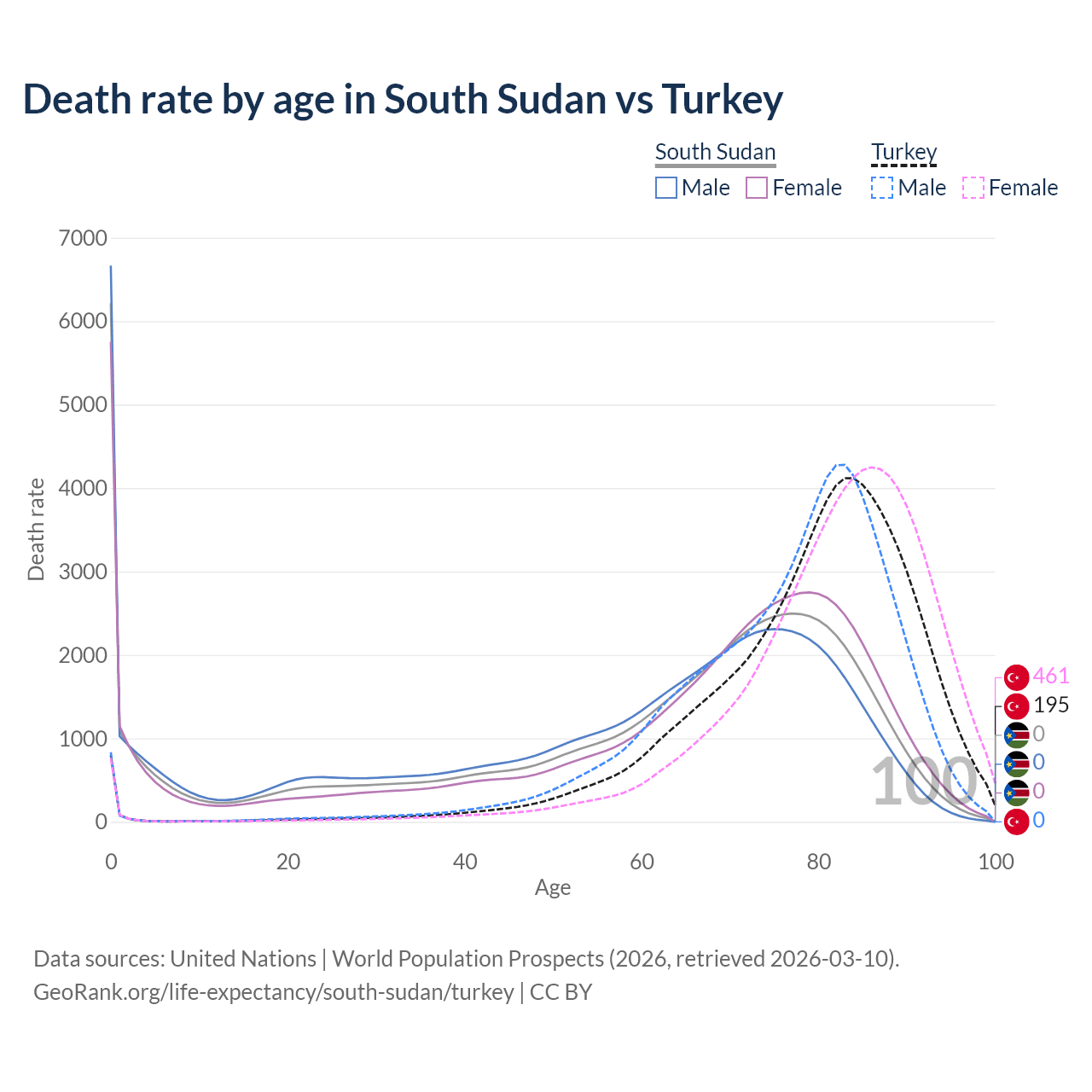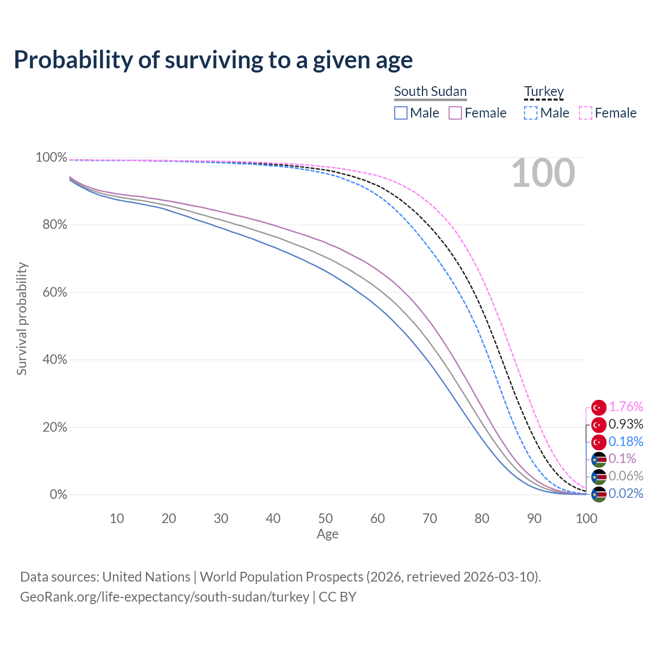 This life expectancy calculator shows the odds of living to 100, 95, 90, and below based on current age for both males and females in South Sudan and Turkey, along with mean and median age of death. The calculations are based on the 2026 life tables (actuarial tables) from the UN World Population Prospects.
