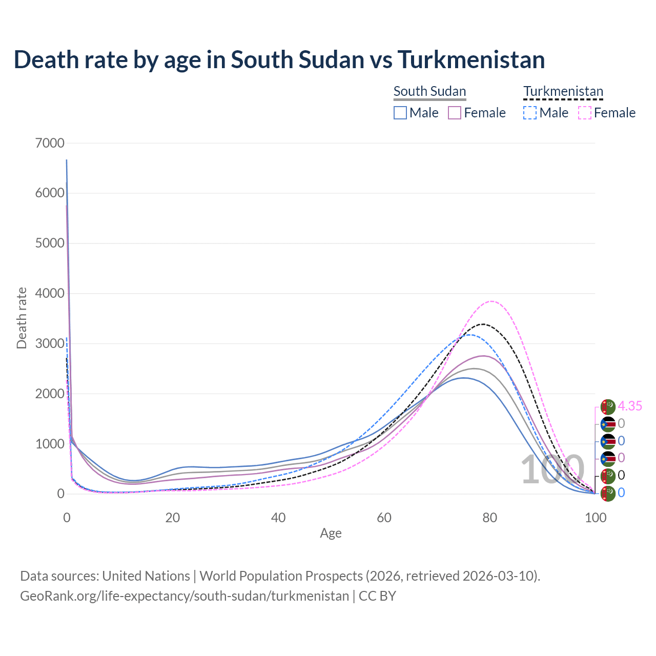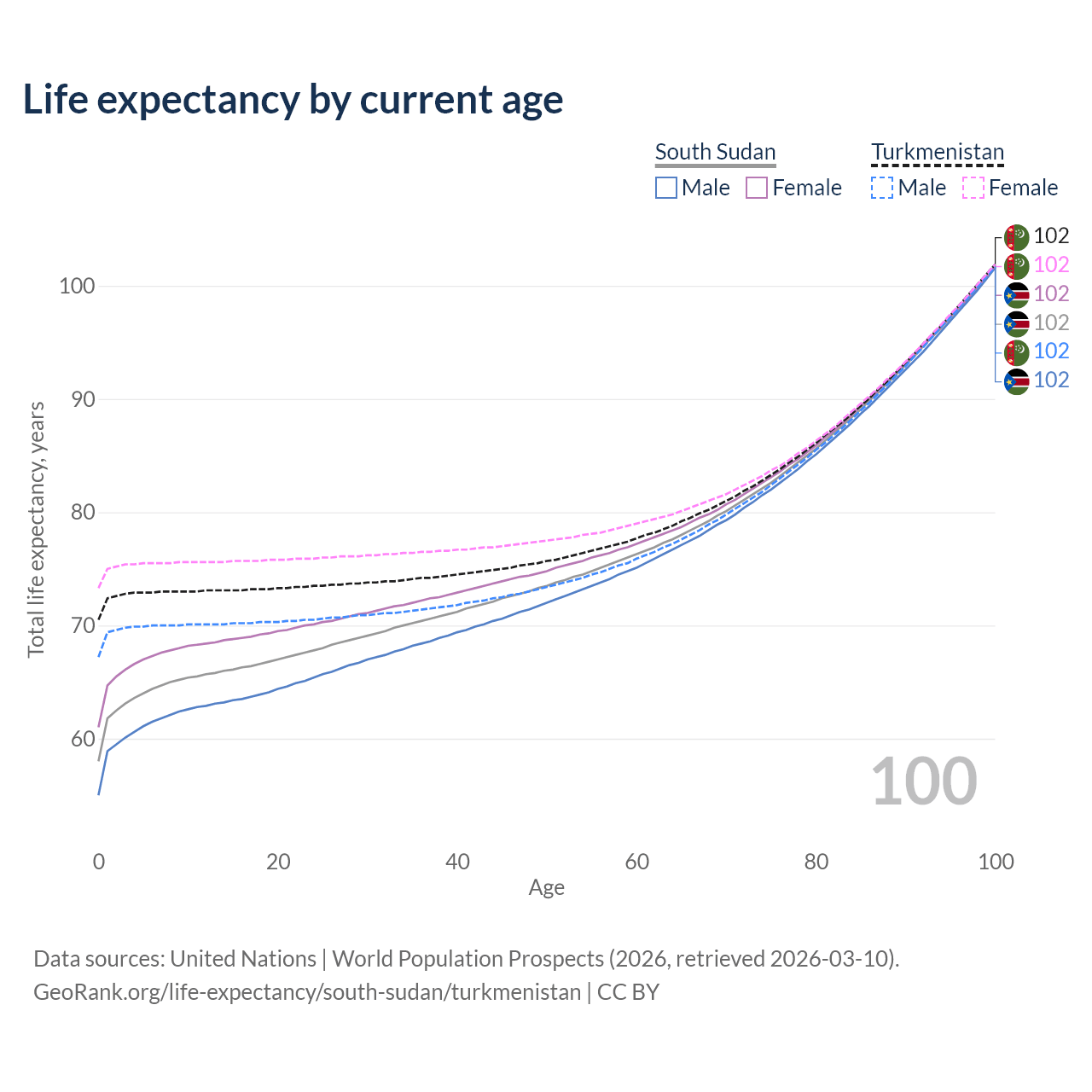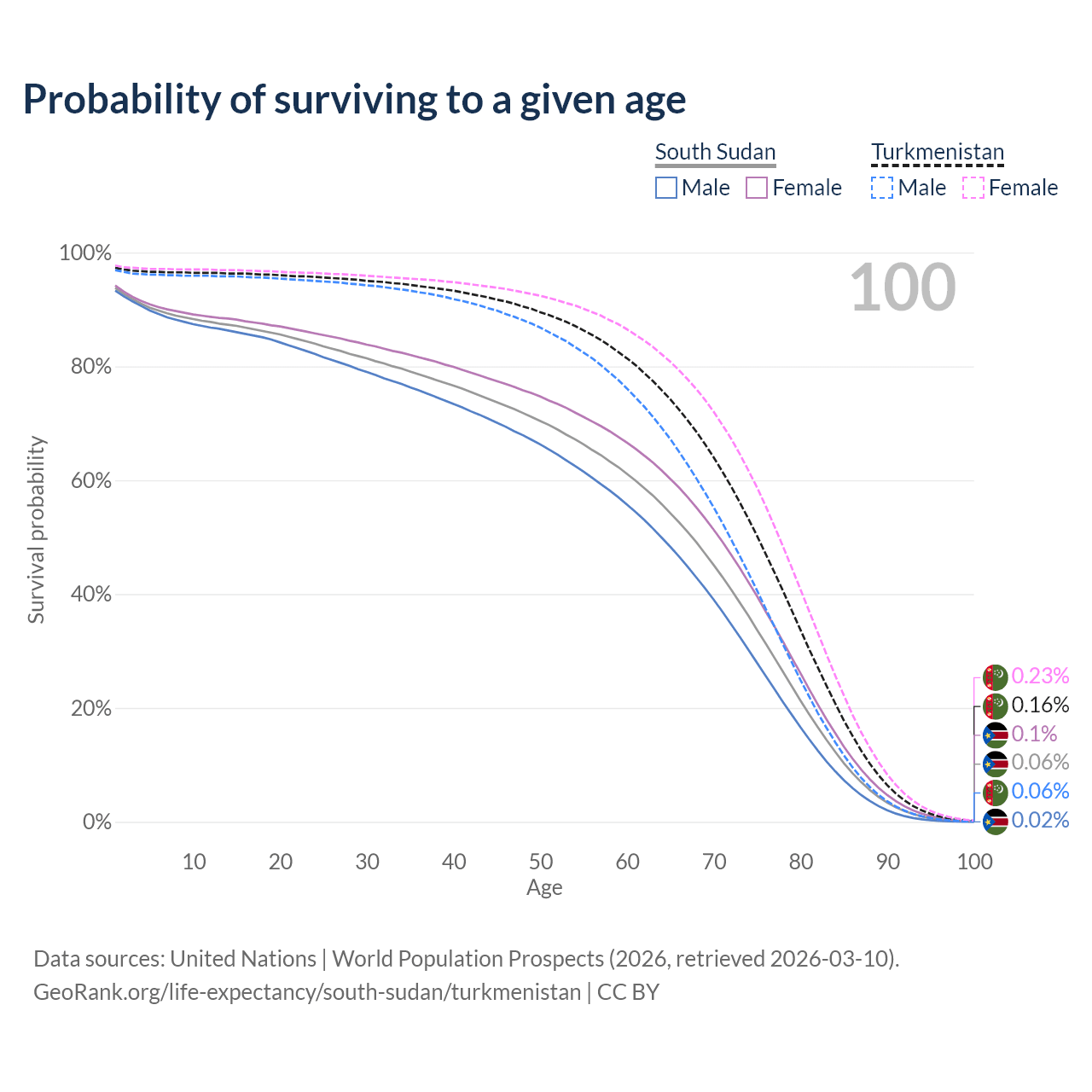 This life expectancy calculator shows the odds of living to 100, 95, 90, and below based on current age for both males and females in South Sudan and Turkmenistan, along with mean and median age of death. The calculations are based on the 2026 life tables (actuarial tables) from the UN World Population Prospects.