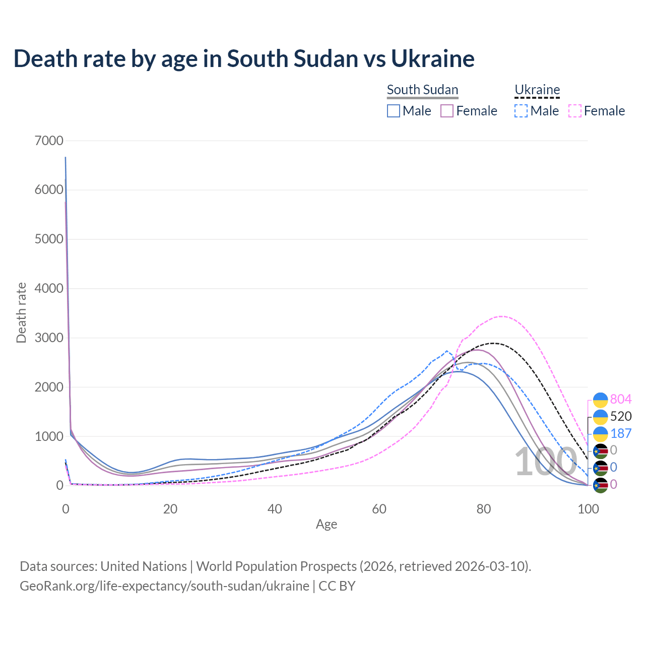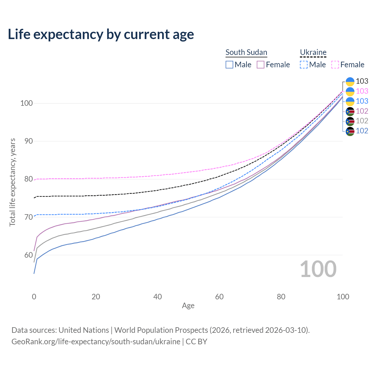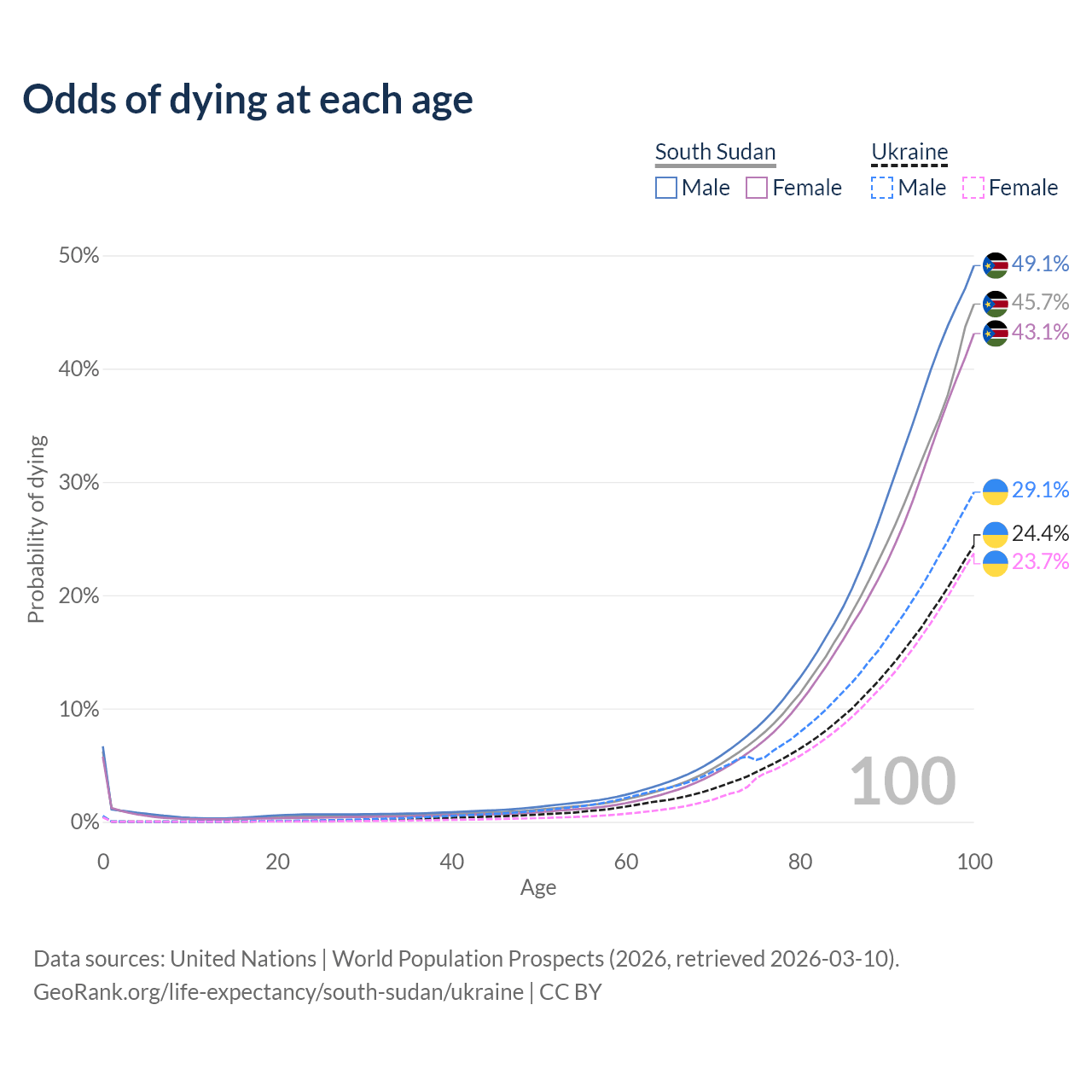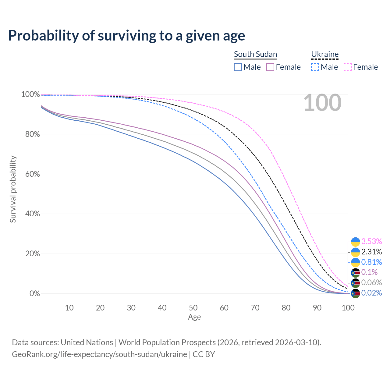 This life expectancy calculator shows the odds of living to 100, 95, 90, and below based on current age for both males and females in South Sudan and Ukraine, along with mean and median age of death. The calculations are based on the 2026 life tables (actuarial tables) from the UN World Population Prospects.