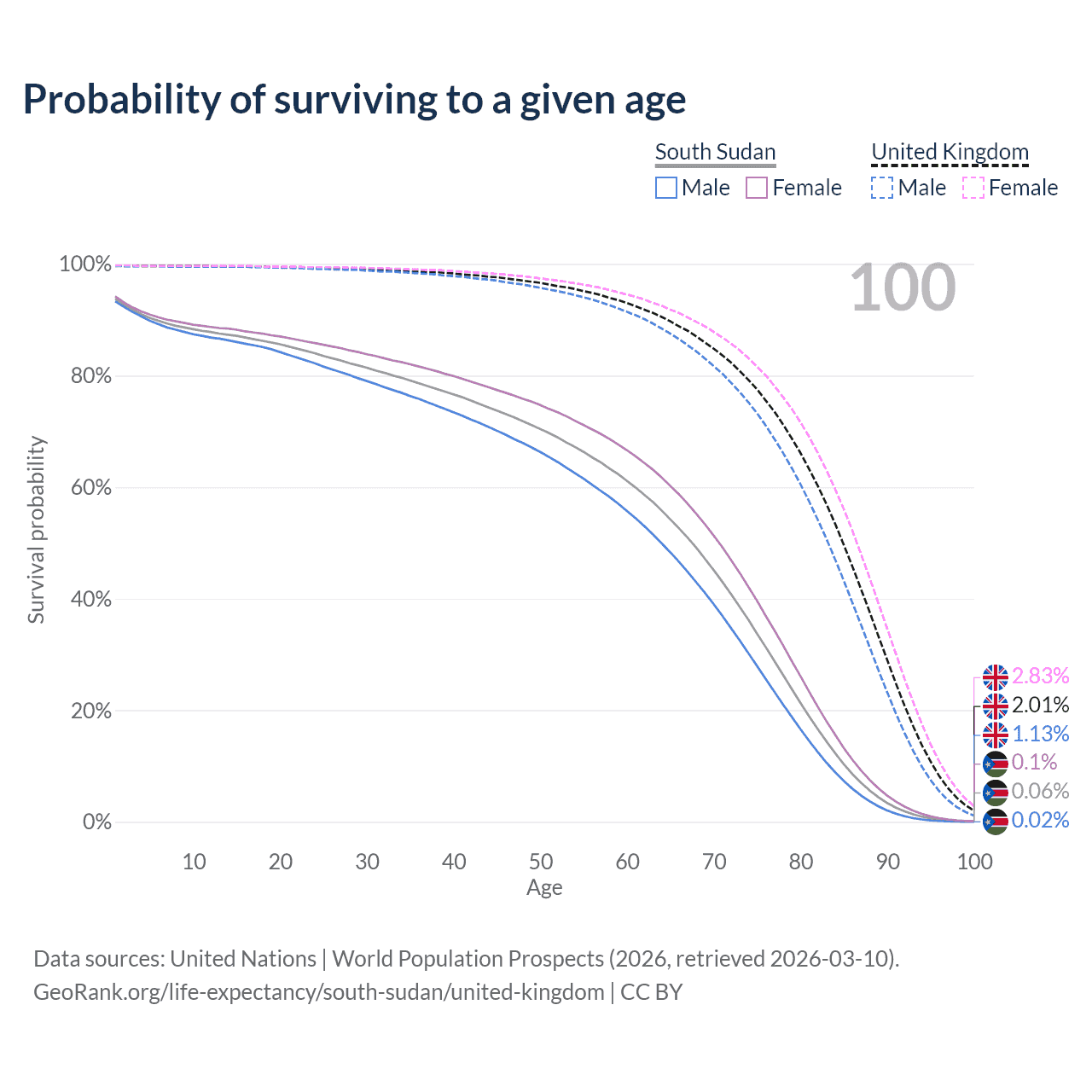 This life expectancy calculator shows the odds of living to 100, 95, 90, and below based on current age for both males and females in South Sudan and the United Kingdom, along with mean and median age of death. The calculations are based on the 2026 life tables (actuarial tables) from the UN World Population Prospects.