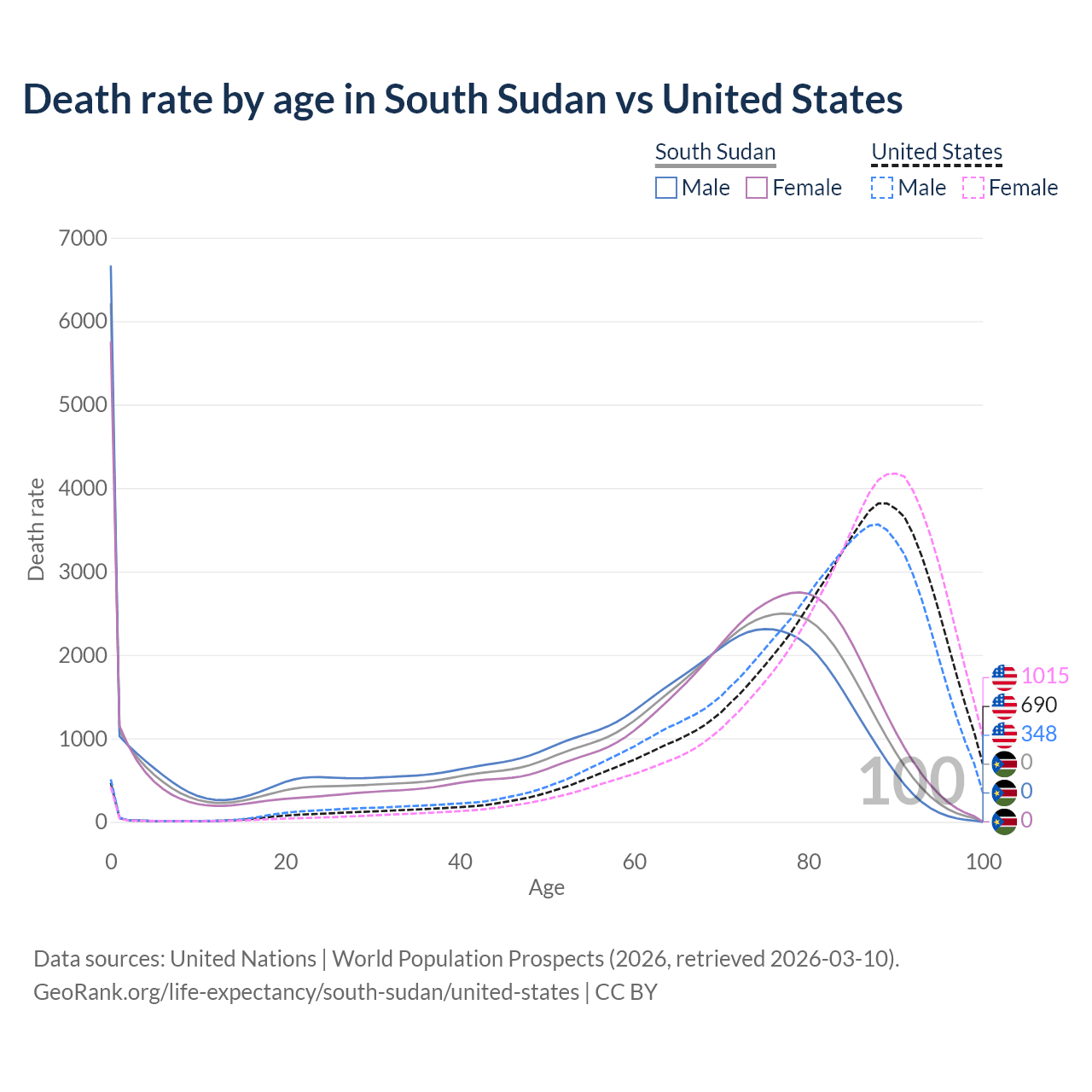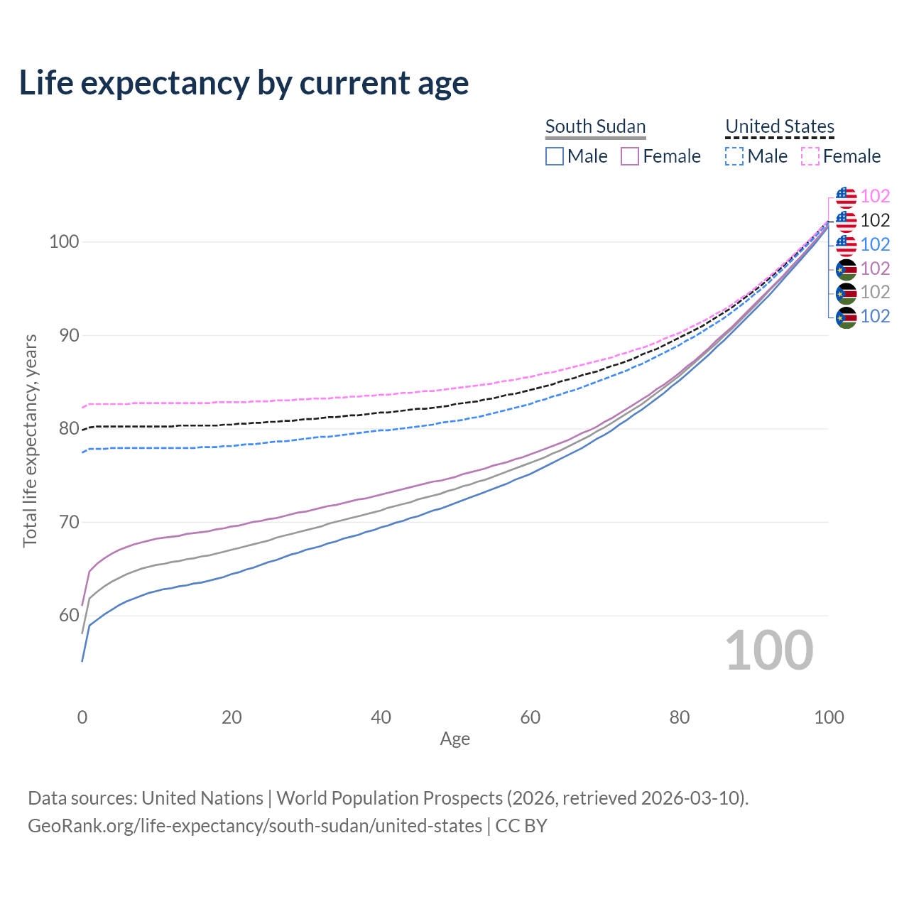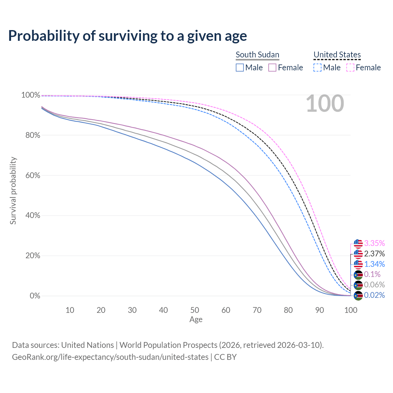 This life expectancy calculator shows the odds of living to 100, 95, 90, and below based on current age for both males and females in South Sudan and the United States, along with mean and median age of death. The calculations are based on the 2026 life tables (actuarial tables) from the UN World Population Prospects.