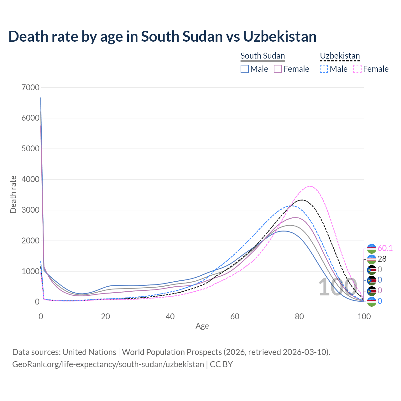 The average life expectancy at birth is 58 years in South Sudan vs 72.8 in Uzbekistan. South Sudan is ranked 195/197 by life expectancy, and Uzbekistan is 115/197. In South Sudan, the life expectancy is 55 years for males and 61 years for females. In Uzbekistan, it's 69.8 years for males and 75.8 years for females.